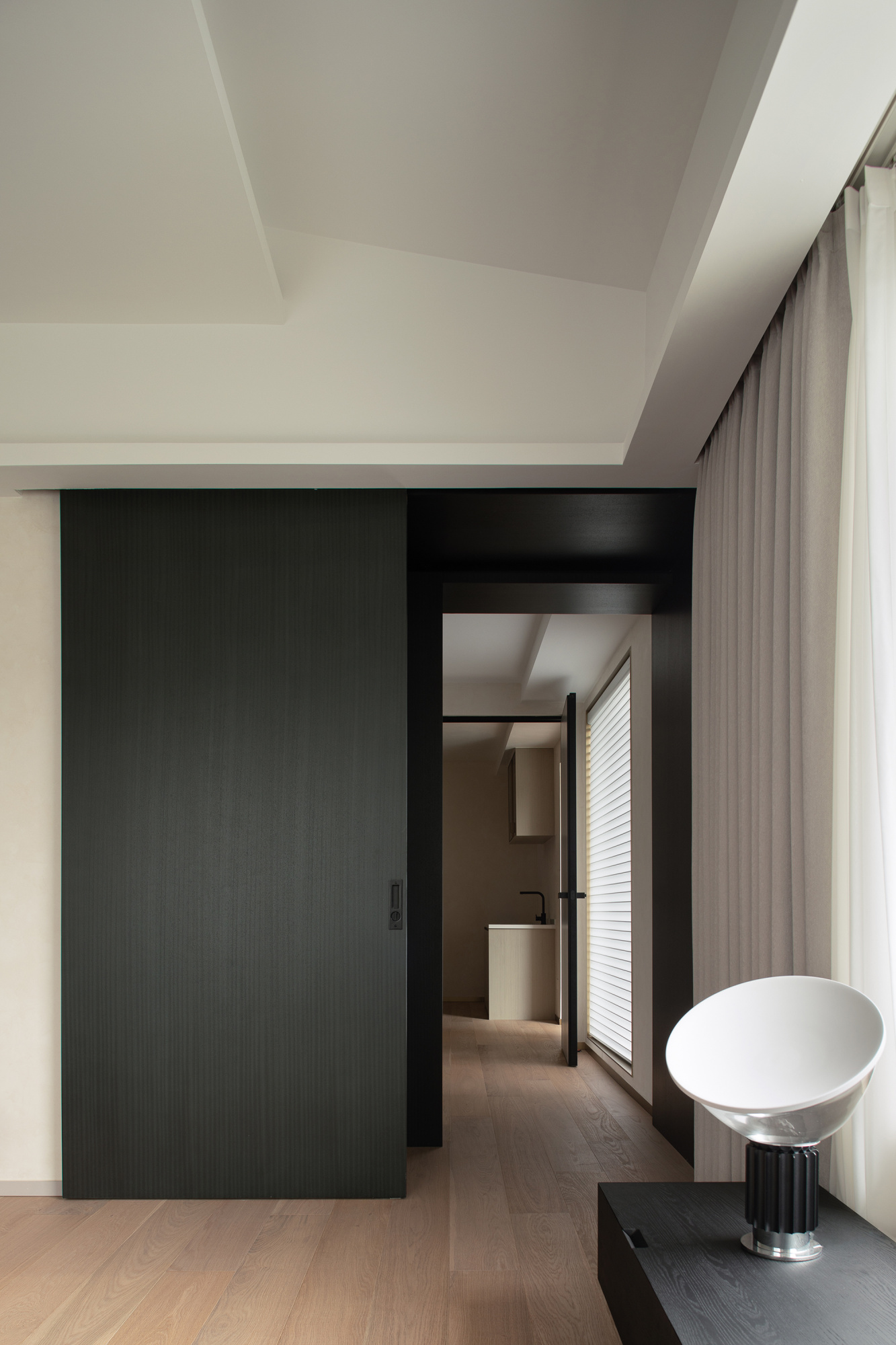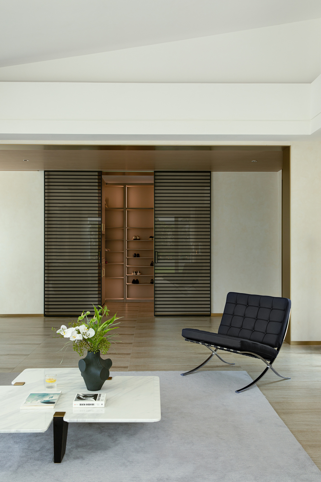 入户区域增加步入式衣帽收纳区,充分体现了设计团队对生活的细致考量和对人的关怀,及时有效的收纳归家的衣服鞋帽和零碎物品,让简约的空间更易于整理。金属格栅移门为空间增加了一丝质朴而又复古的韵味。