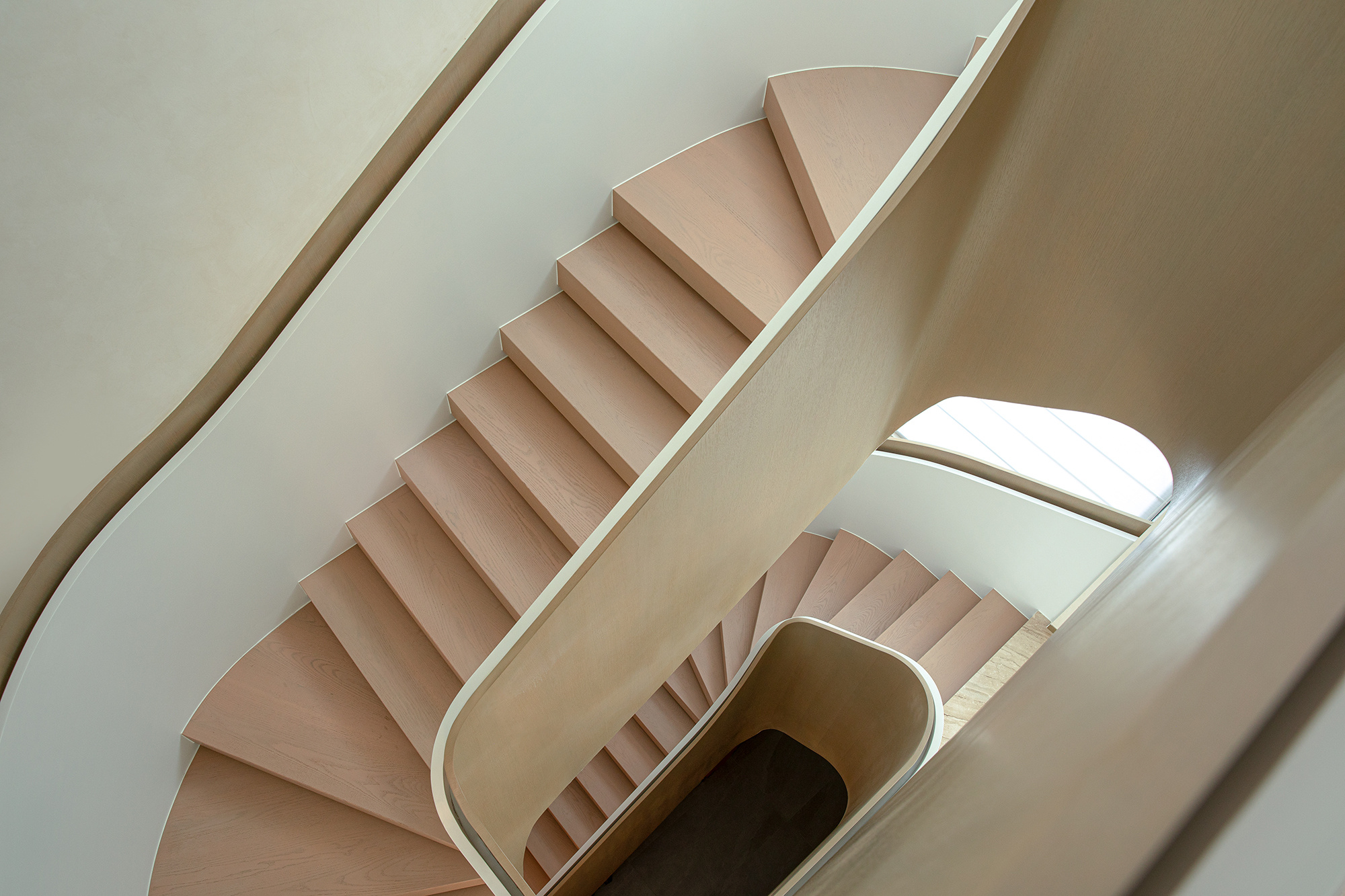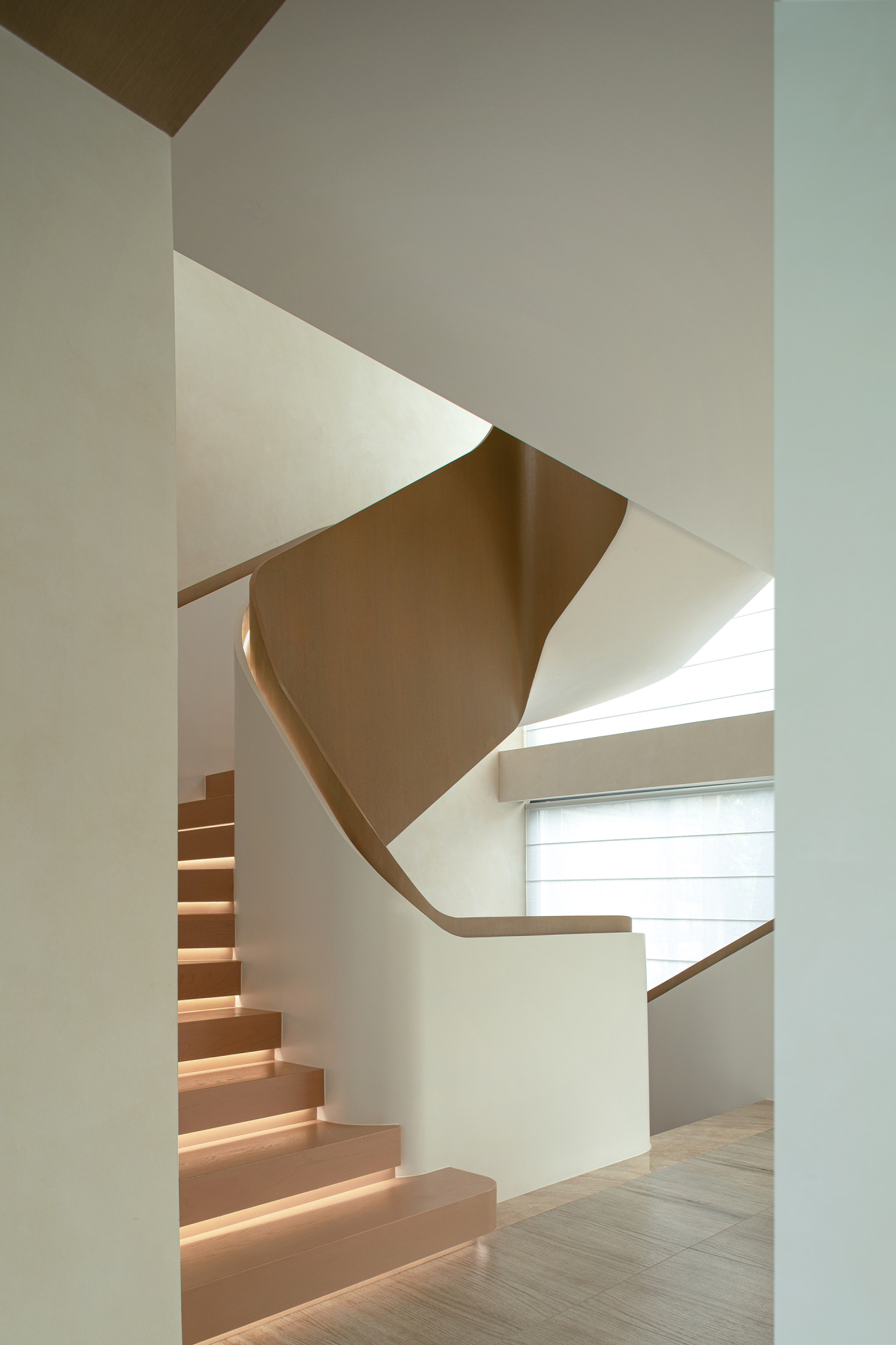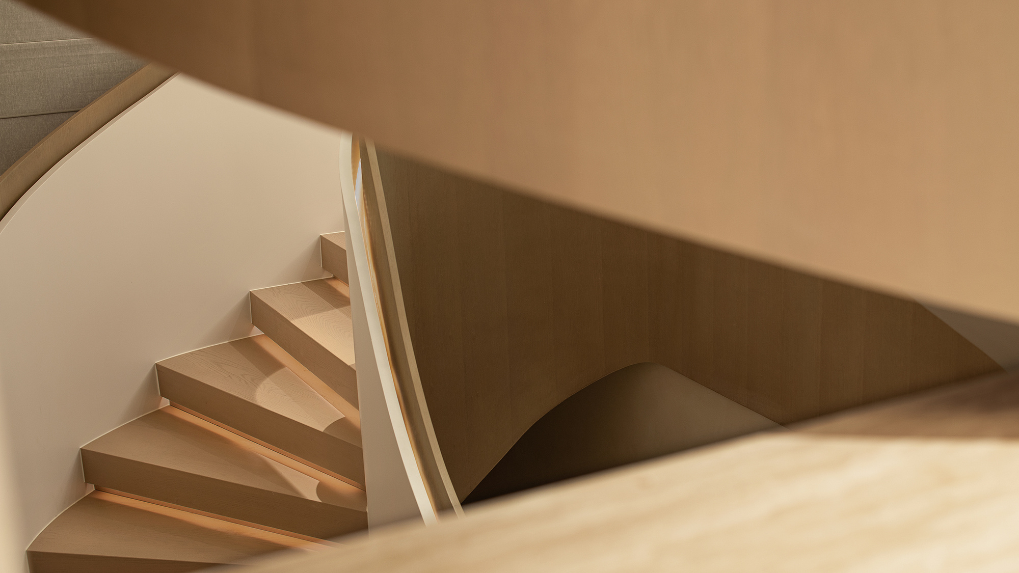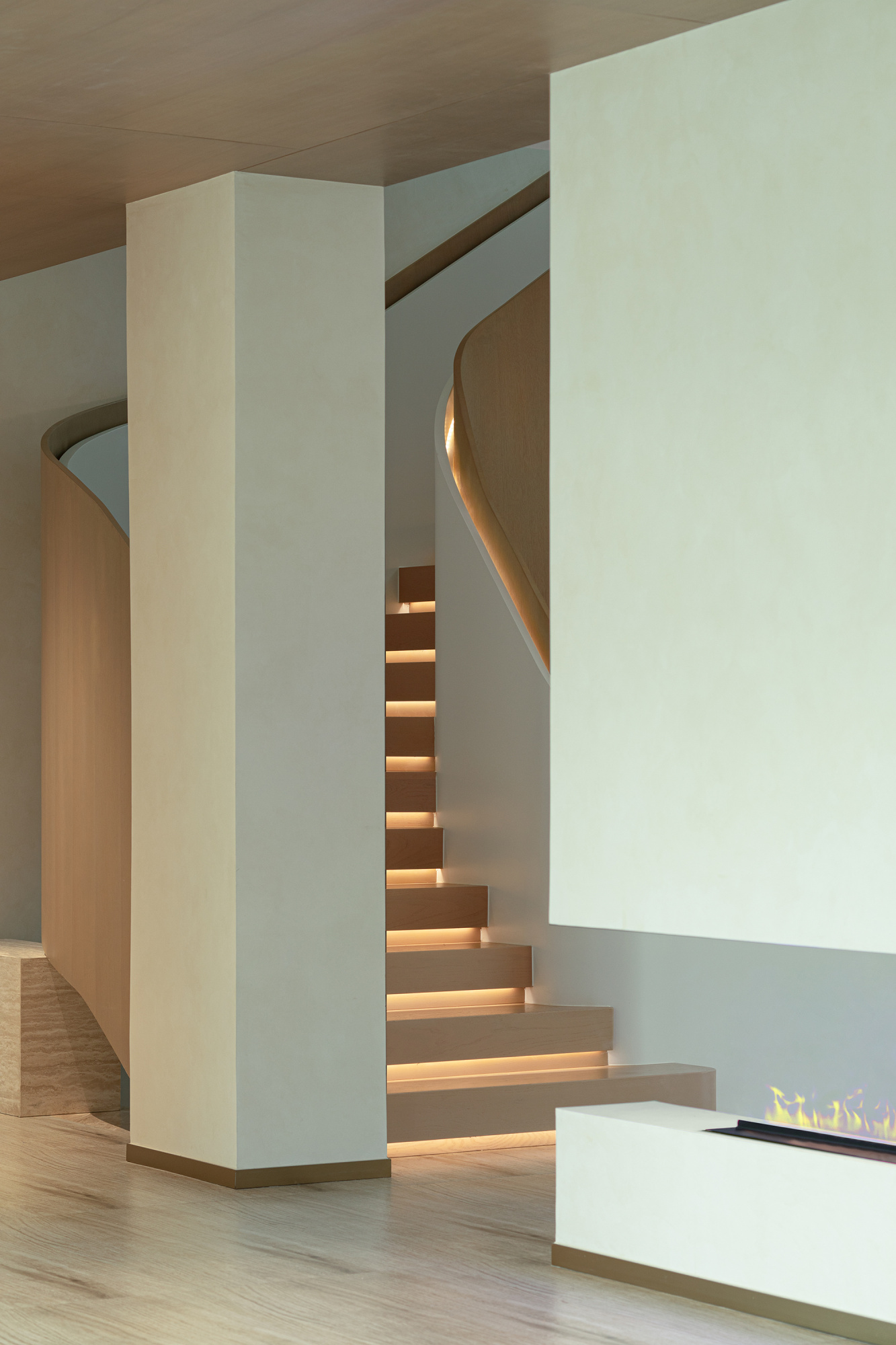 楼梯以白色和木色为主诠释自然感,简洁利落,线条灵动,用一种开放的姿态邀请人穿梭于空间中,增强了空间的流动感和家人间的情感交流。