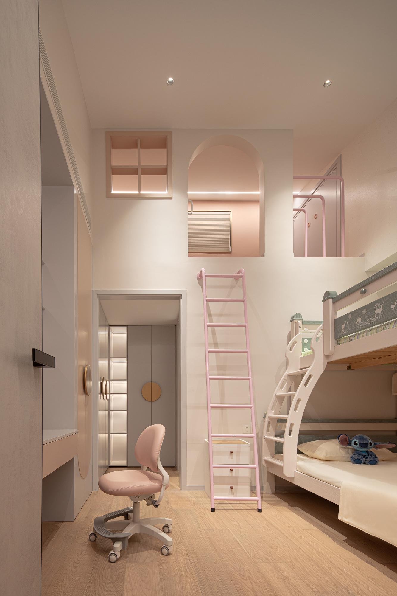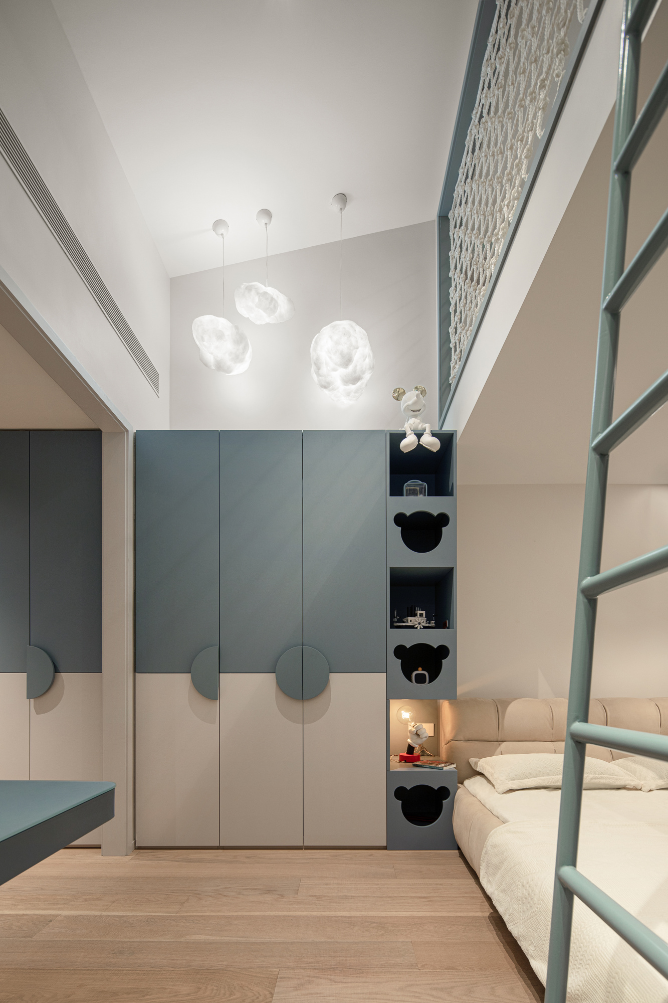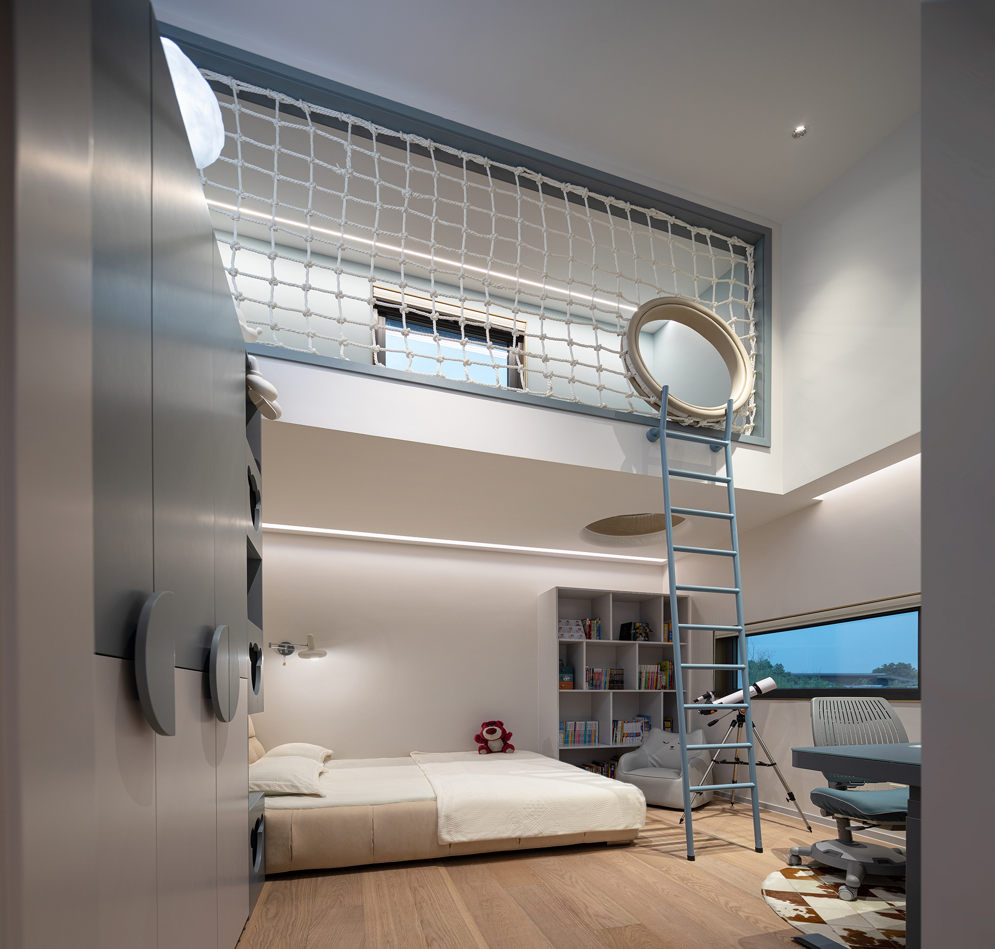 设计师利用屋面的高度打造了两个充满趣味的儿童空间,尊重孩子的个体发展,促进情感交流,满足他们的游戏需求,是整个儿童区域设计的核心点。每一个卧室内都藏着树屋一样的秘密阁楼,两个卧室由通道相连,整个区域就像是一个超大的游乐场,充满童趣,孩子们可以到处乱跑、捉迷藏、上下攀爬,自由、轻快、无拘无束。