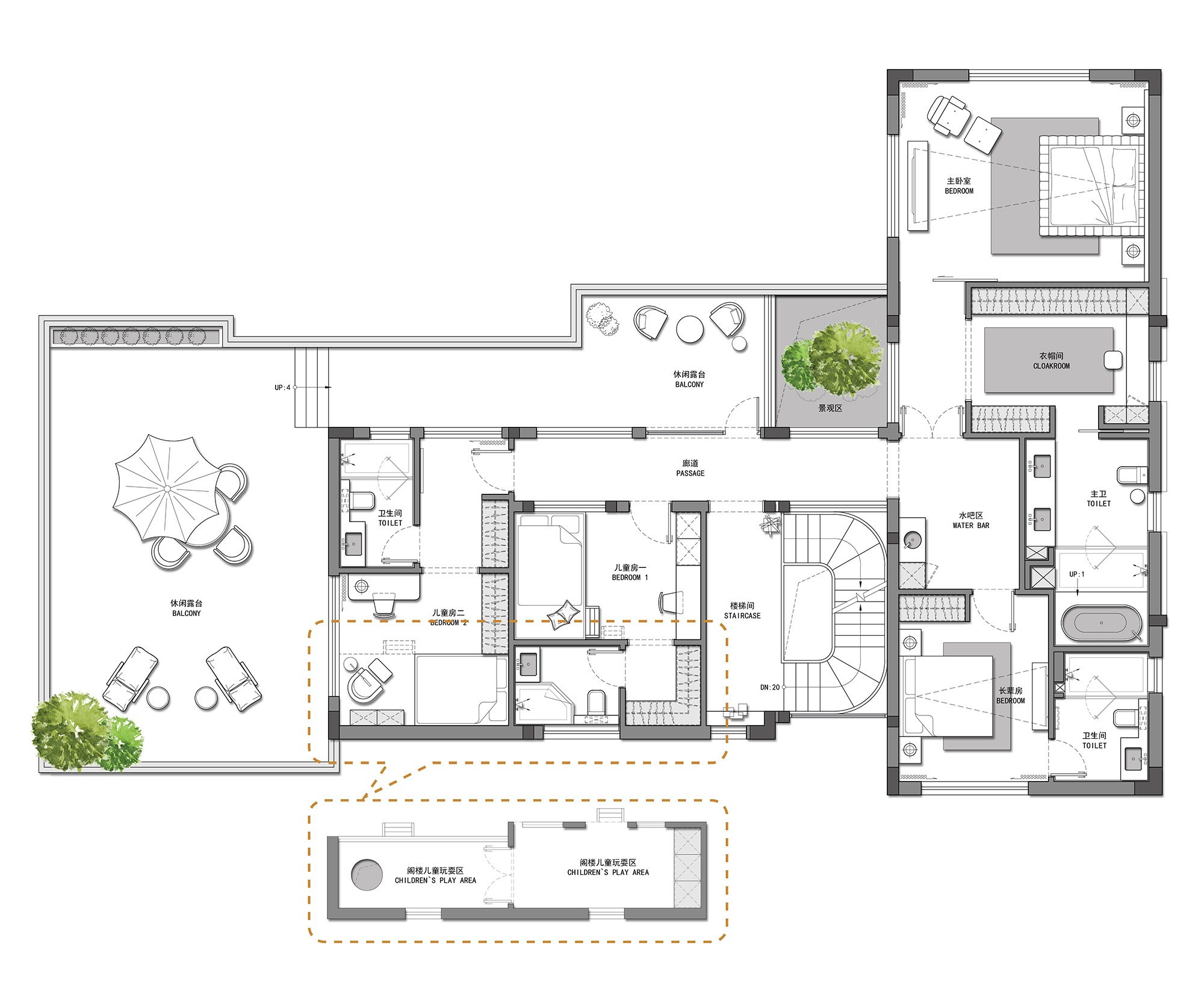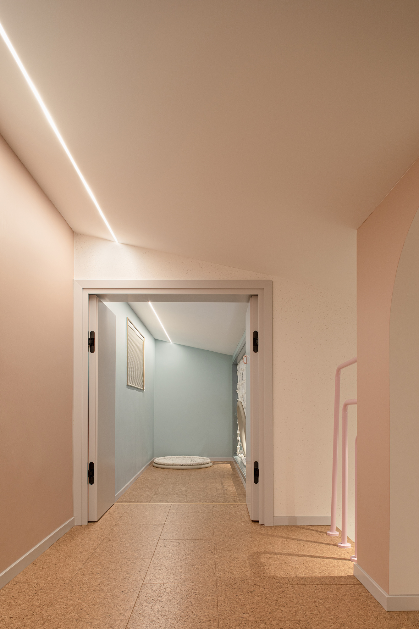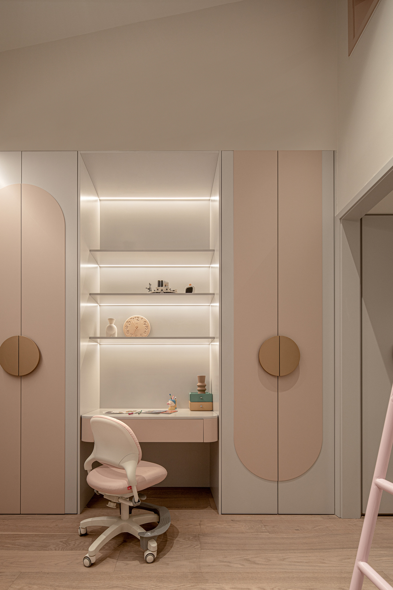设计师利用屋面的高度打造了两个充满趣味的儿童空间,尊重孩子的个体发展,促进情感交流,满足他们的游戏需求,是整个儿童区域设计的核心点。每一个卧室内都藏着树屋一样的秘密阁楼,两个卧室由通道相连,整个区域就像是一个超大的游乐场,充满童趣,孩子们可以到处乱跑、捉迷藏、上下攀爬,自由、轻快、无拘无束。