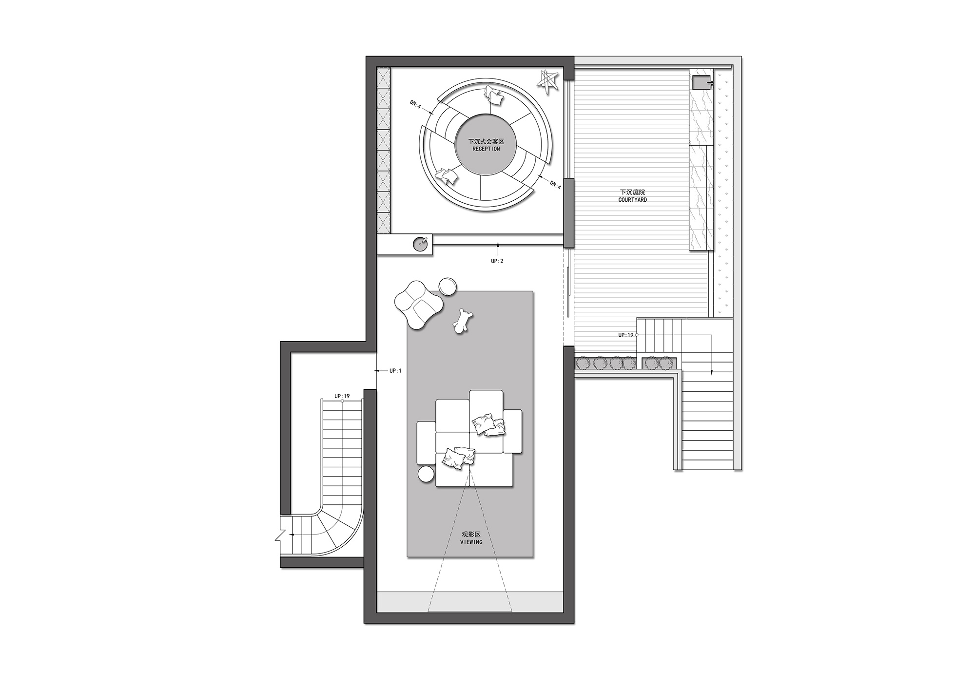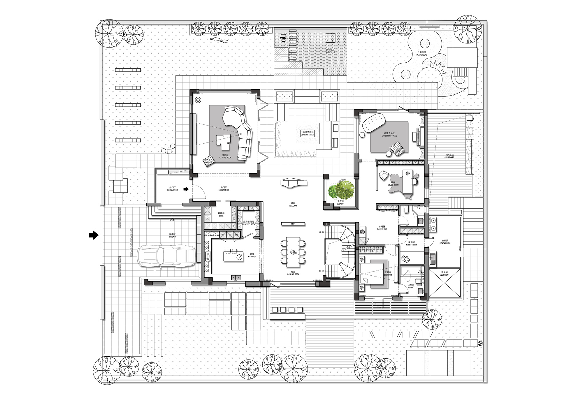 一层公共空间,以“更好的享受自然生活”为核心,将空间打散重组,使整个归家的动线更为流畅,尺度宽松。将多余的墙体打开,空间向外拓展,让入户轴线更加敞亮,顶面也成为了二层的户外露台。