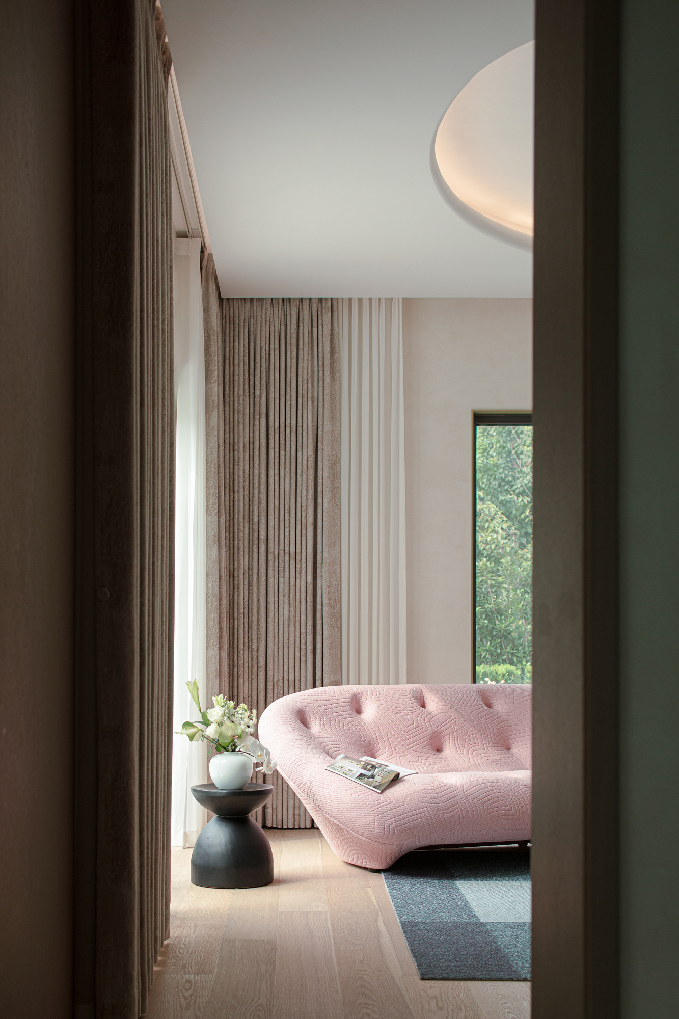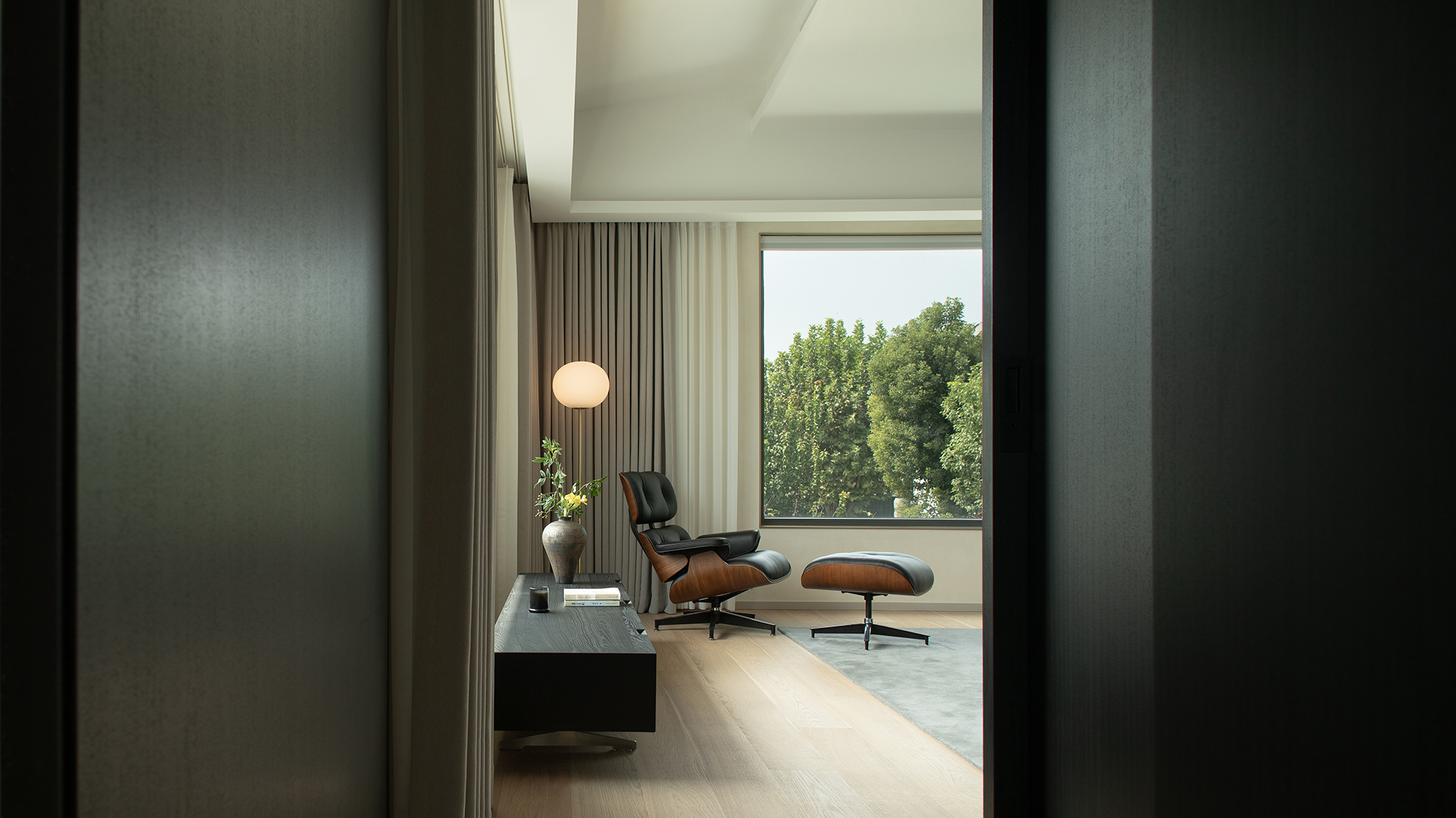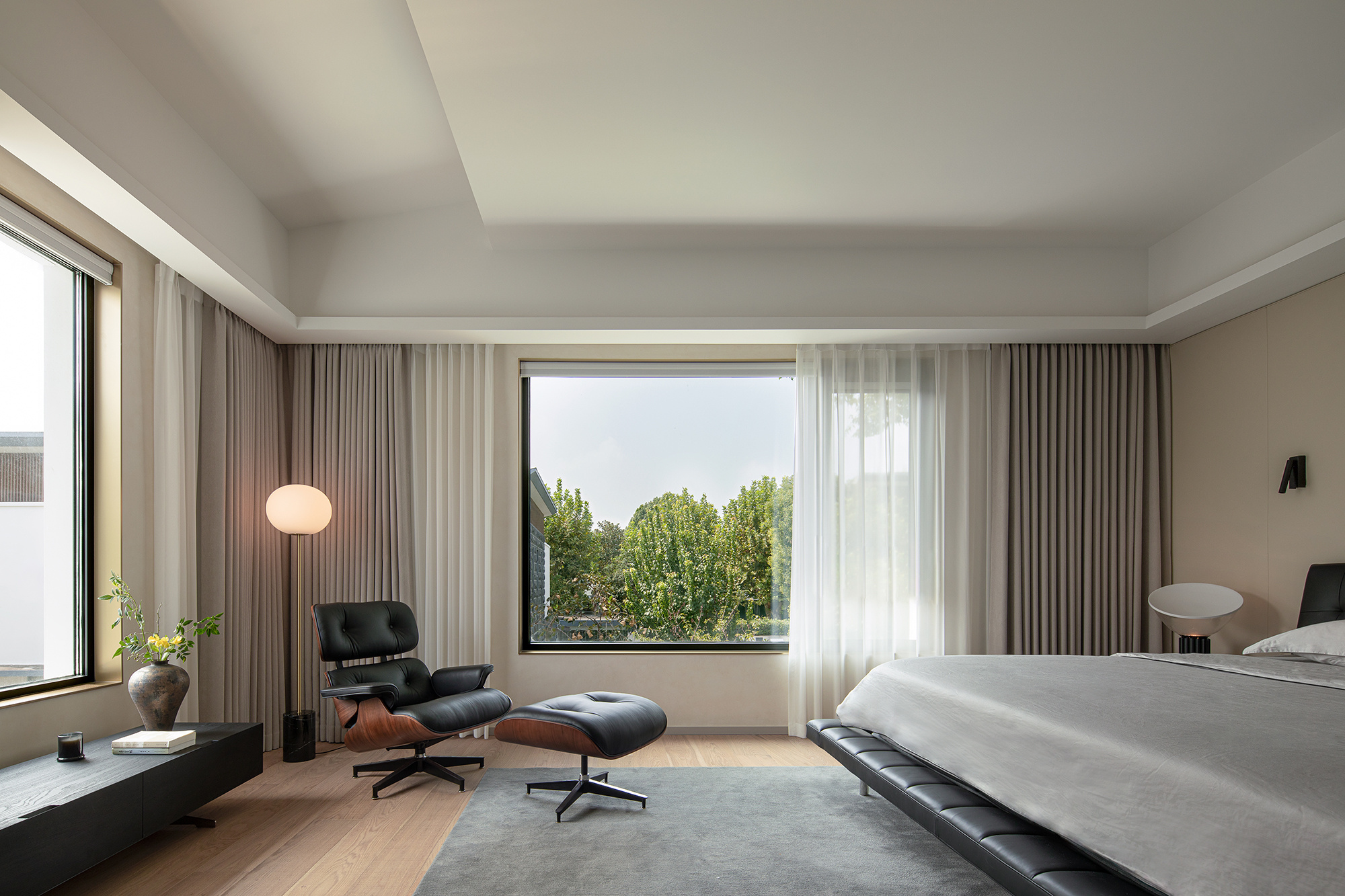 从窗口向外望去,世界一片空明,树梢的绿意鲜嫩可爱,地上落了些尚未打扫的树叶,穿过一片树顶,是更远的天空。回望眼前,亲密的卧室里,身体参与每一处空间的感受,皮质光滑,纱帘轻柔,地毯温暖,一盏灯就可以安定人心。在这里,需要放下全部,用身体、情感和心灵去“观看”,才能真正获得独属于自我的时刻。