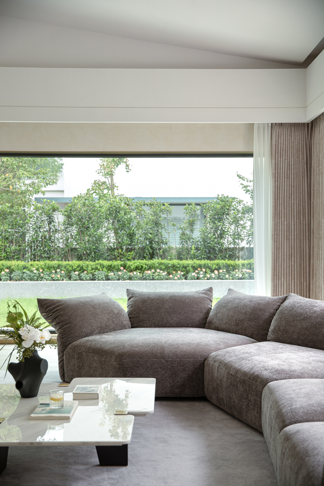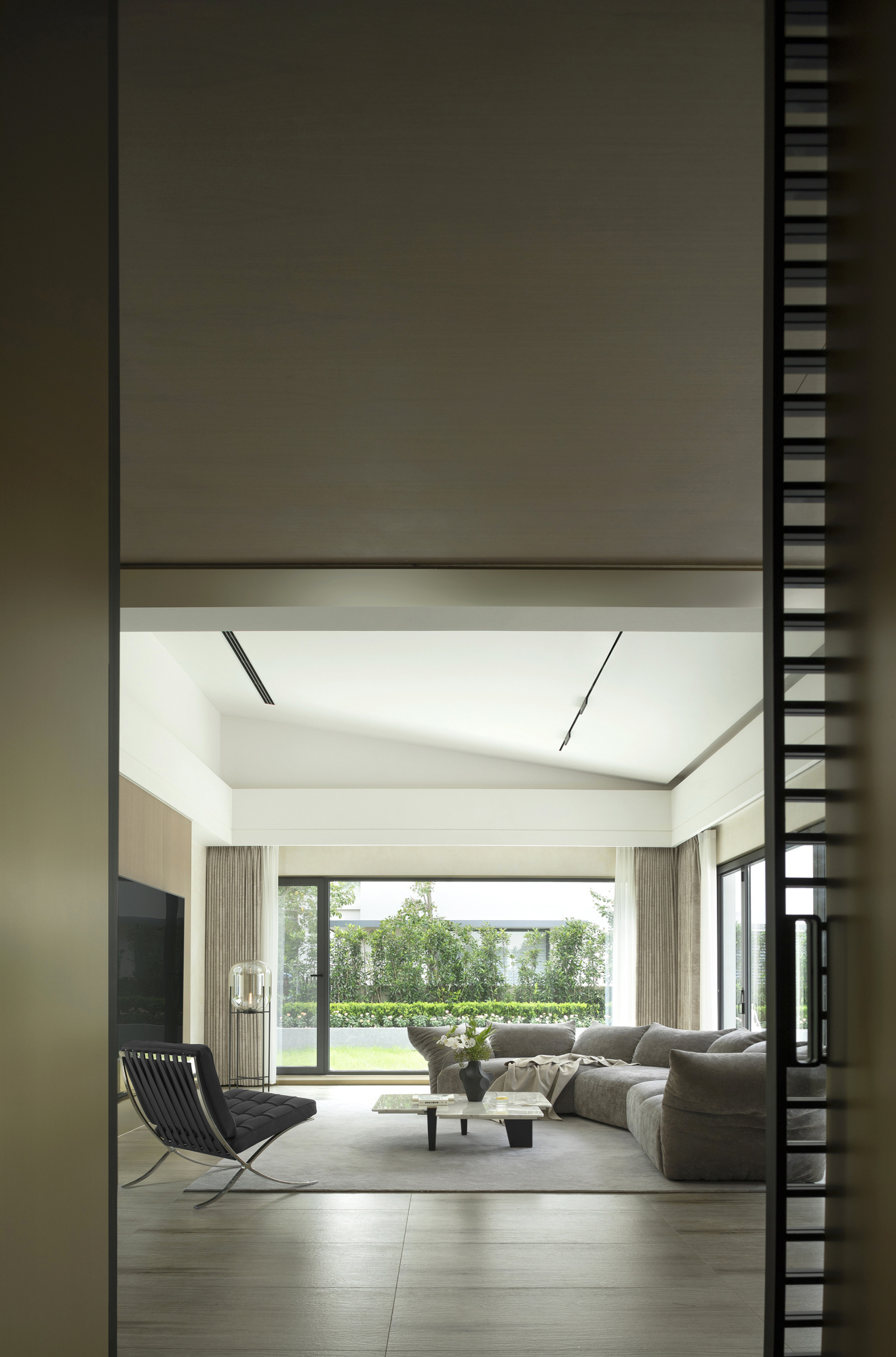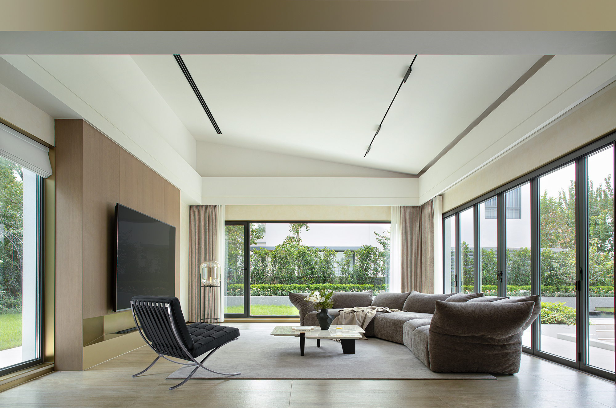 为了让居住者享受这种敞开胸襟四野无边的感受,整个客厅区域只以一组柔软的沙发围合出一个公共交流的区域,在这里找到一个最舒服的姿态,或与家人闲谈,或是独自阅读喝杯咖啡,都充满了恬静的感觉。