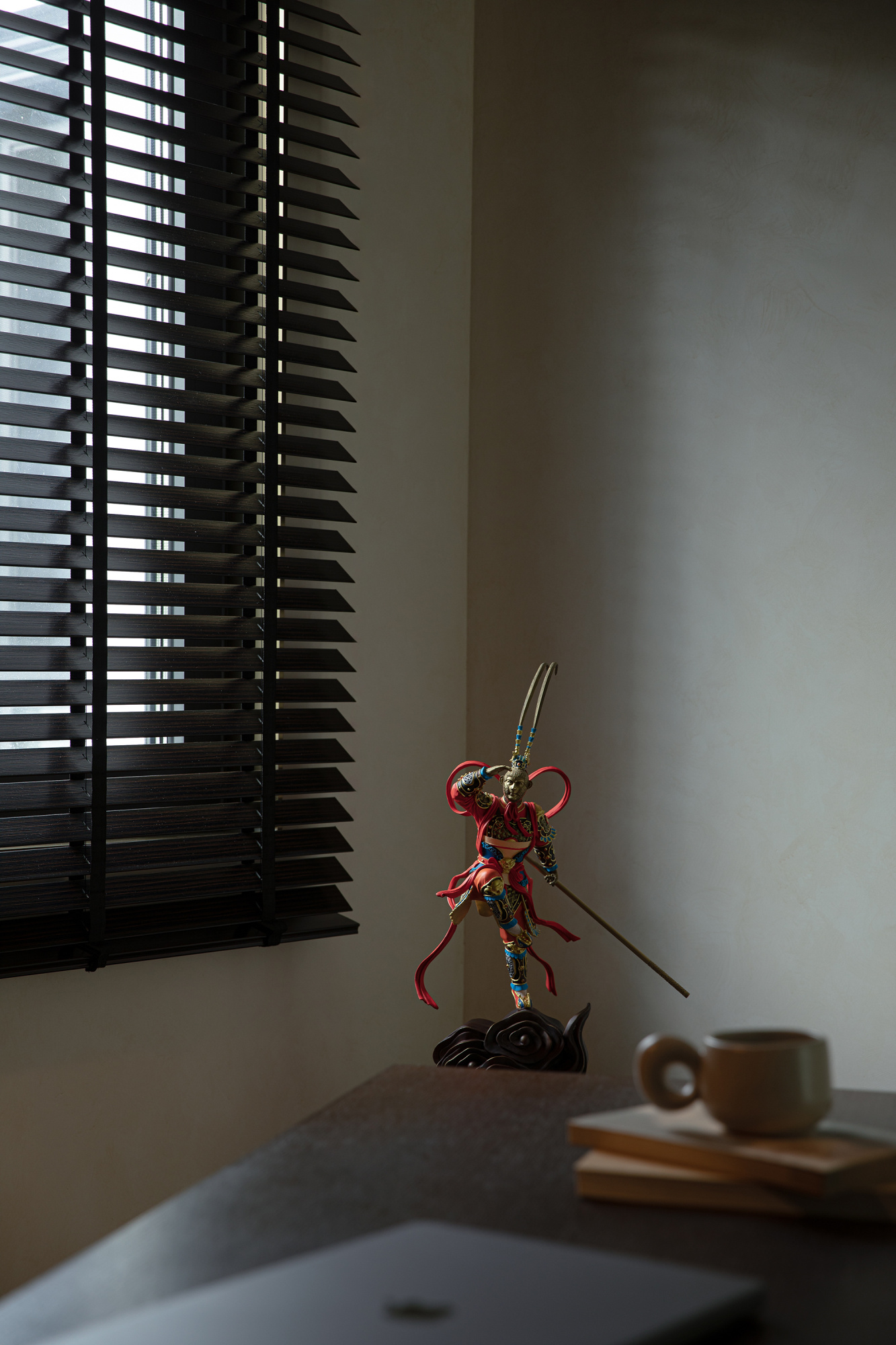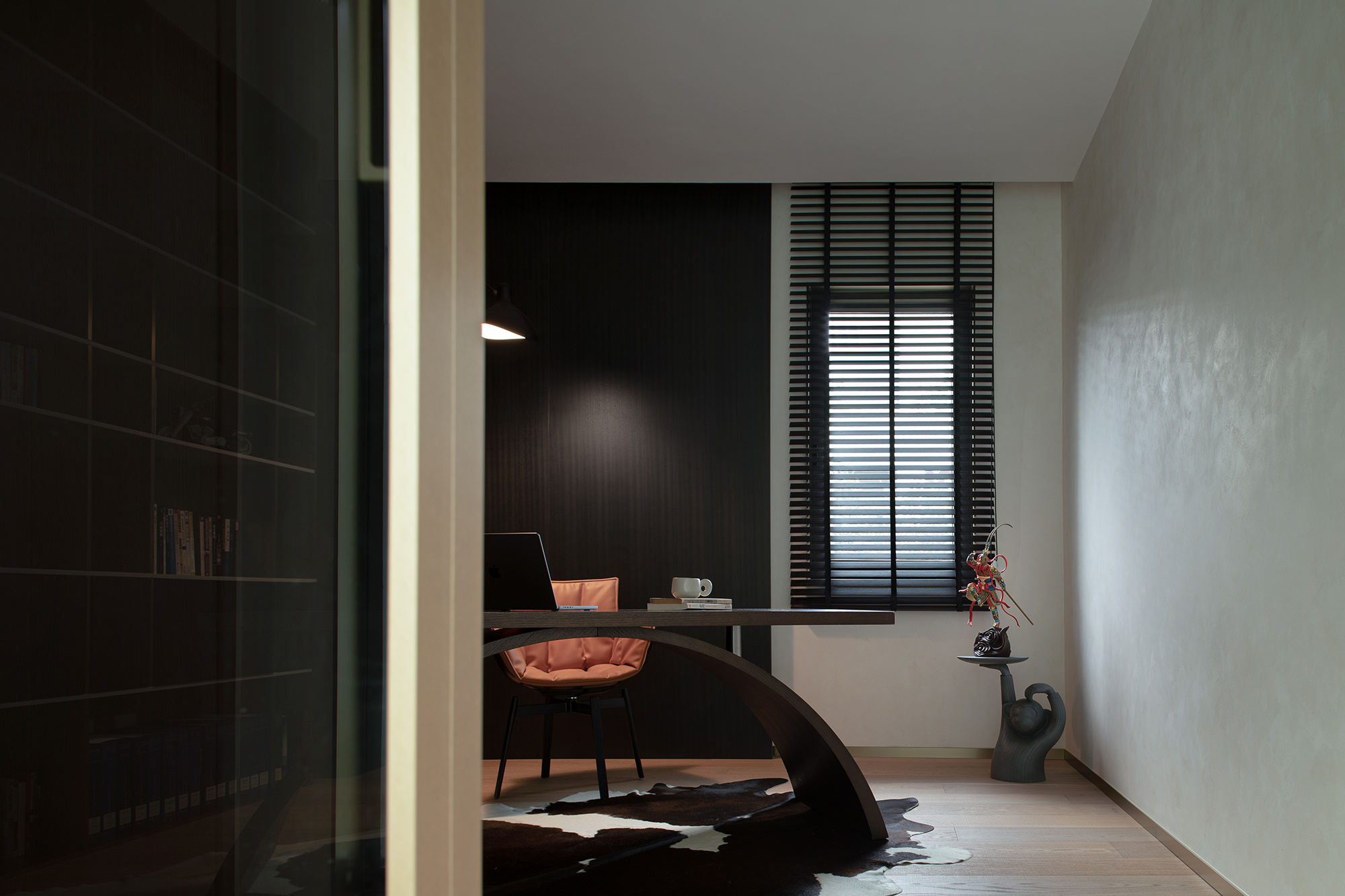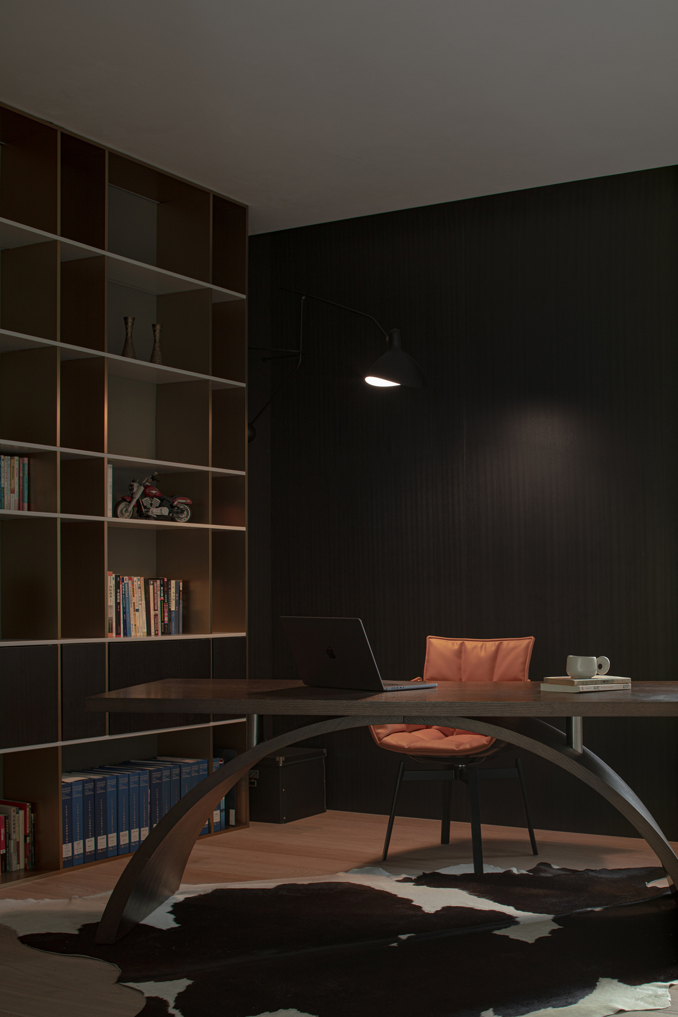 为了尽可能多的在工作之余抽出时间陪伴孩子,男主人的书房设置在家庭室旁,由主人酷爱的黑色为主基调,书桌再利用了旧家具,气质沉稳内敛。