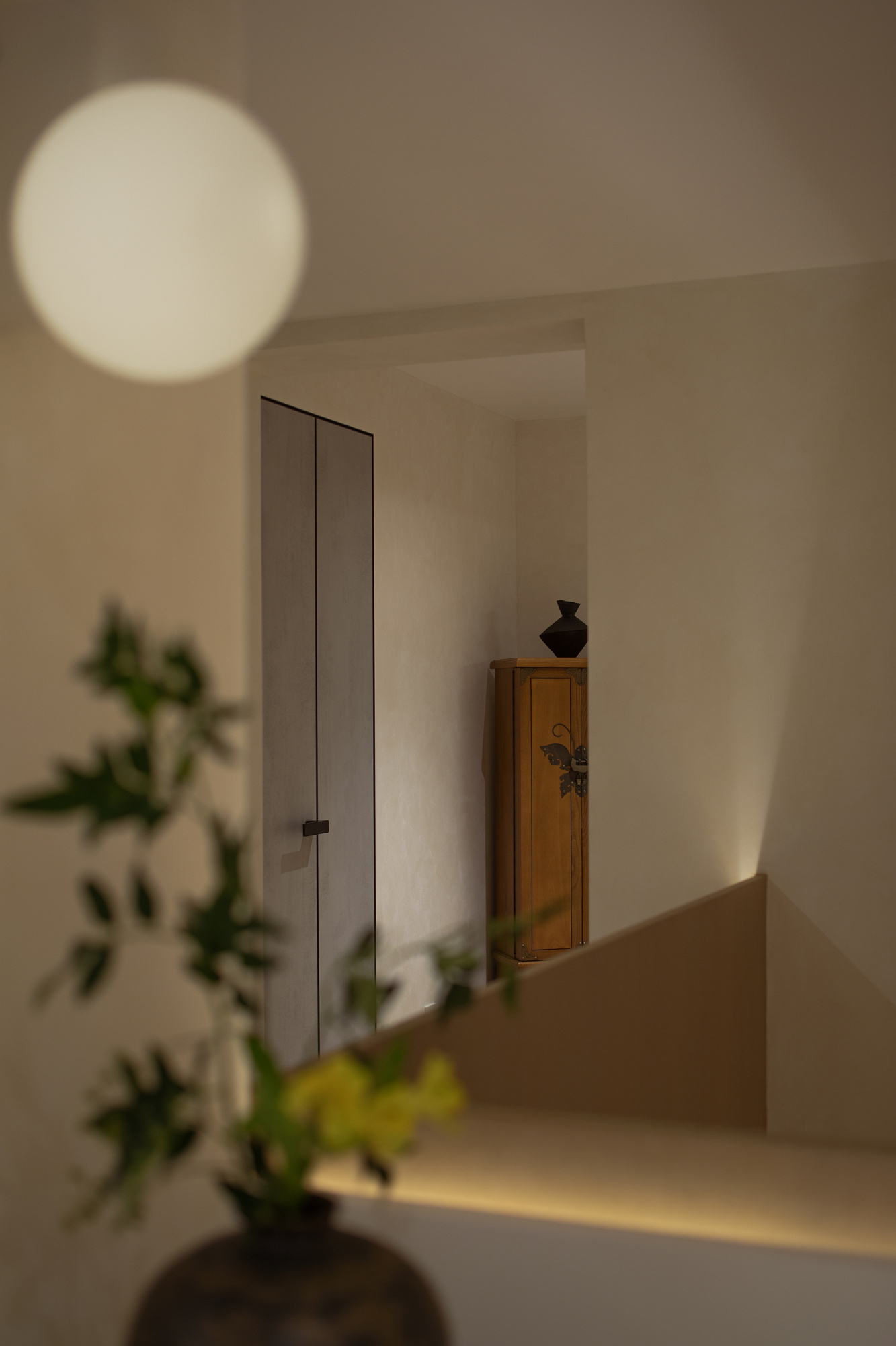 通过将原建筑楼梯狭小的空间释放出来,转变楼梯朝向,改变厨房位置,因此有了一个尺度开阔、轻松惬意的餐厨区,以悬浮墙体,让餐厨区与过道进行半遮挡,既强调了空间的边界,又让人用餐时拥有围合感,壁炉里跳动的火苗用温度为空间增添美好。