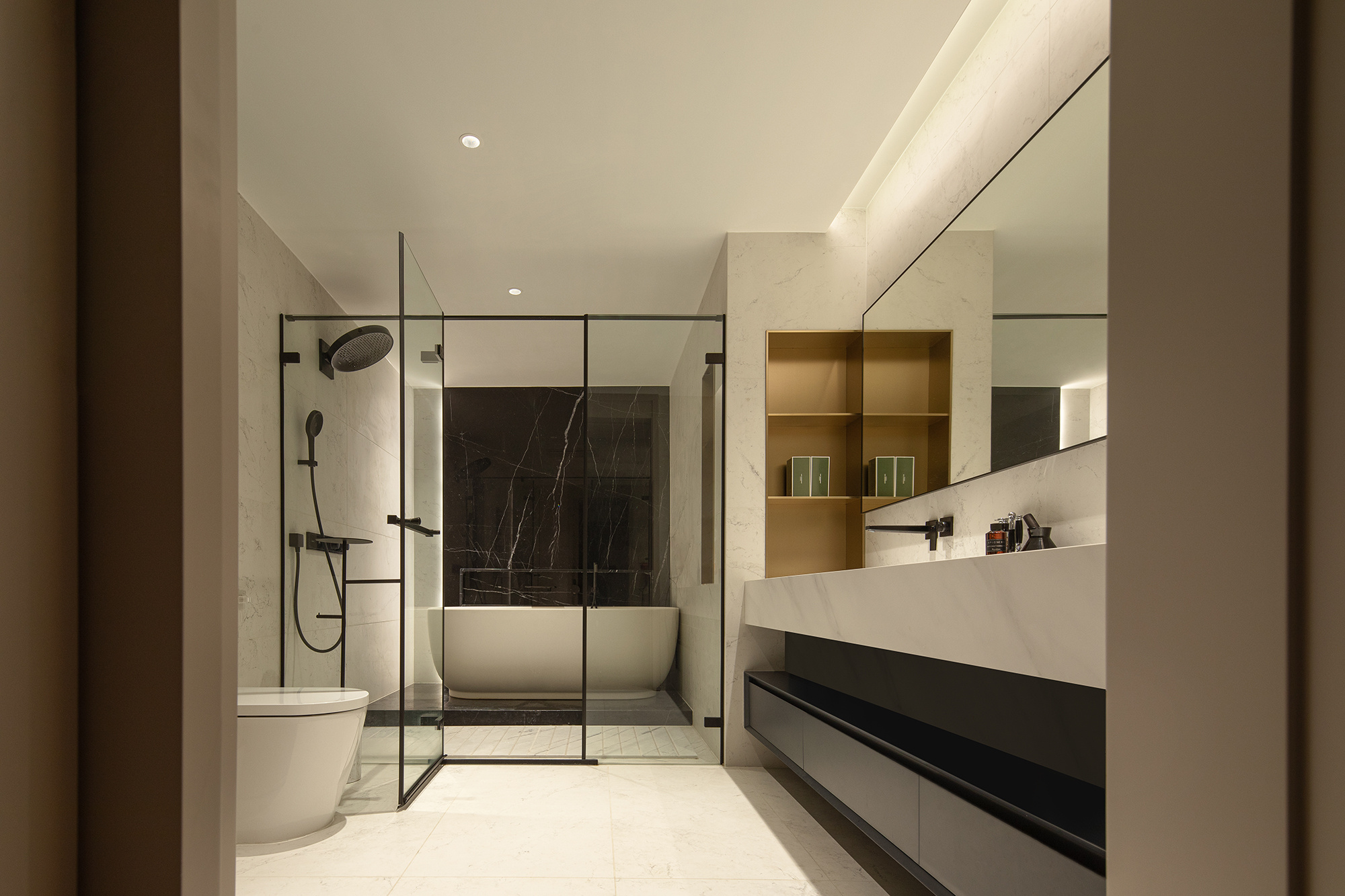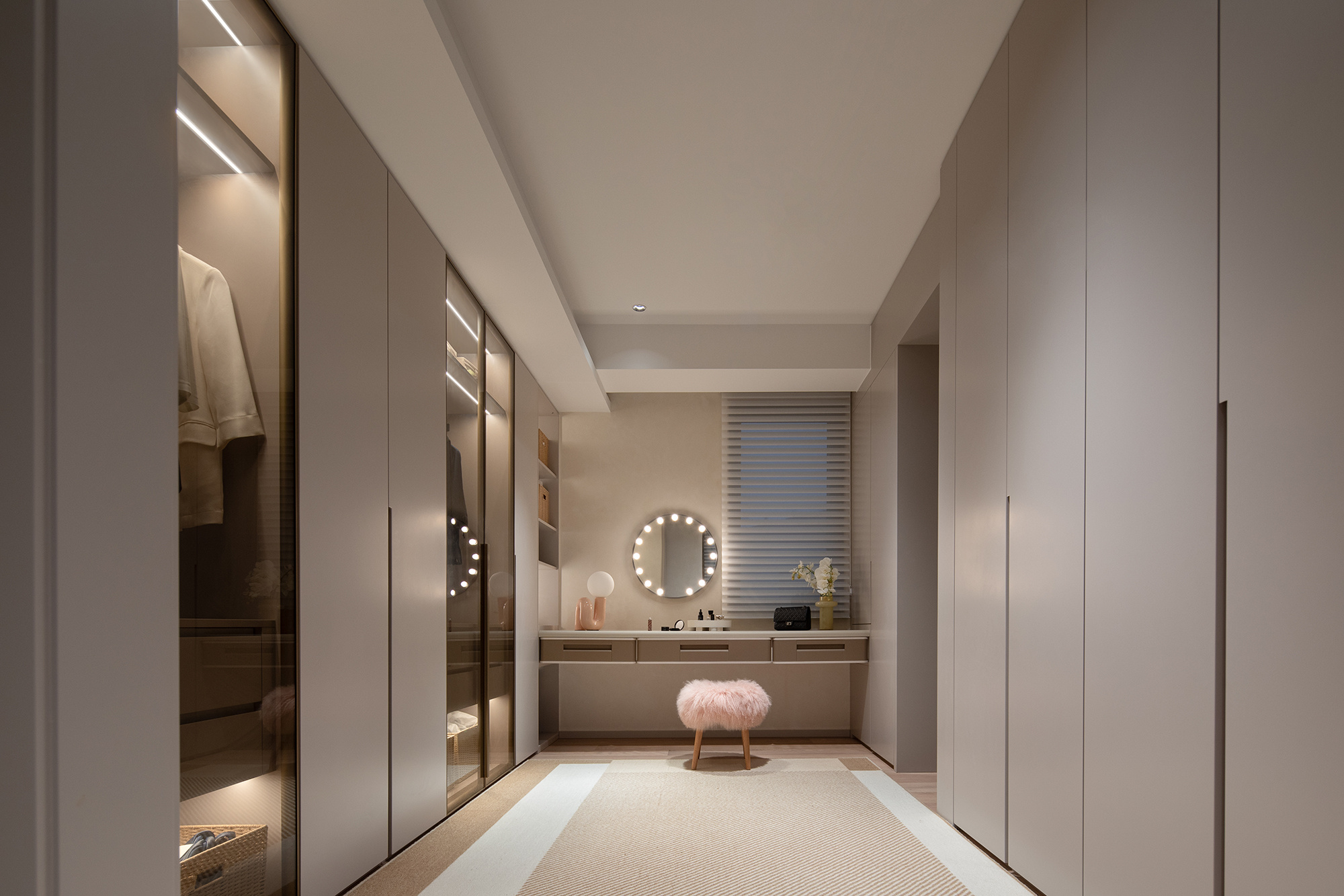 男女主人有各自喜好的色彩,黑色与米色在冷暖之间平衡的刚刚好。衣帽间是女性的自我空间,简洁、克制、温馨,合理而高效的收纳,让每一次的使用都充满幸福感。