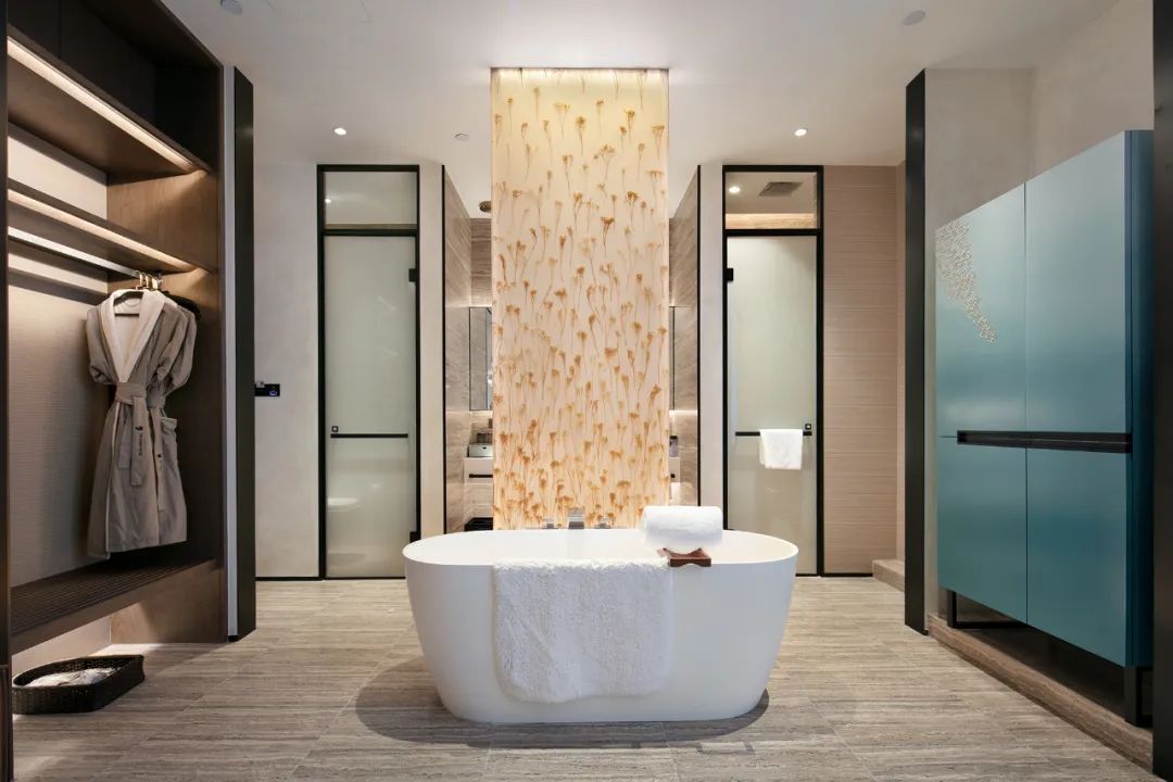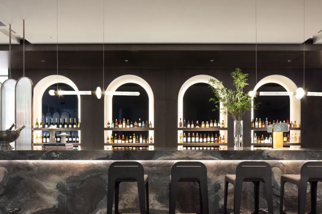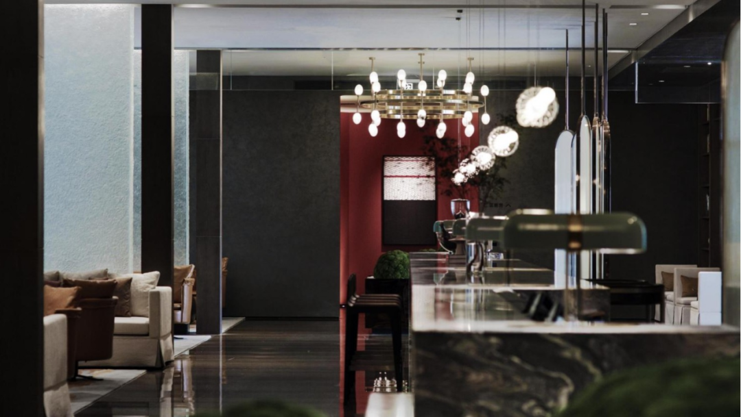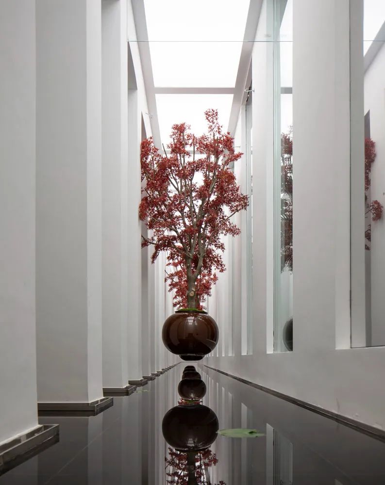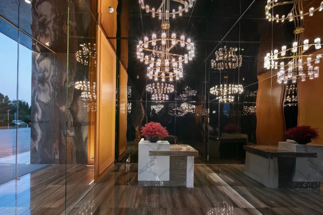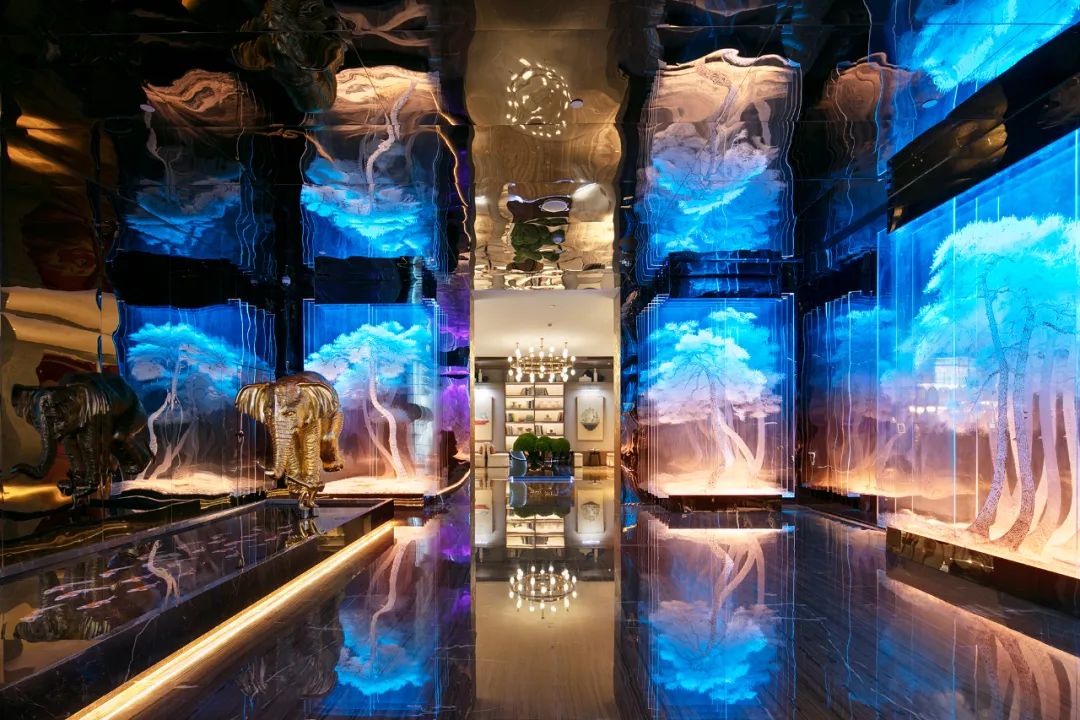 走出电梯厅,步入酒店大堂,侧面水景及雕塑映入。以“象之屋”为题,打造了一个通透、光怪陆离的大厅。搭配亚克力装置,引光影流泻。在此处强调更多的是空间与视觉的关系,一个秘密花园引人入内...