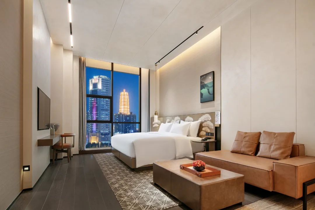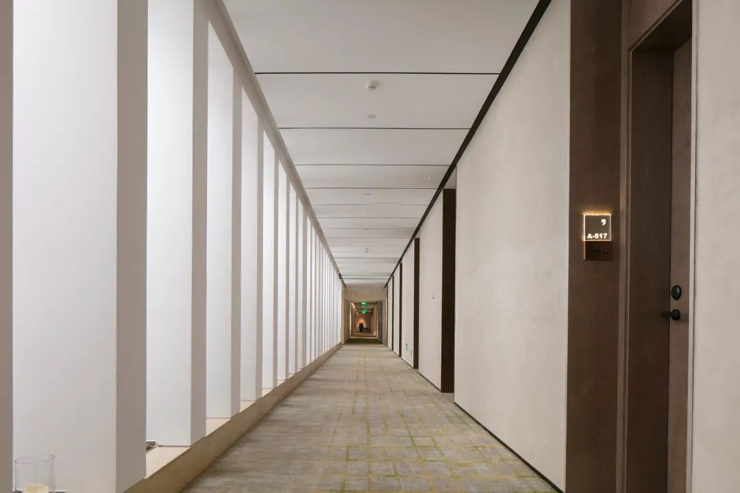 大堂开放融合式设计,融入酒吧功能,简约时尚活力又十足,商务和时尚完美结合。在酒店暗房的处理手法上,我们采用了模拟天光的采光井,以及智能调光灯具:可以根据不同的时间和场景,灵活调整光线的亮度、色温等参数,如早晨可以模拟日出时的柔和光线,逐渐变亮变暖;傍晚则模拟日落时的昏暗光线,逐渐变暗变橙,可最大程度地模拟太阳光线的真实效果,让客人在室内感受到如同户外的自然光线。同时在一些不好利用的拐角处,我们利用绿植,营造出很多小景,也是客人拍照打卡非常出片的地方。