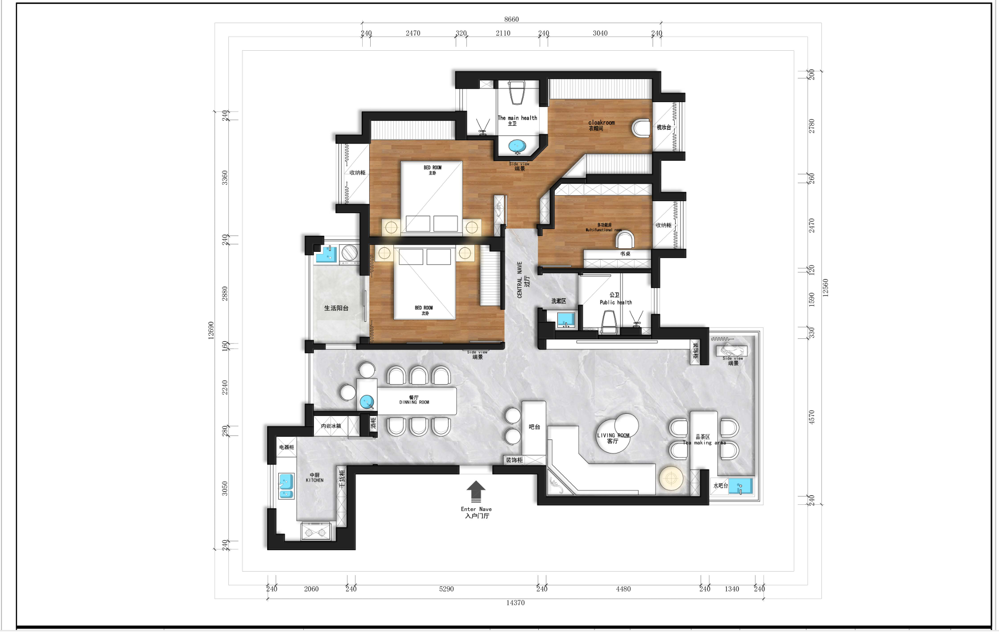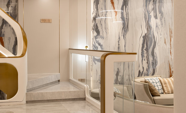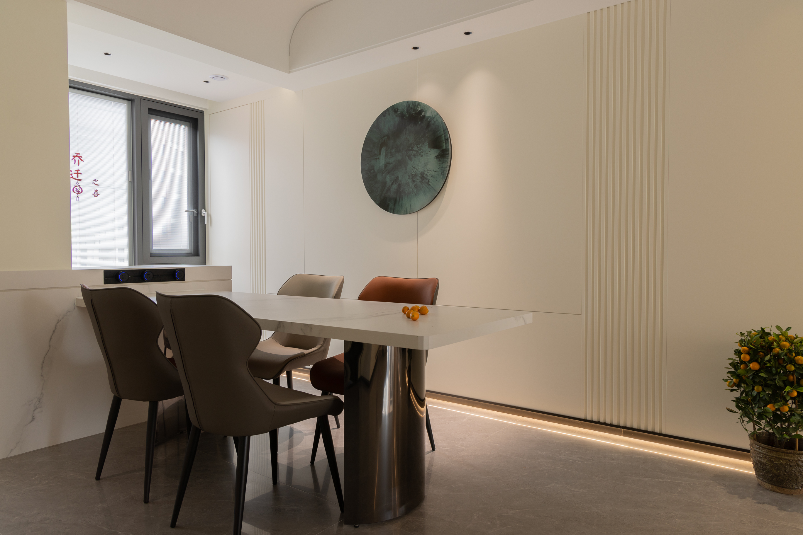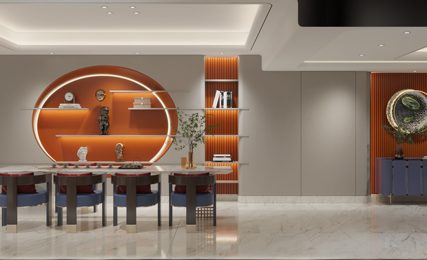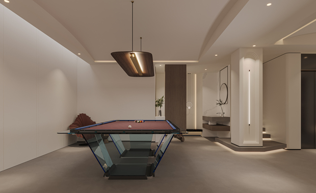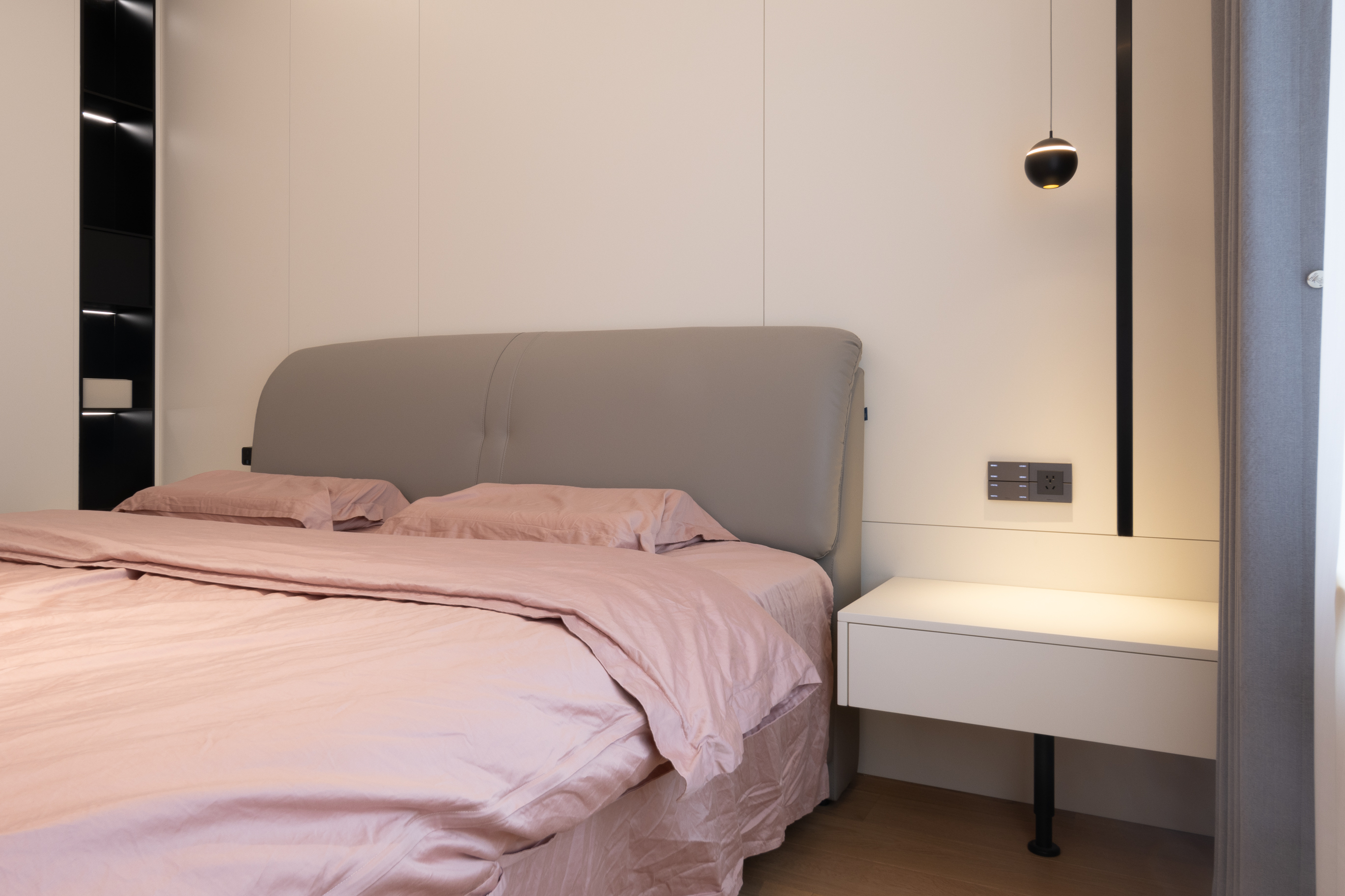 设计选材:整体使用艺术漆,部分墙板,通过灯光点亮空间