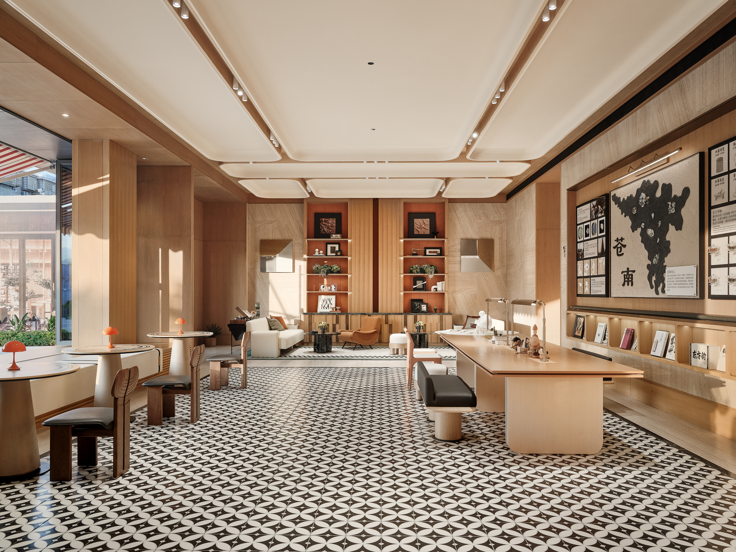 作为“小而暖”的社区聚场,本案围绕场景化的功能营造为主,将“暖”作为主体基调并应用至整个空间。