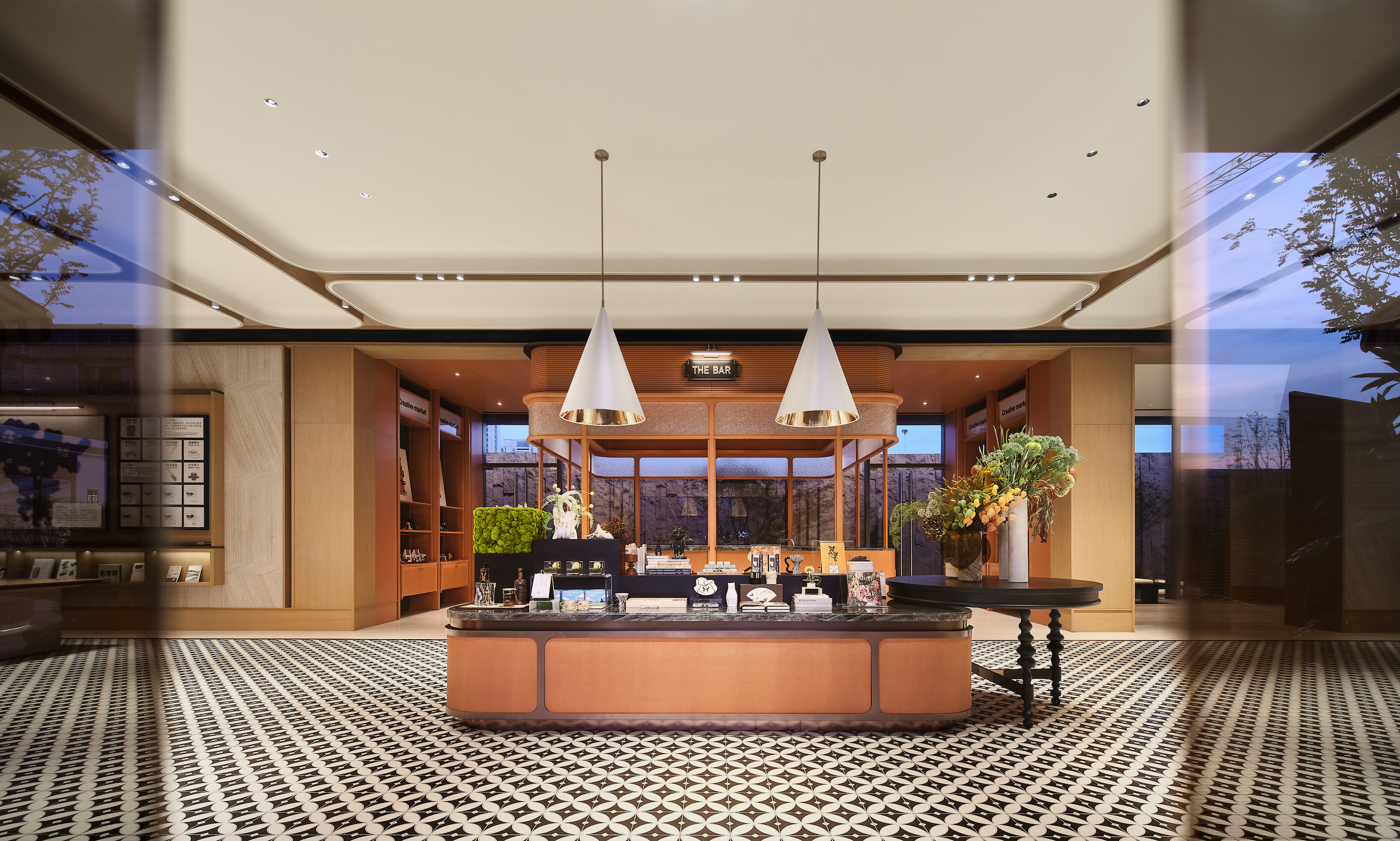 设计选材:设计通过材质的叠加,原木的温和松弛、拼花石砖的复古优雅,共同形成了空间大胆而明快的独特视觉风格与记忆感。