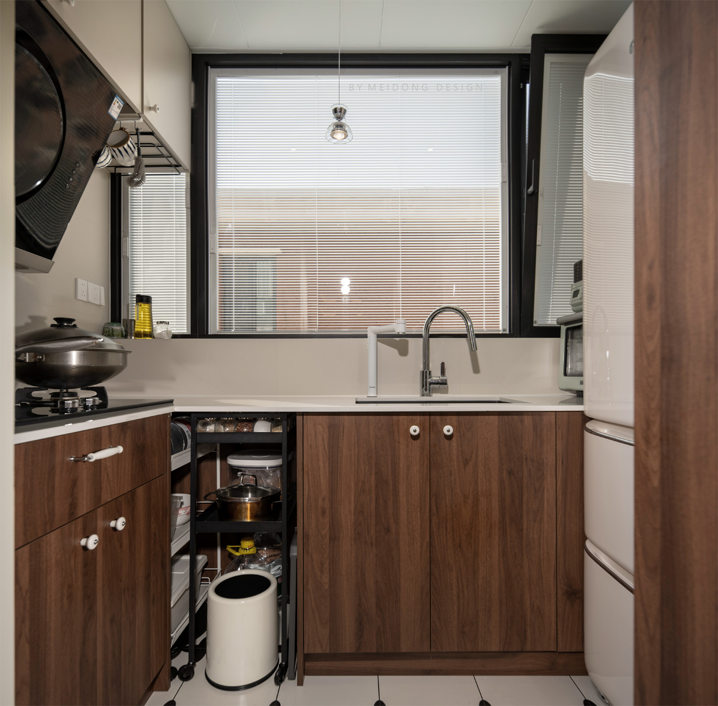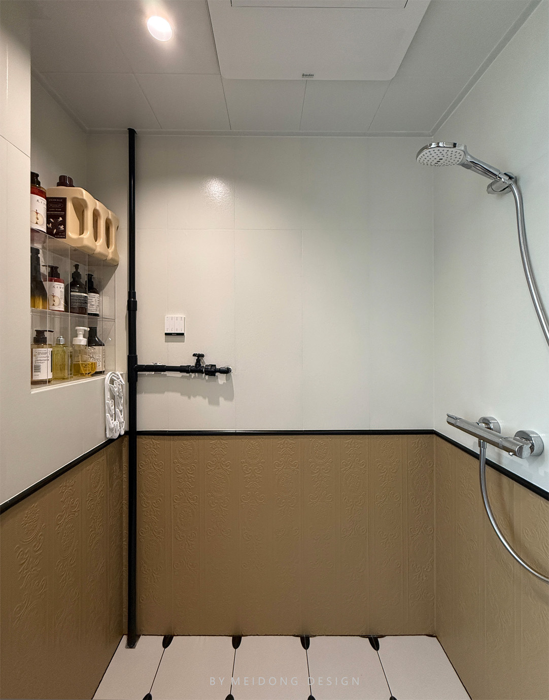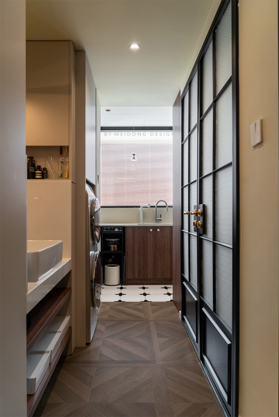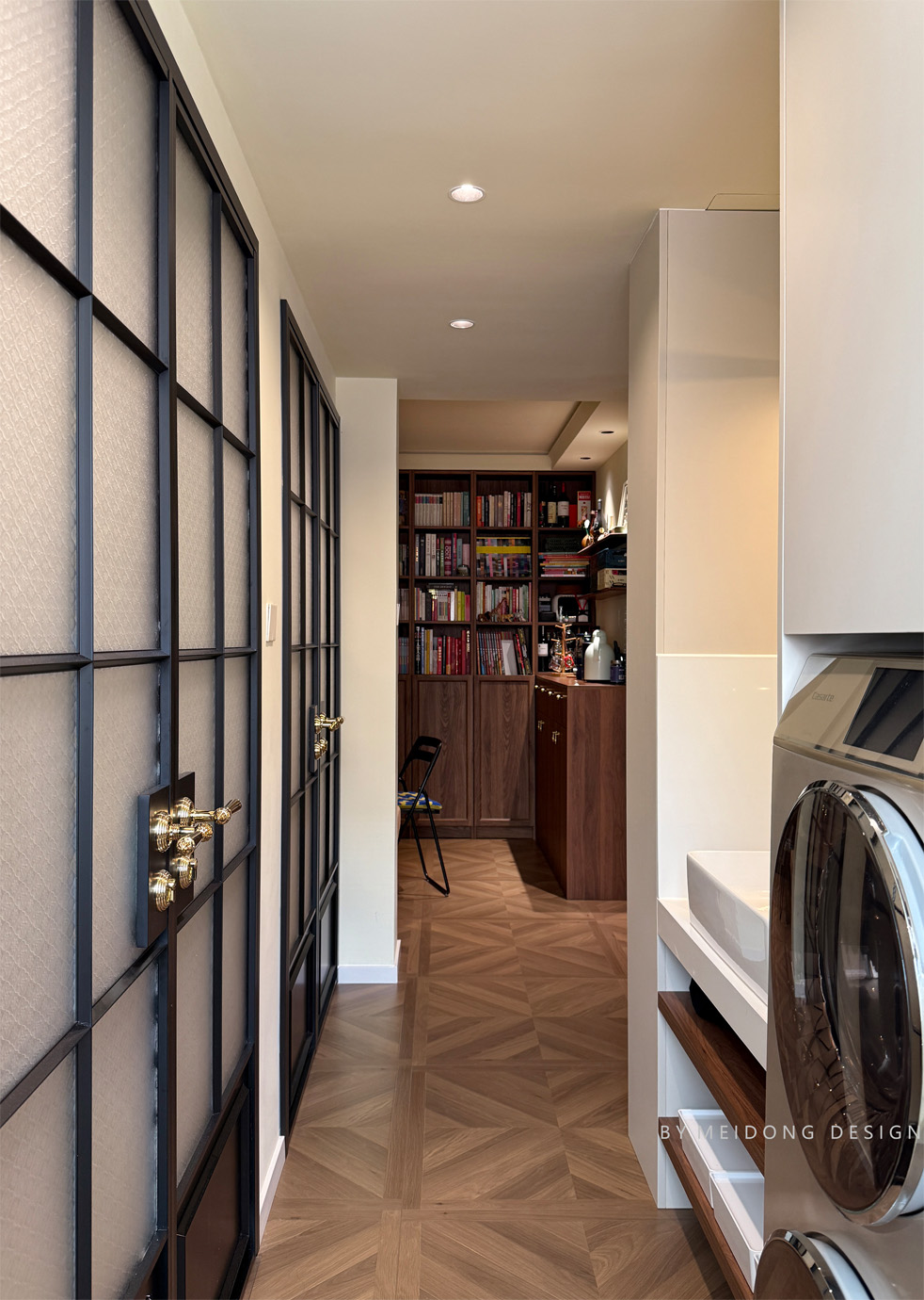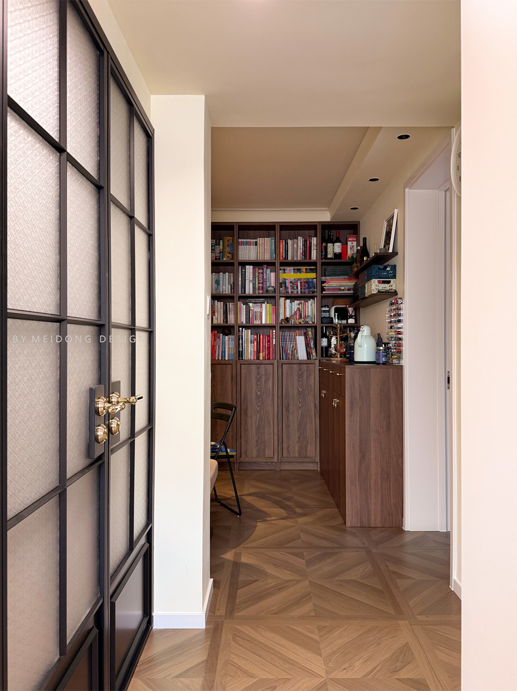 改善老破小传统布局,实现了卫生间三分离的布局,更适合一家四口的使用需求,用金属门作为分隔,省掉了墙体的厚度,让空间尺度更加舒适