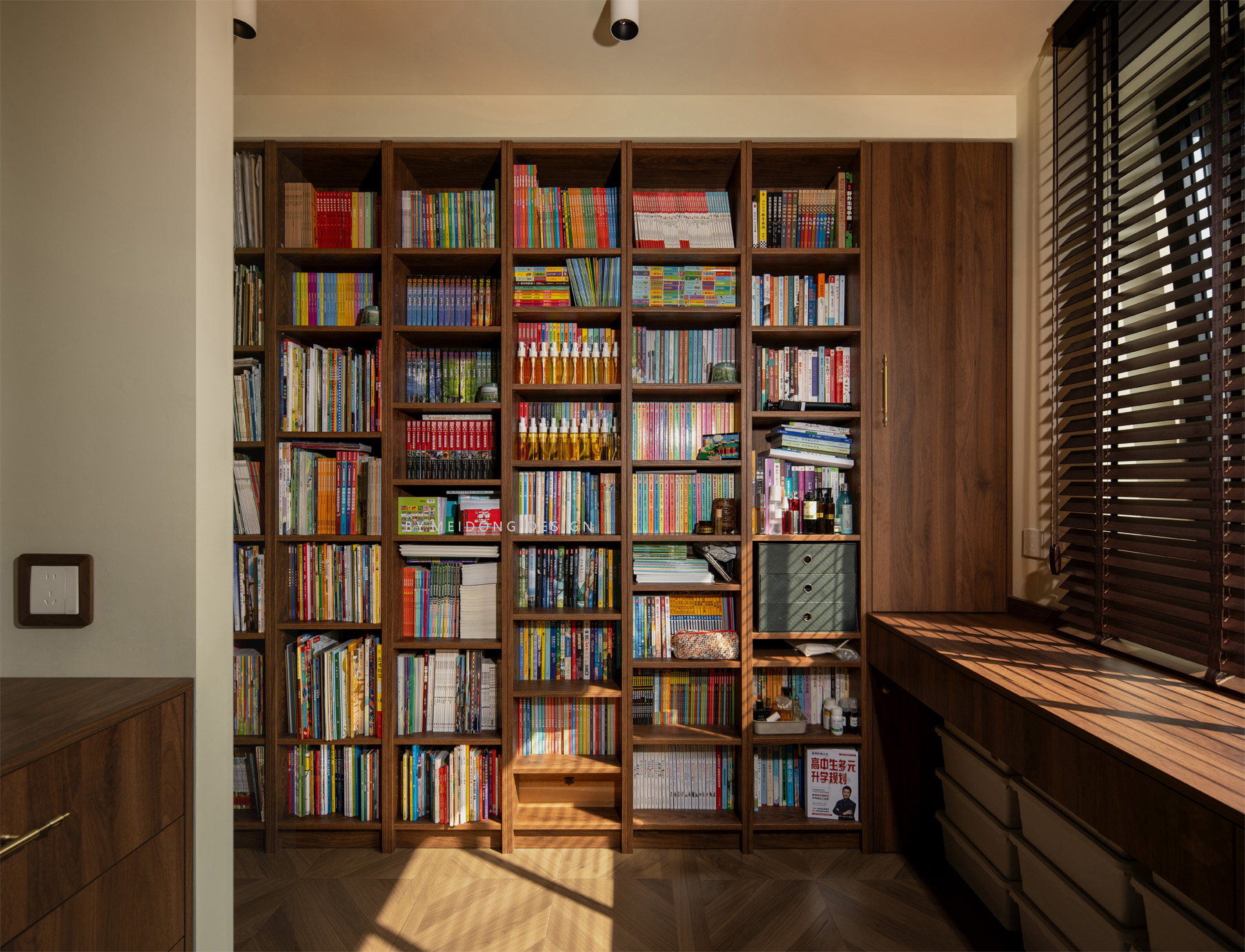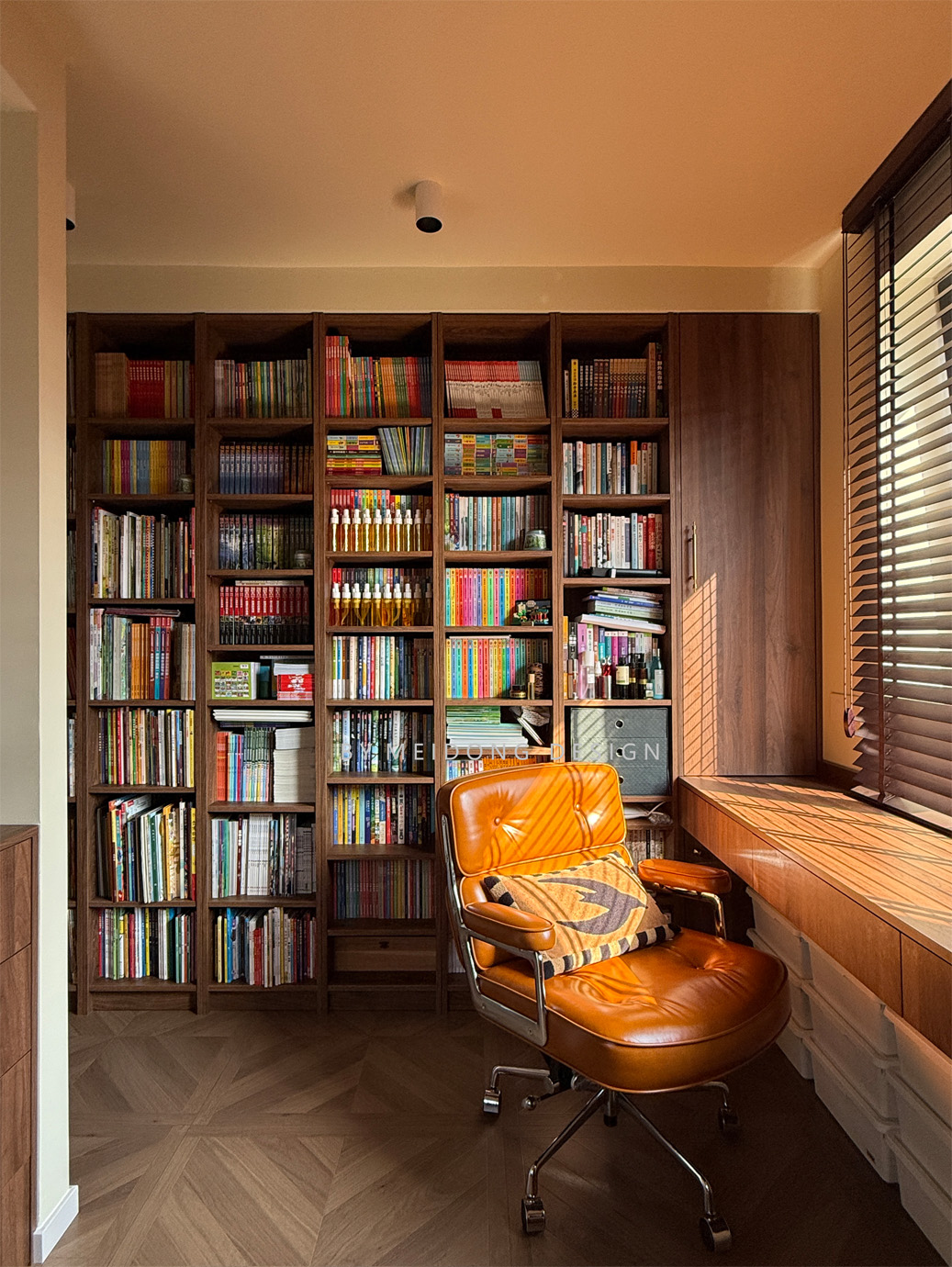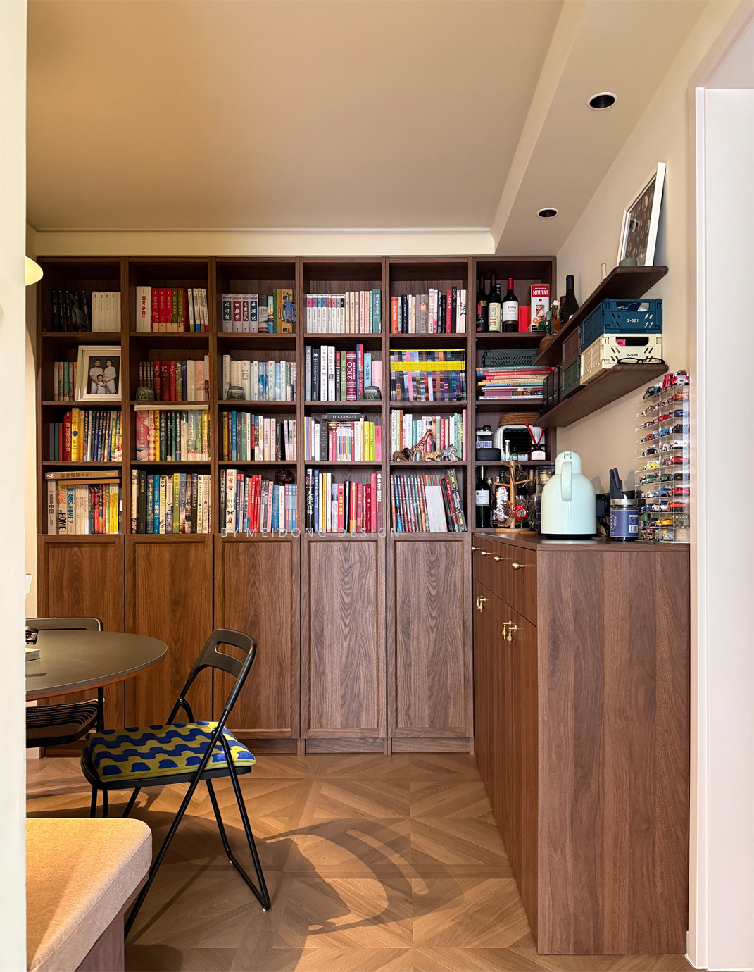 整面墙的书柜使用了宜家毕利书柜和定制柜体结合的形式,花色非常靠近,毫无违和感