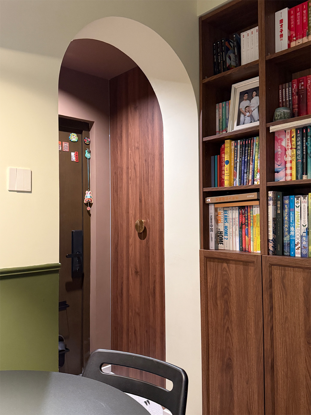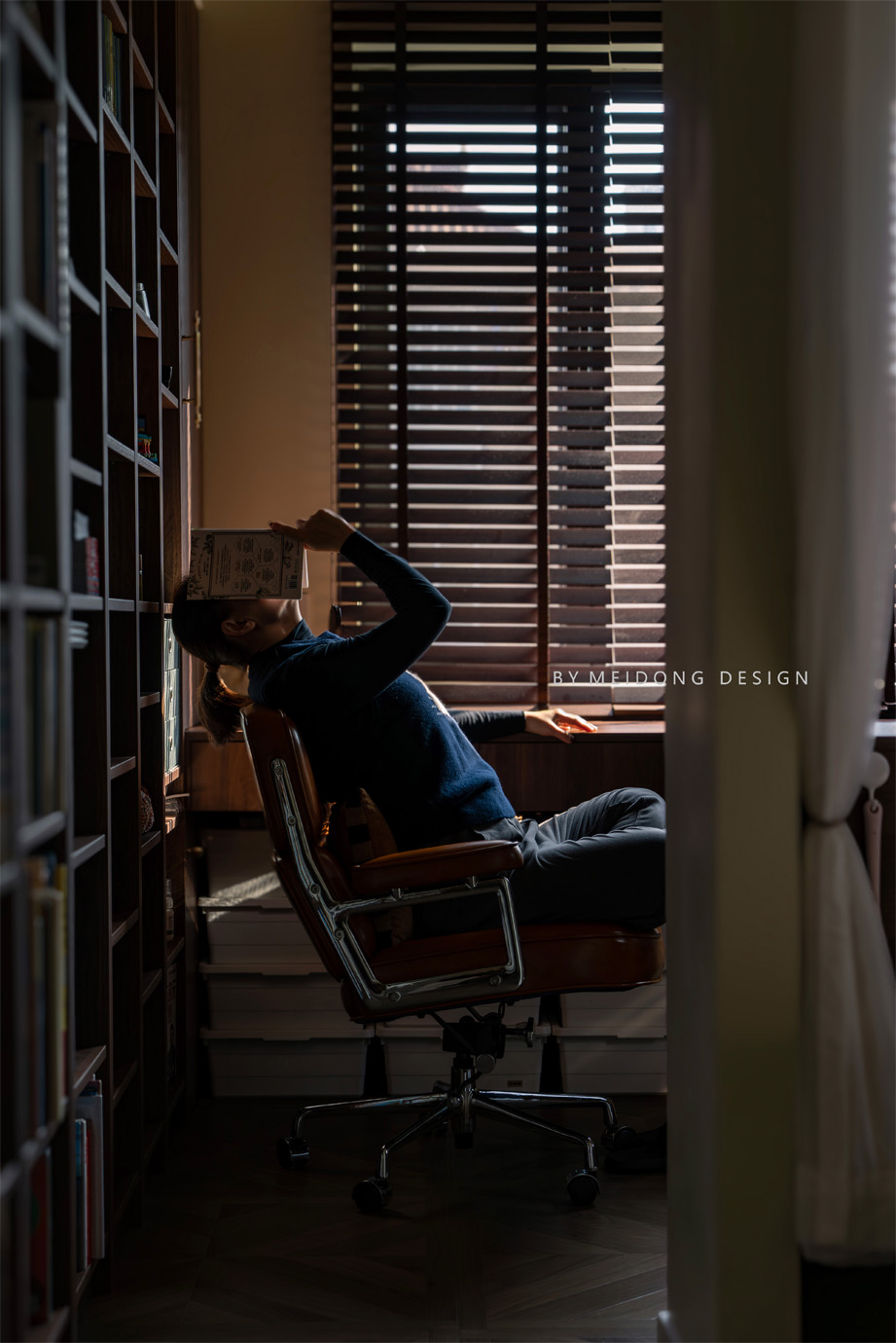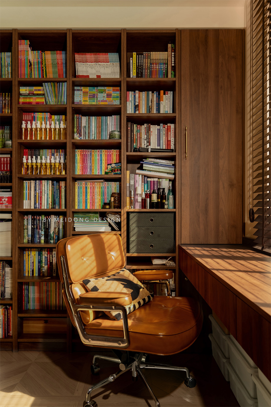整面墙的书柜使用了宜家毕利书柜和定制柜体结合的形式,花色非常靠近,毫无违和感