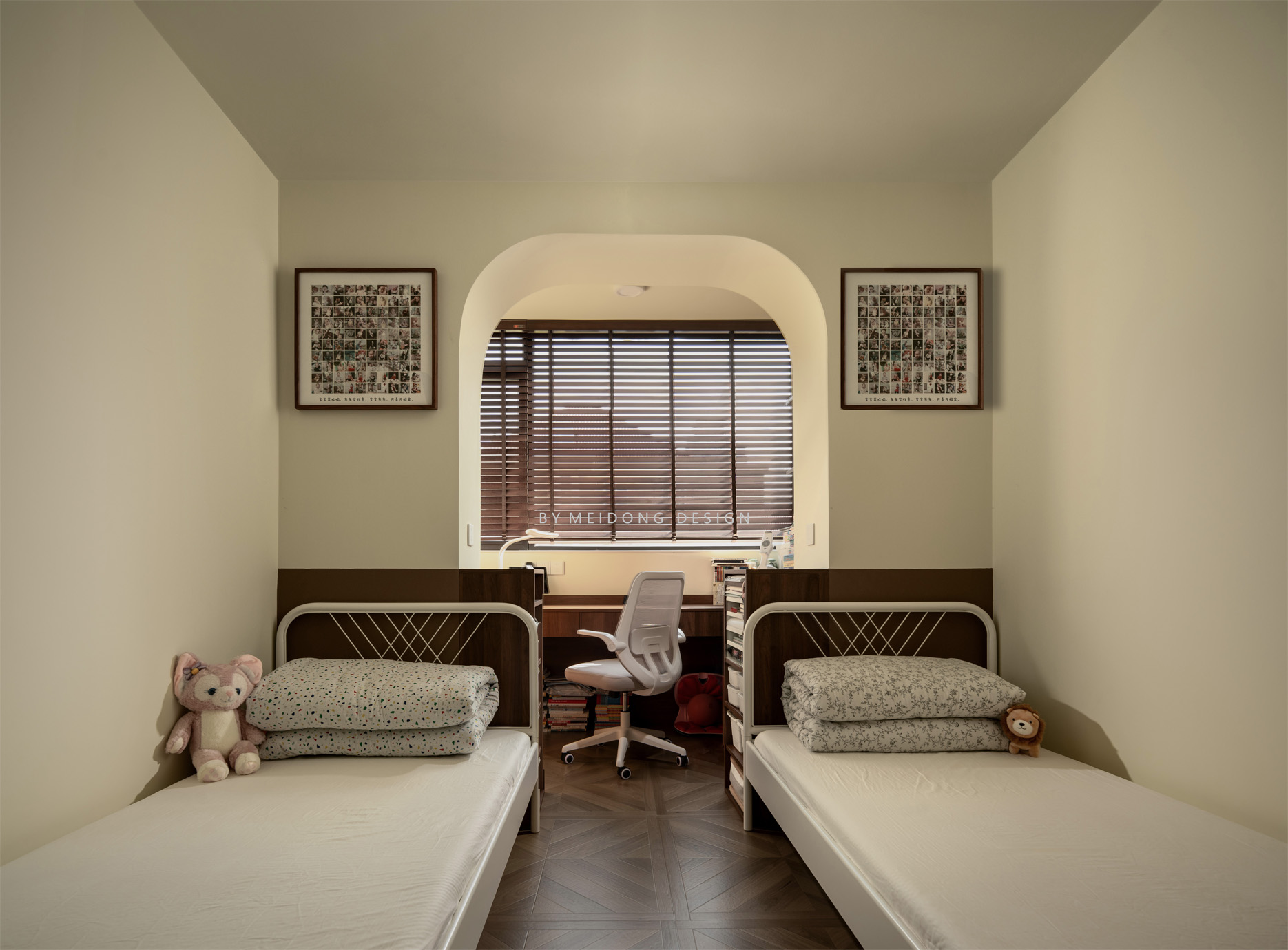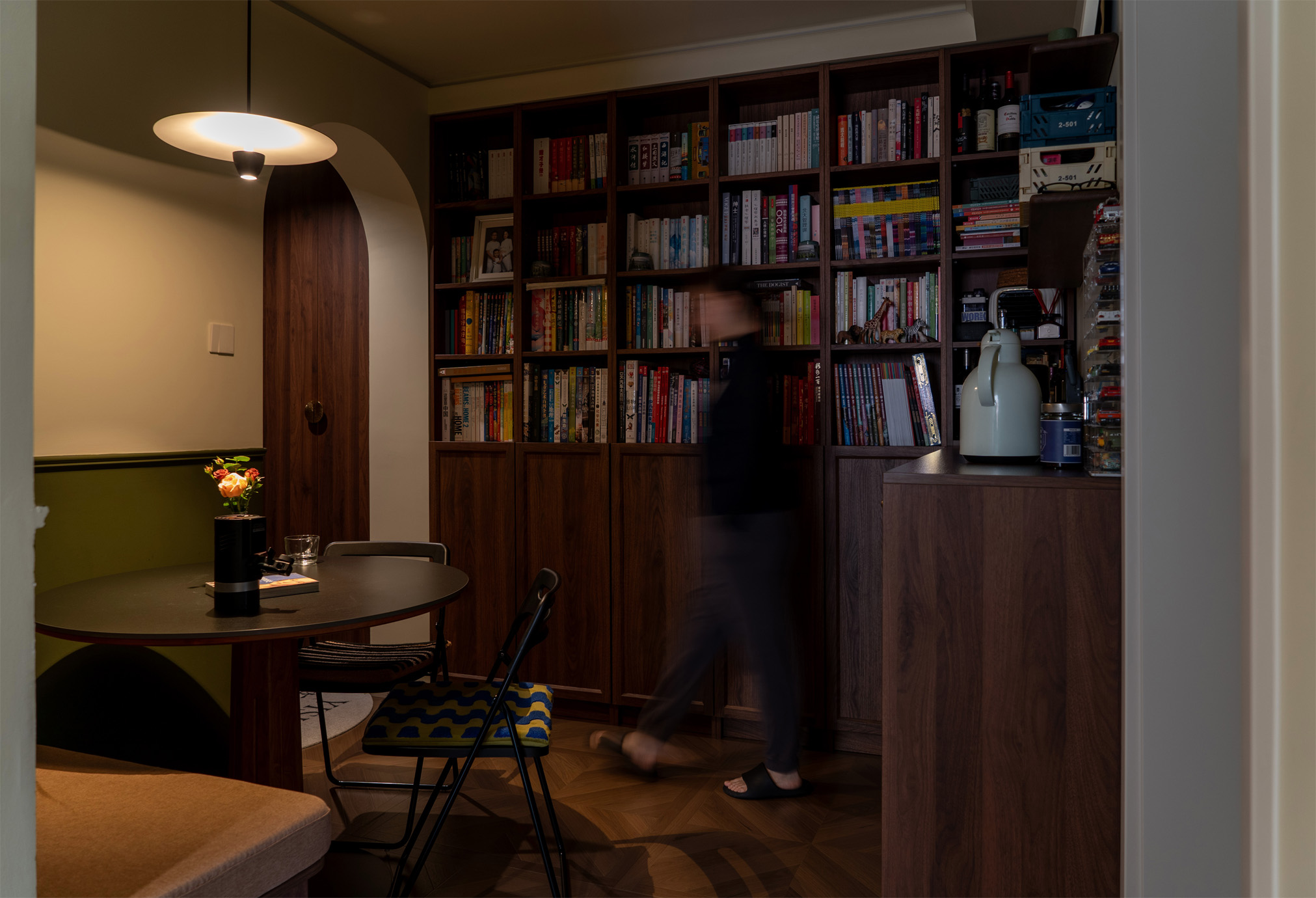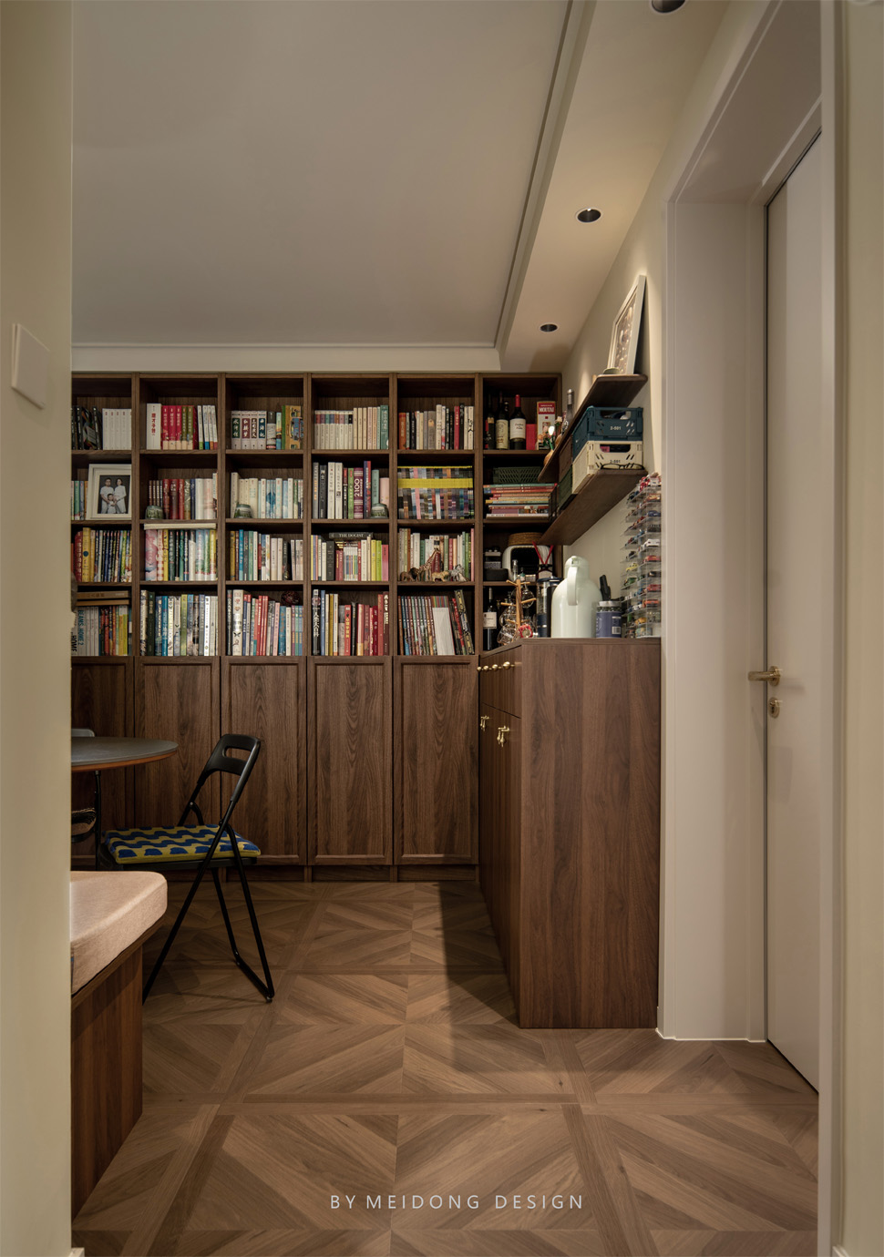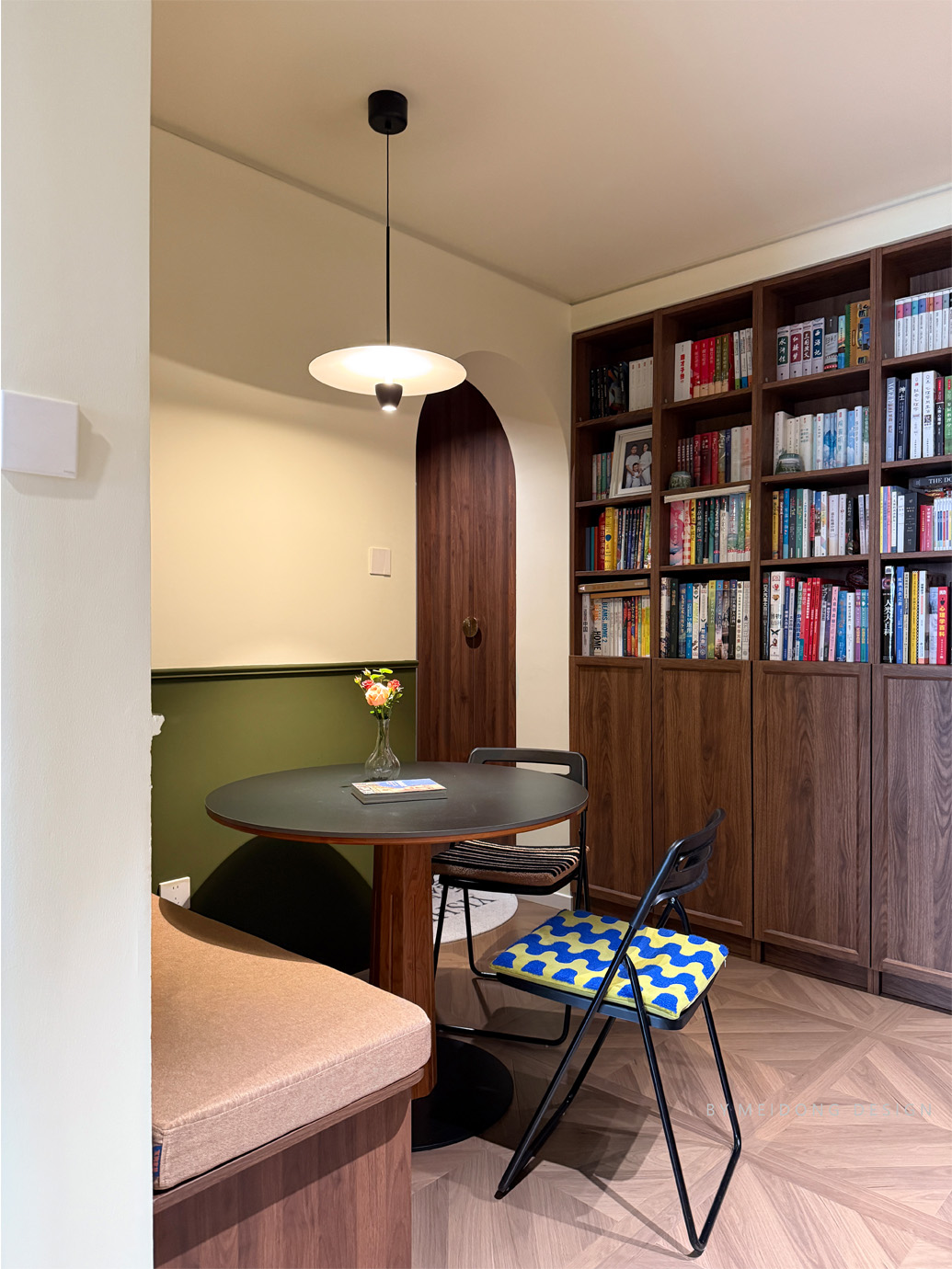 儿童房设置成两张双人床的形式,哥哥和妹妹拥有各自的睡眠区,改善老破小没有餐厅空间的问题,利用有限的空间打造复古感的家庭图书馆