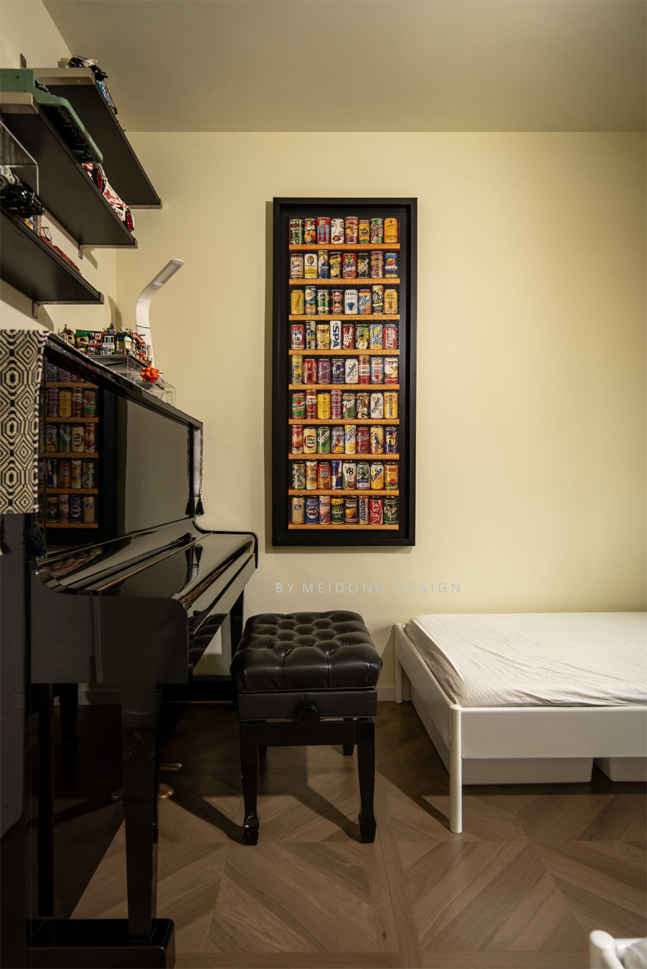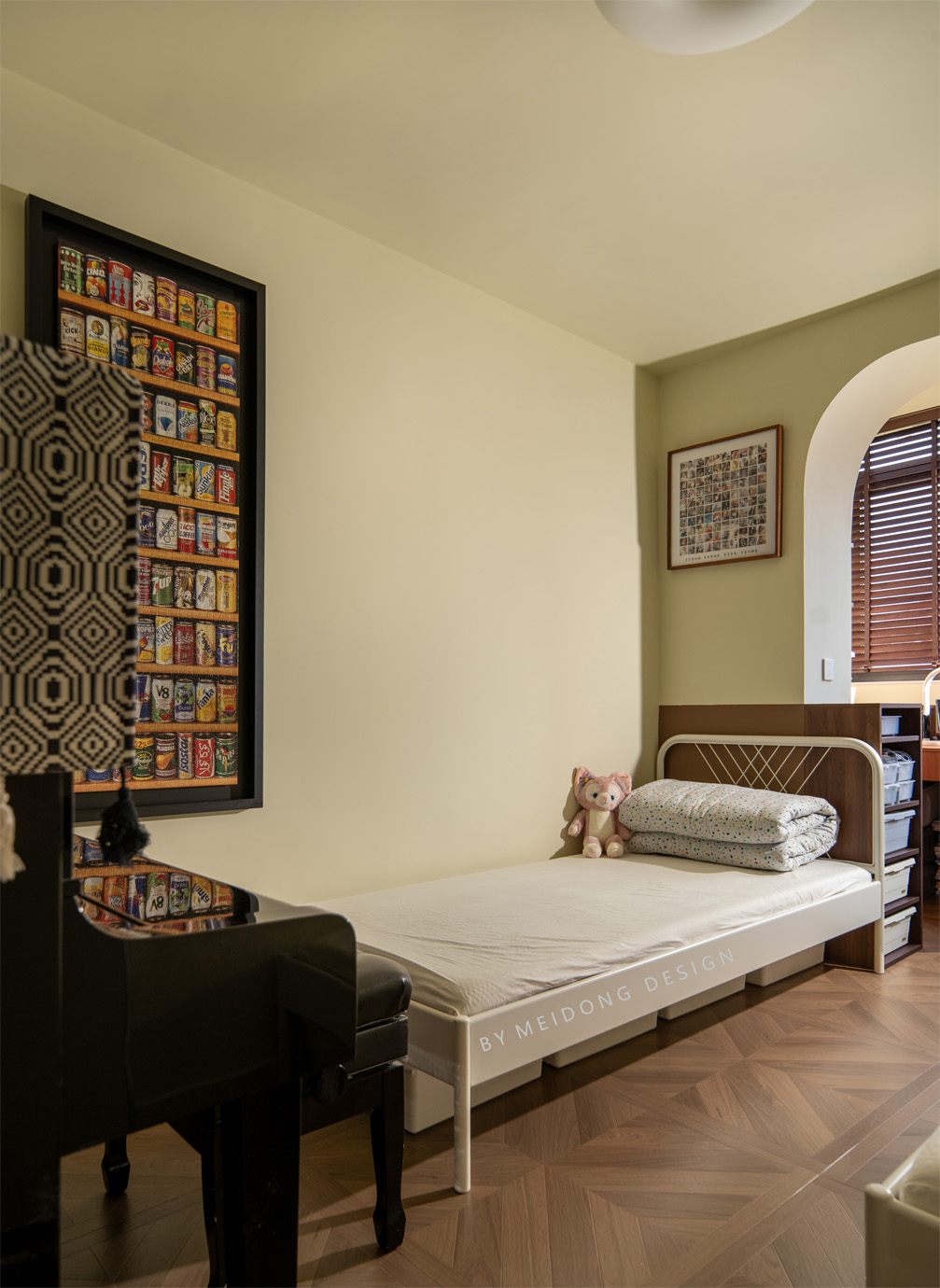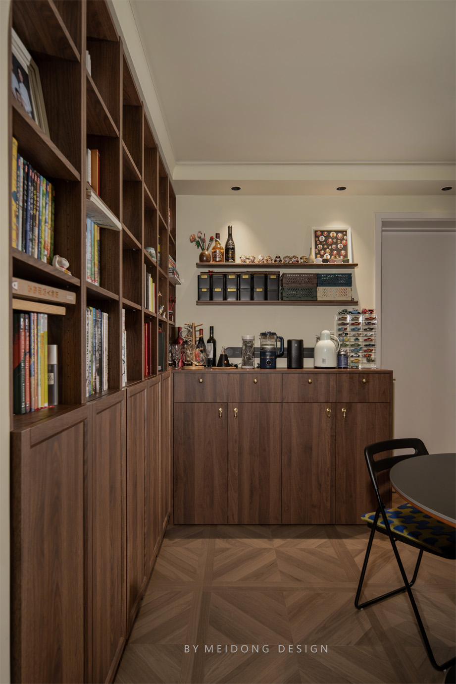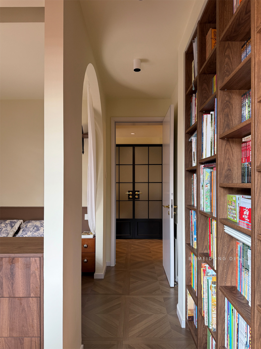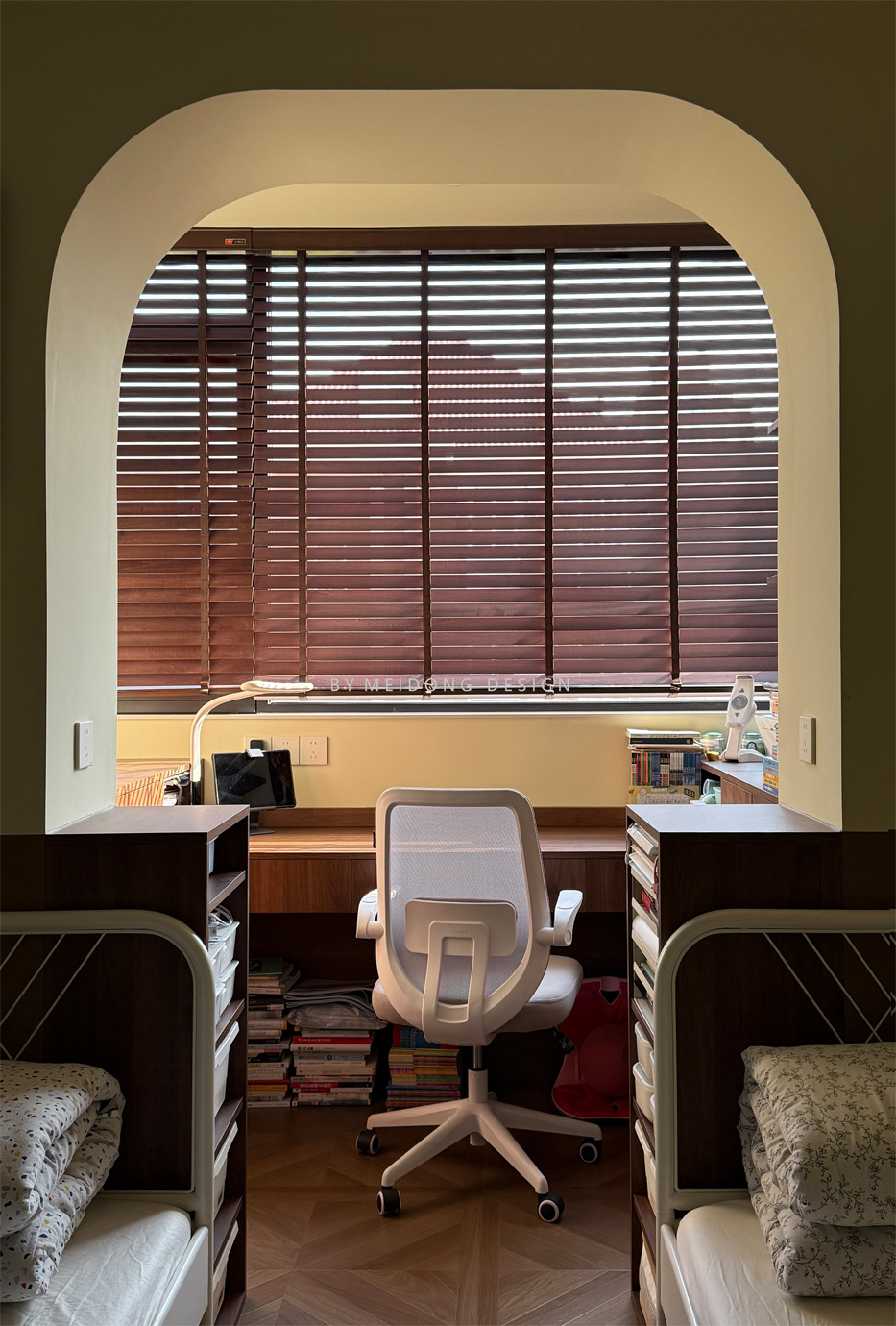 儿童房设置成两张双人床的形式,哥哥和妹妹拥有各自的睡眠区,改善老破小没有餐厅空间的问题,利用有限的空间打造复古感的家庭图书馆