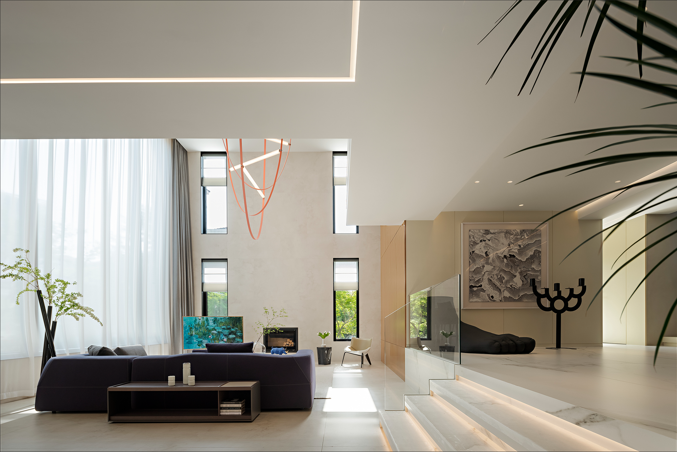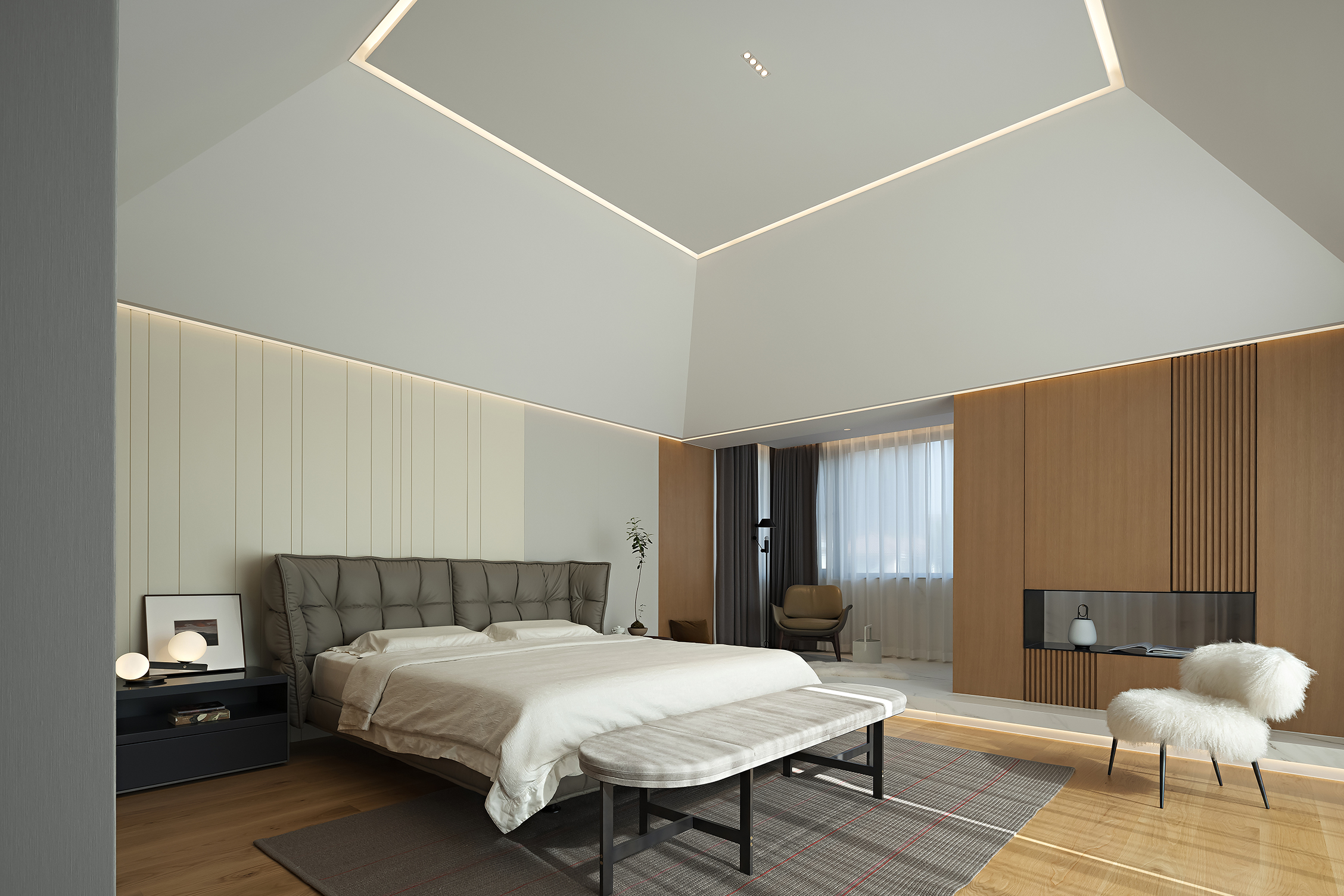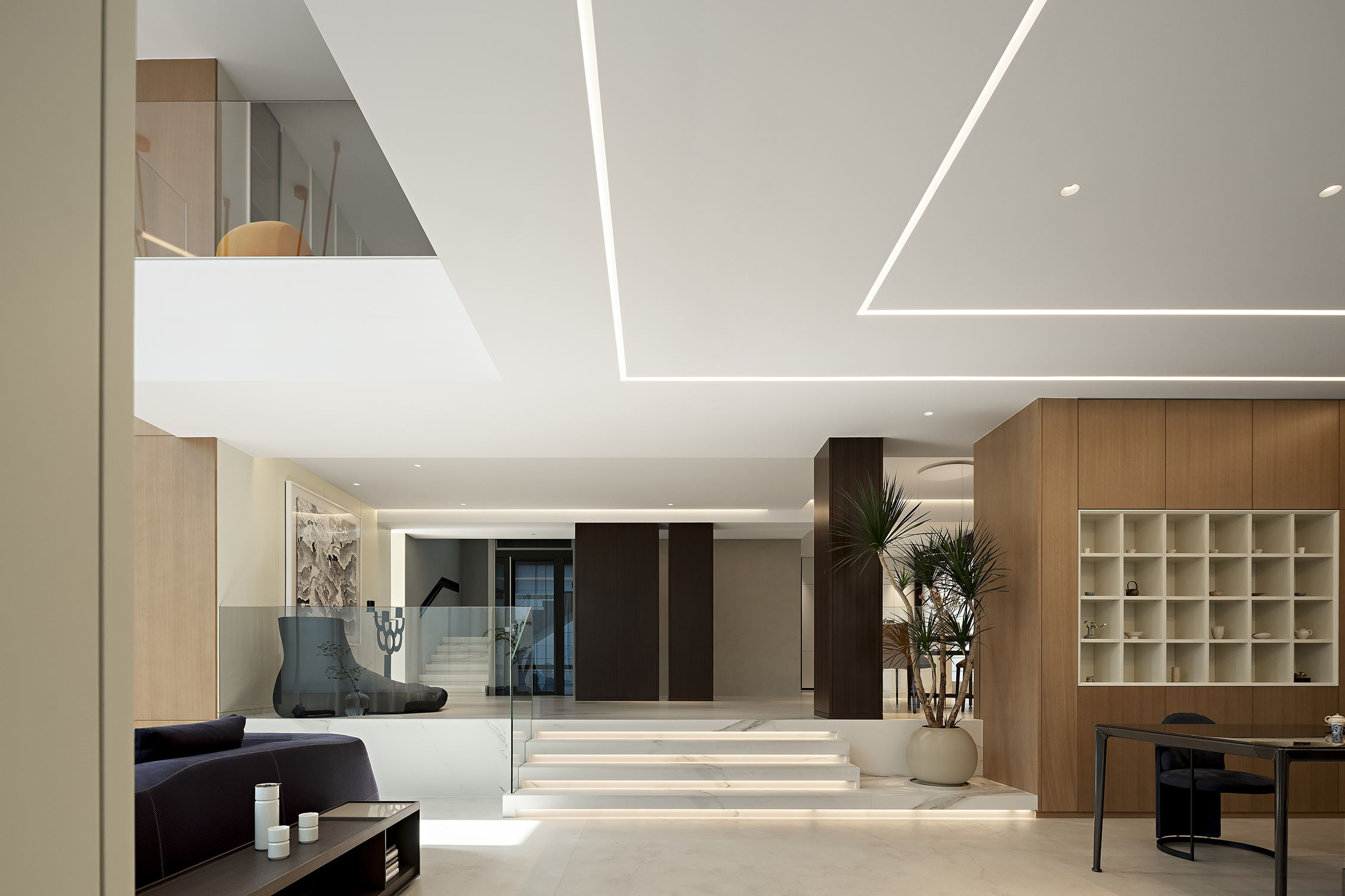 无主灯设计,预埋线型灯、透光软膜、墙面及地脚的辅助光源运用到别墅灯光设计中,勾勒空间线条的同时、很好表达各种材质的肌理和质感