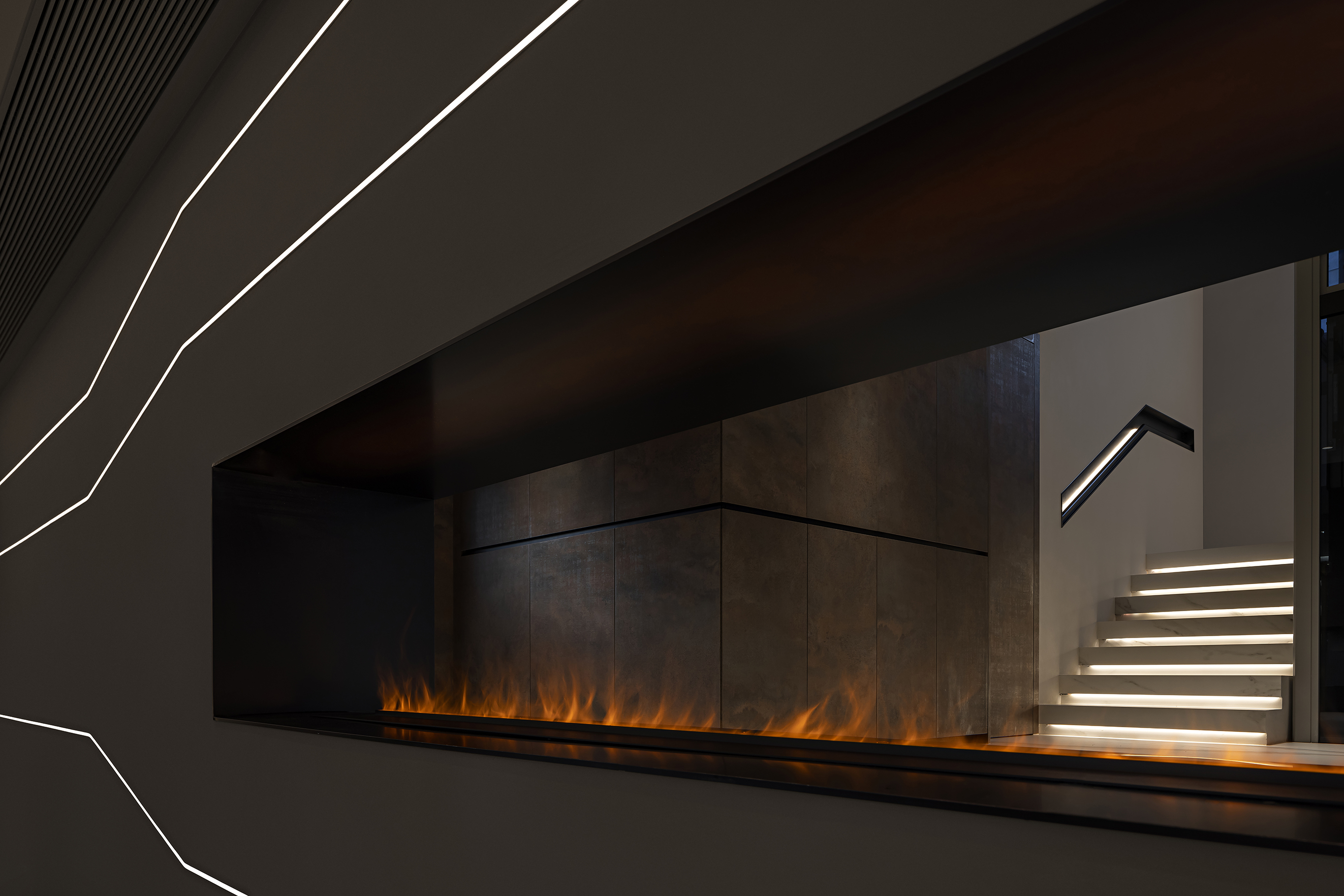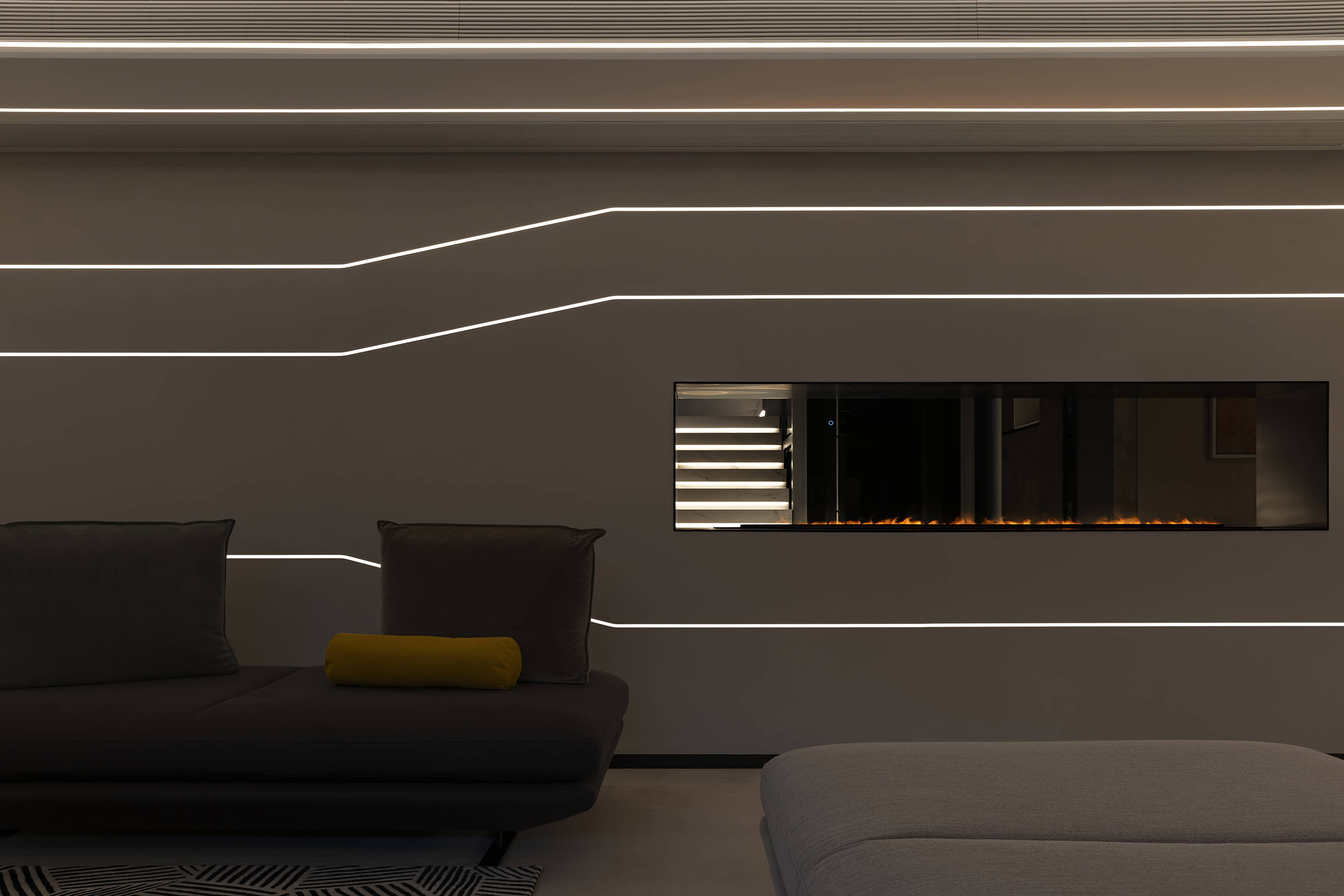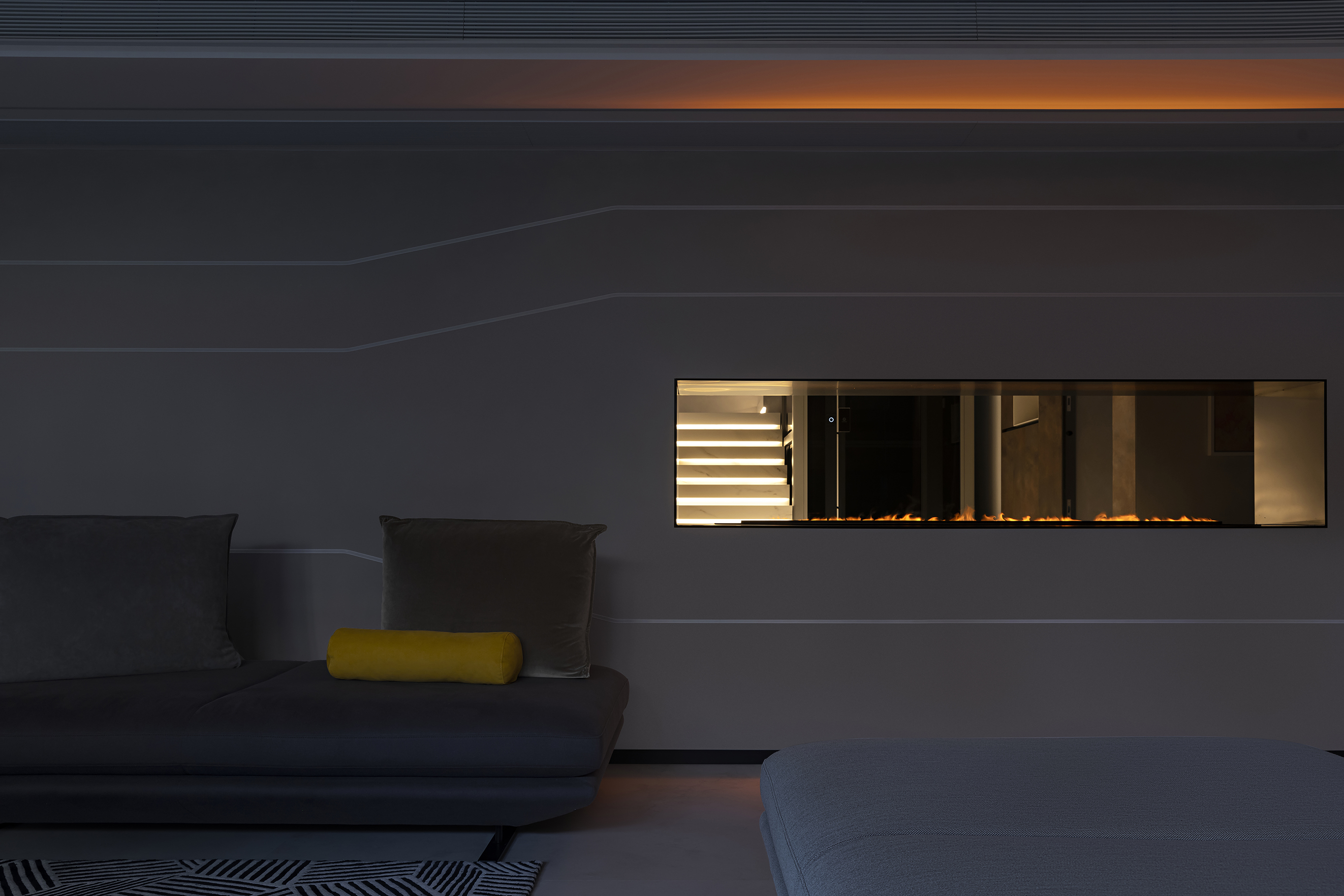 无主灯设计,预埋线型灯、透光软膜、墙面及地脚的辅助光源运用到别墅灯光设计中,勾勒空间线条的同时、很好表达各种材质的肌理和质感