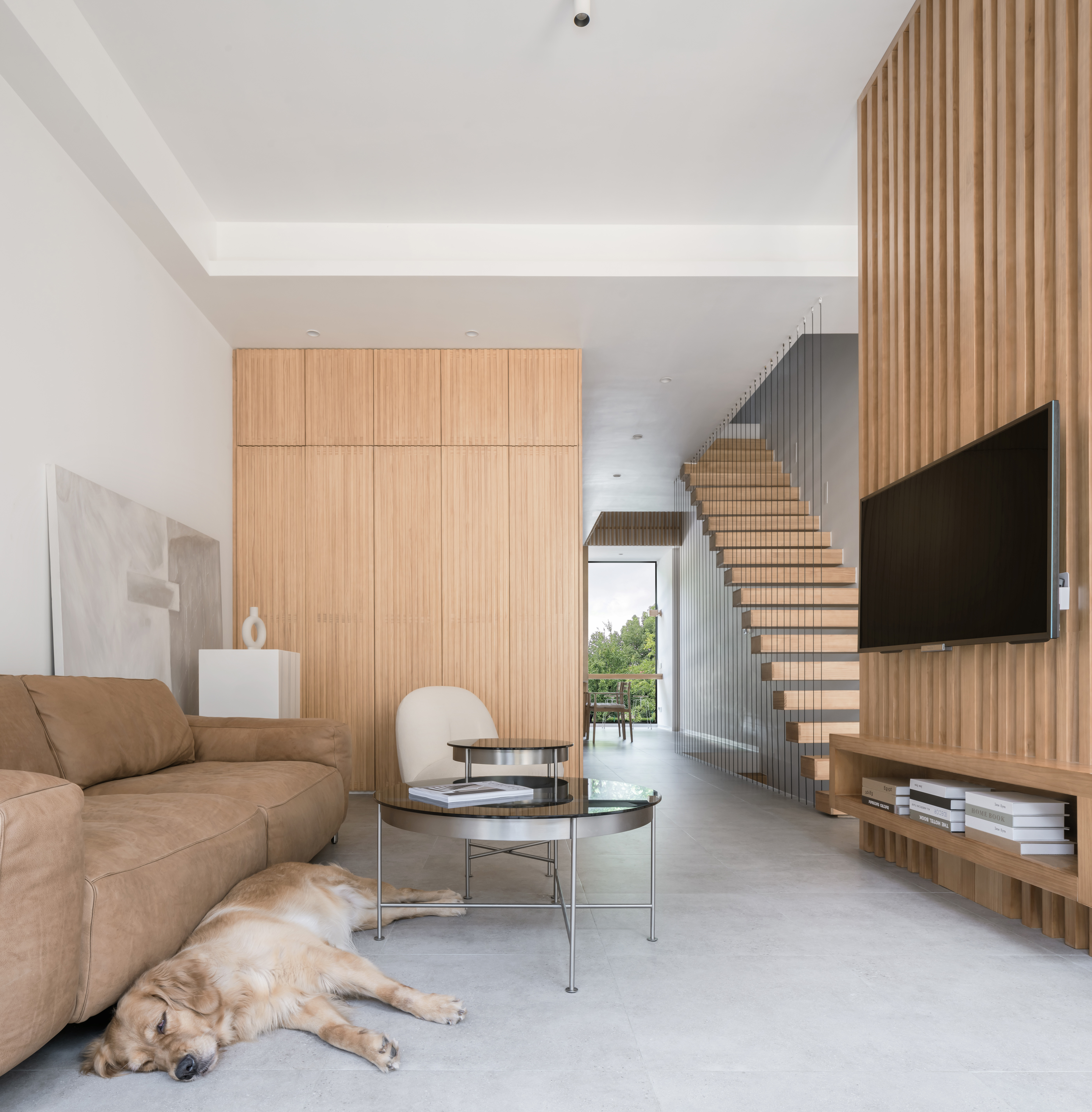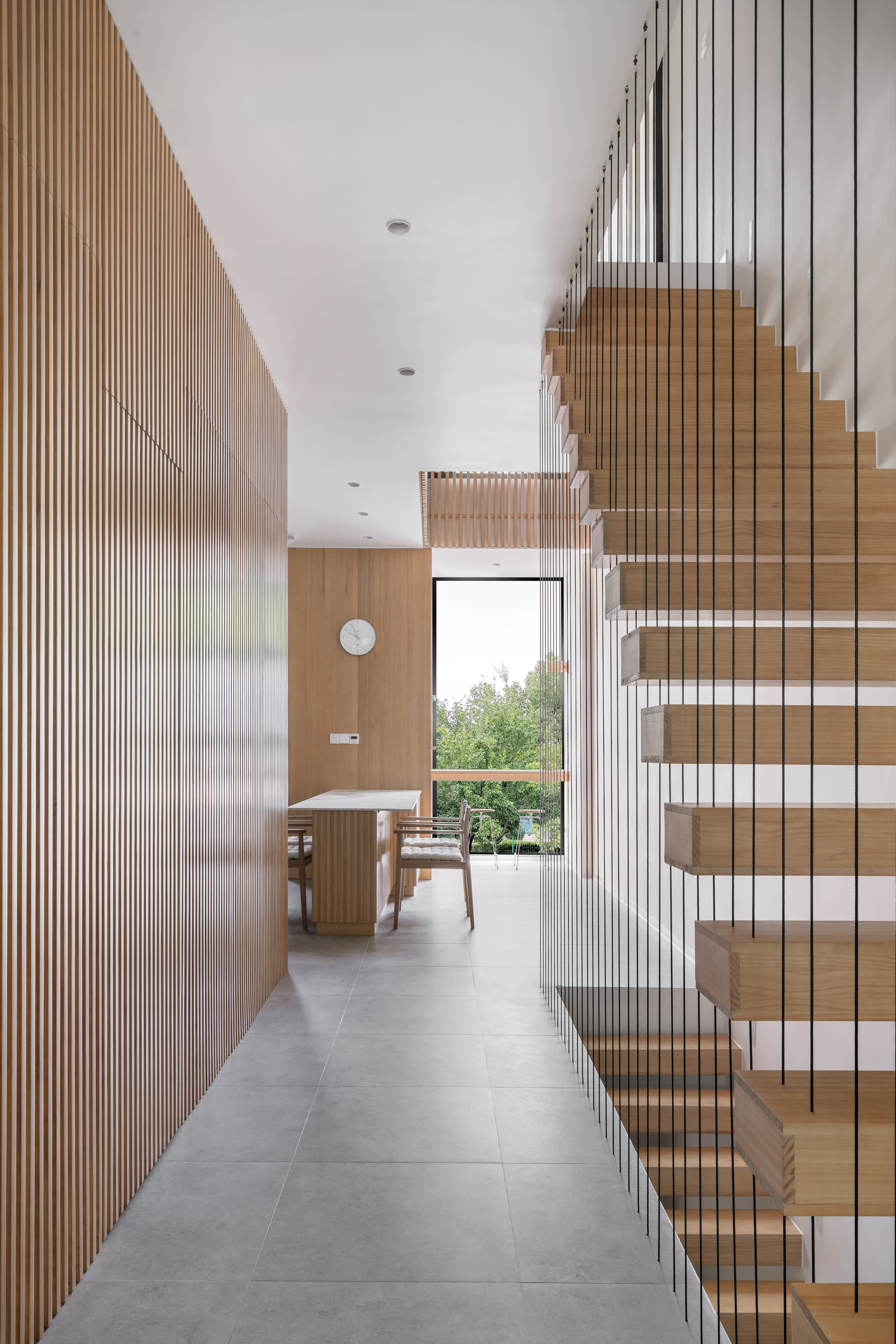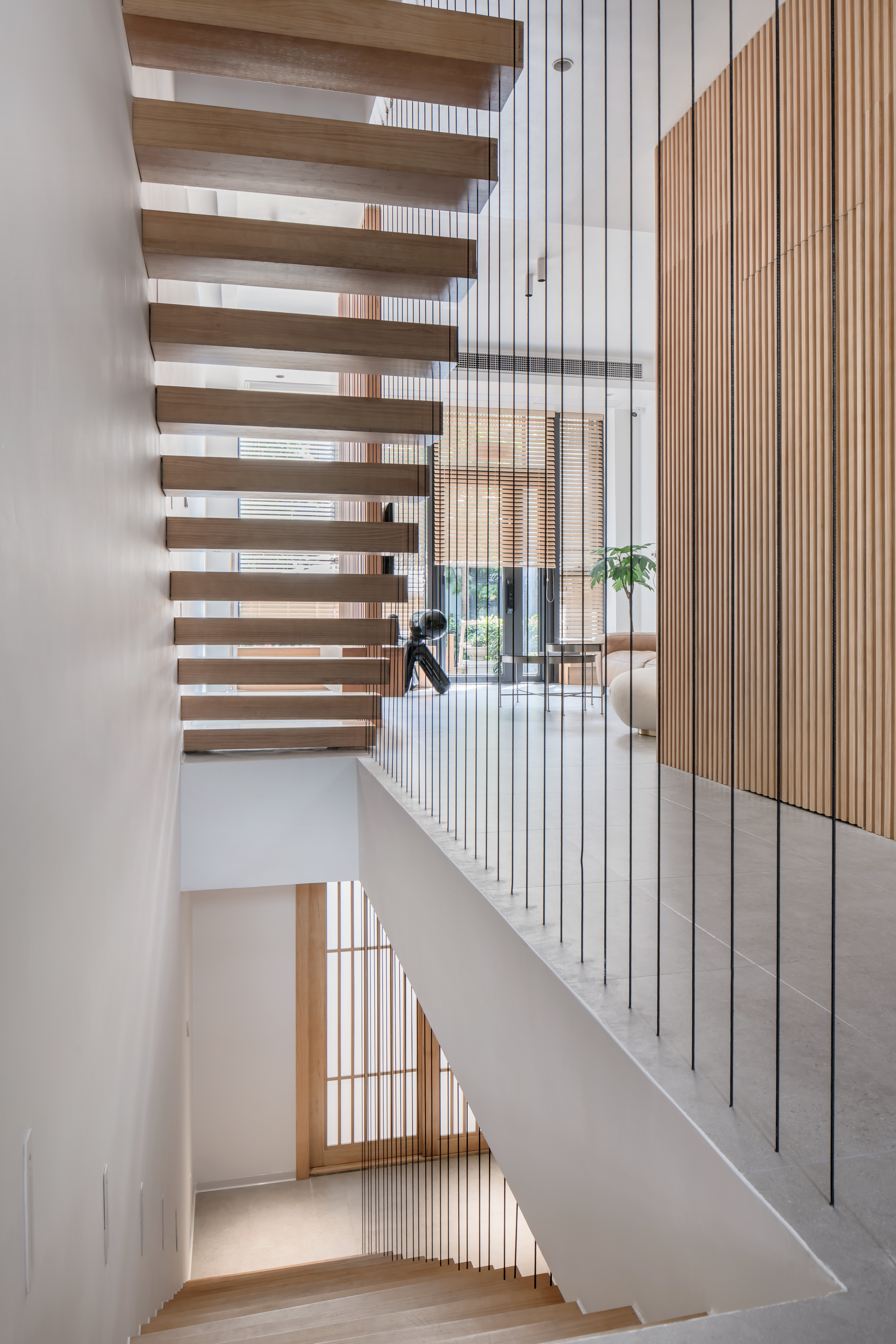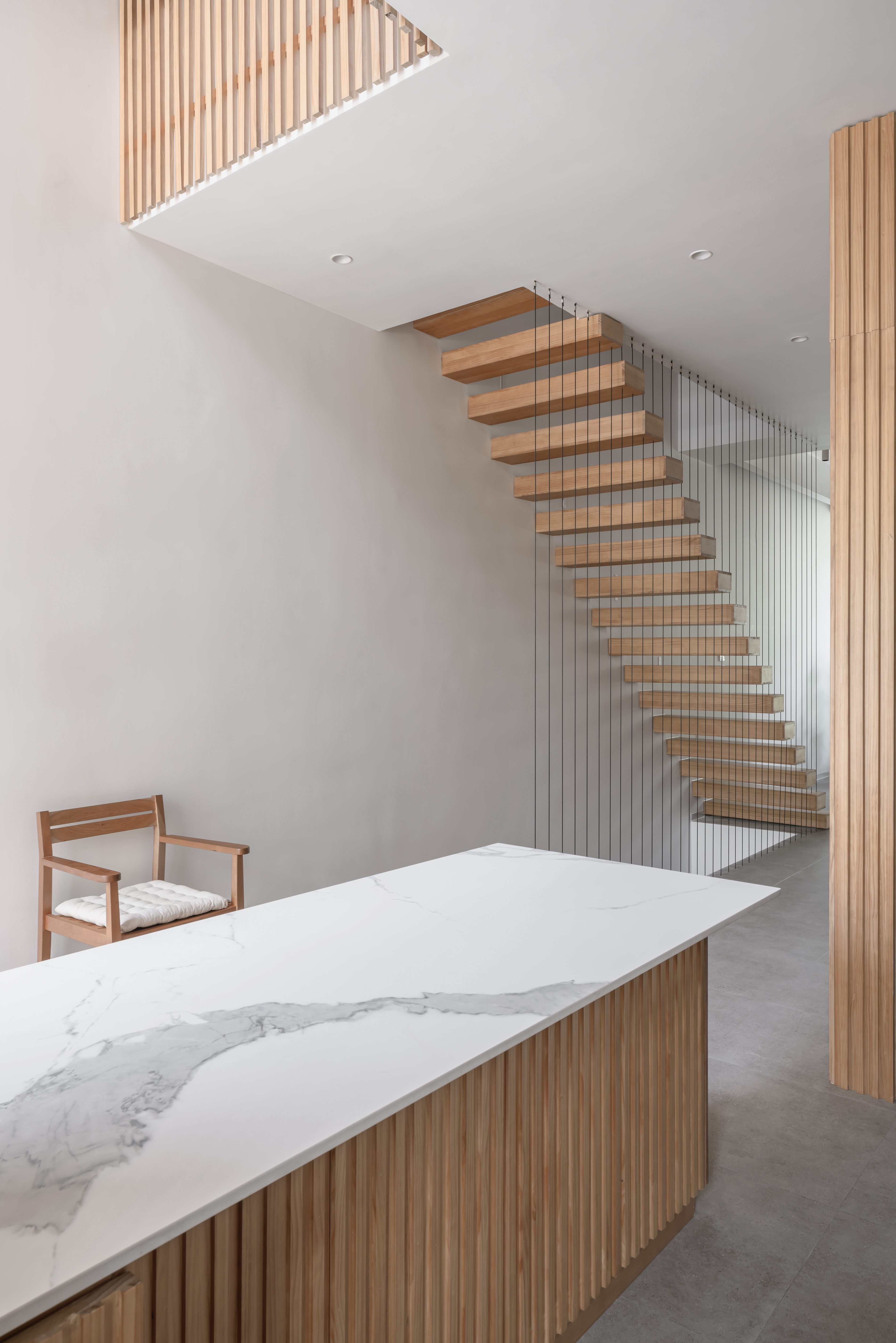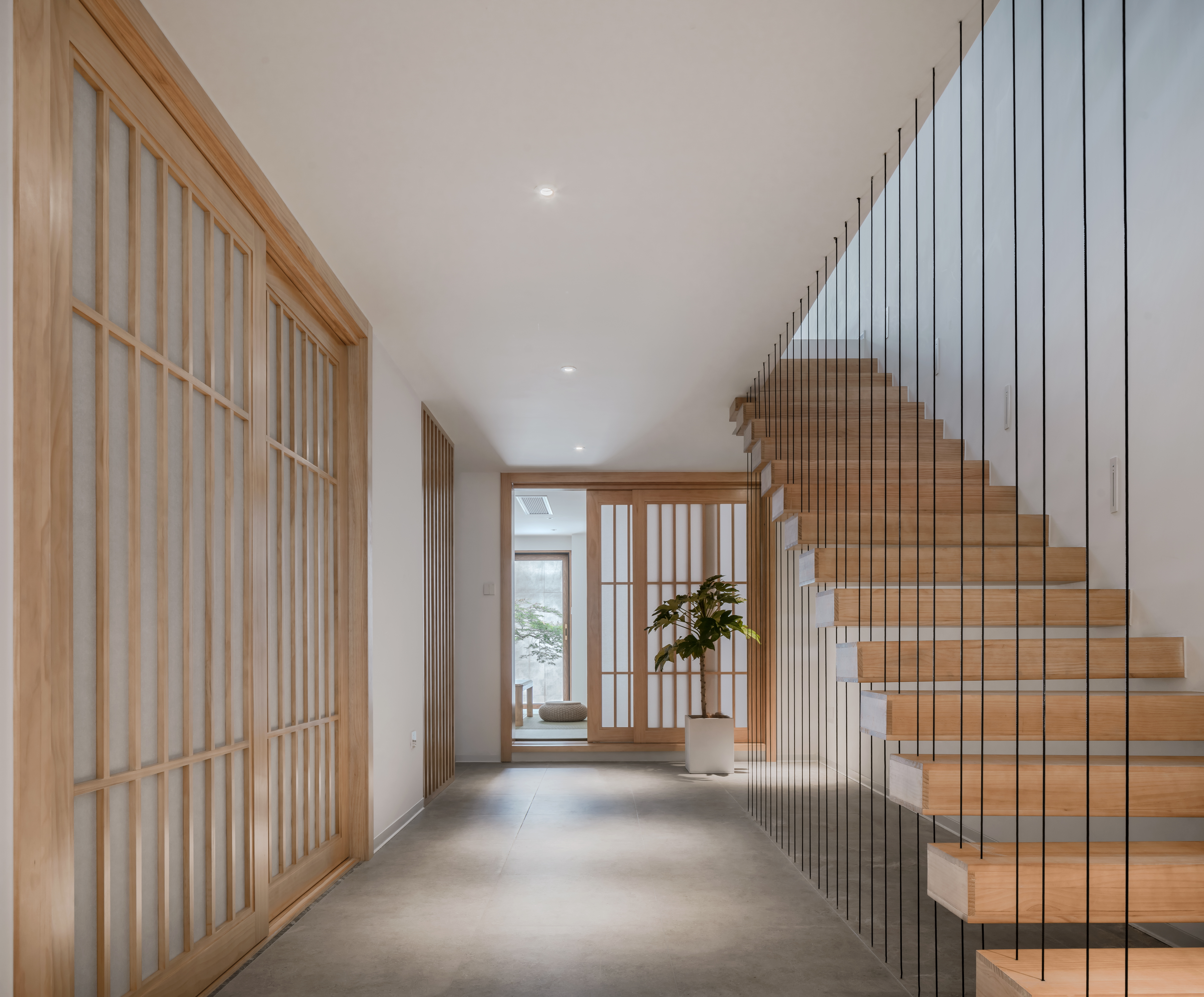 -1楼茶室入口,现代日式和风自然的高级视觉,融入了别墅的住宅之中,设计与生活“共生”,体现设计师对于材质、造型、工艺、光影等细节上。