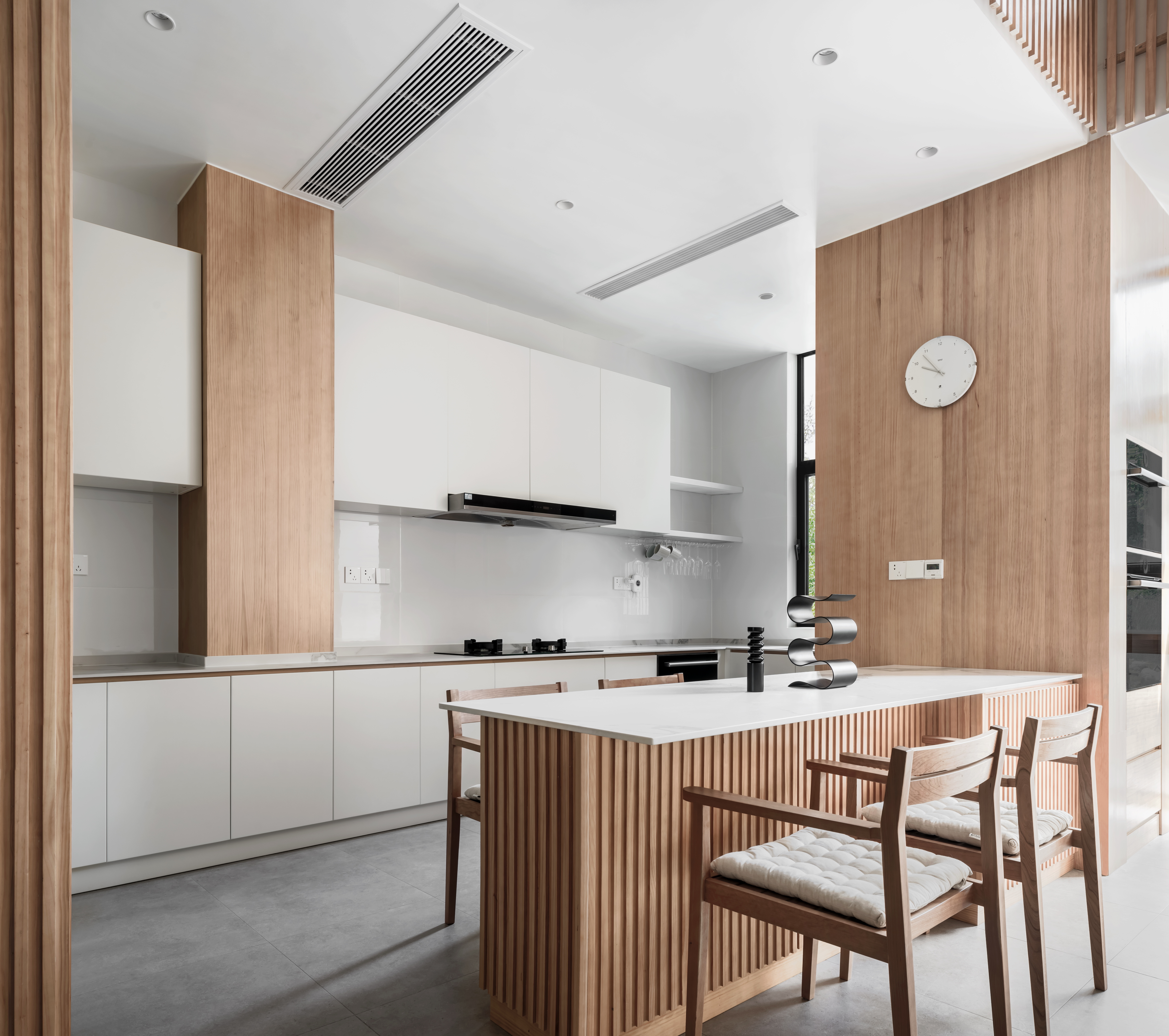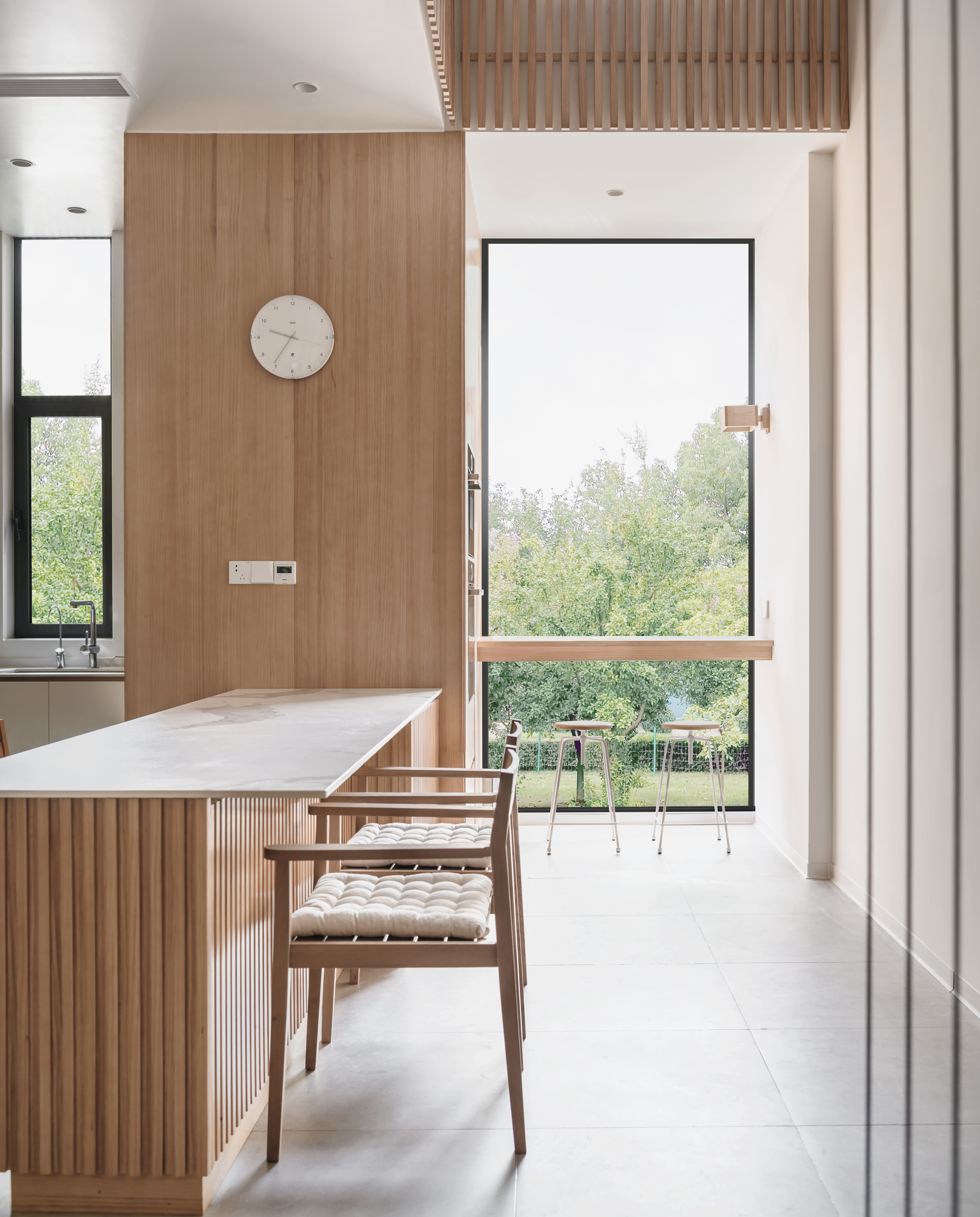 开放式的厨房和岛台提升了收纳空间,而窗边的小小早餐导台,更是增加了生活的幸福感,一边用餐一边享受窗边美景,生活本味伴随生活本真而来,用心之处不在表面,在于细节的关注与表达