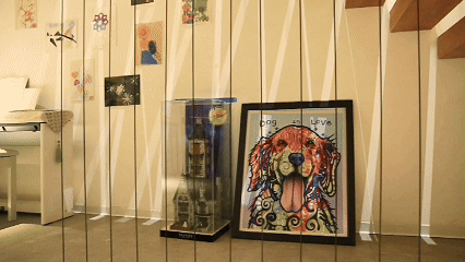 -2楼停好车上来,映入眼帘的是最爱的狗狗画像及楼梯漂亮的光影