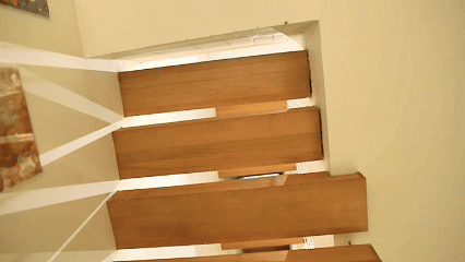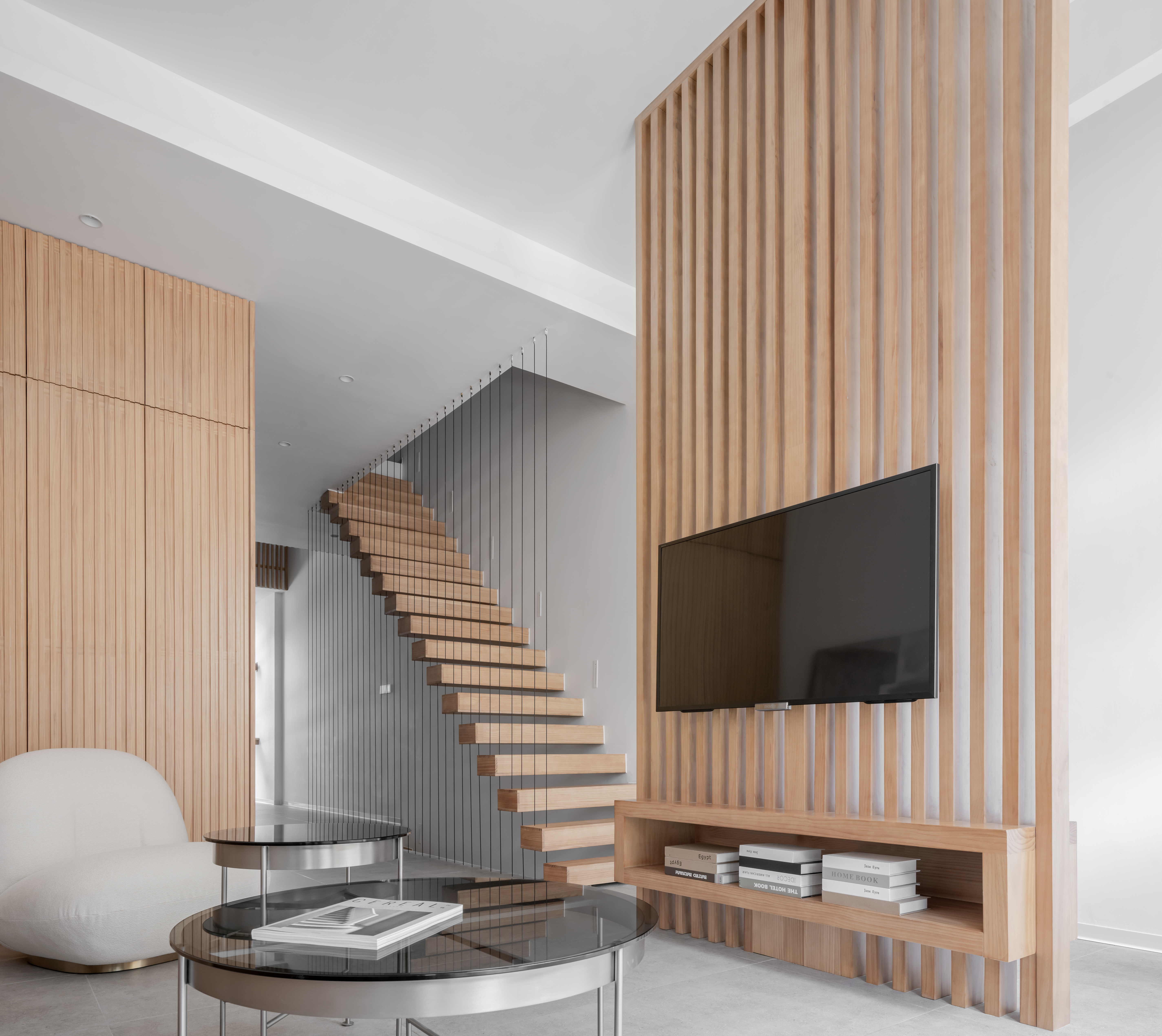 把原有的现浇楼梯拆掉,从负二楼至五楼,全部改成镂空的钢结构镂空式悬浮楼梯