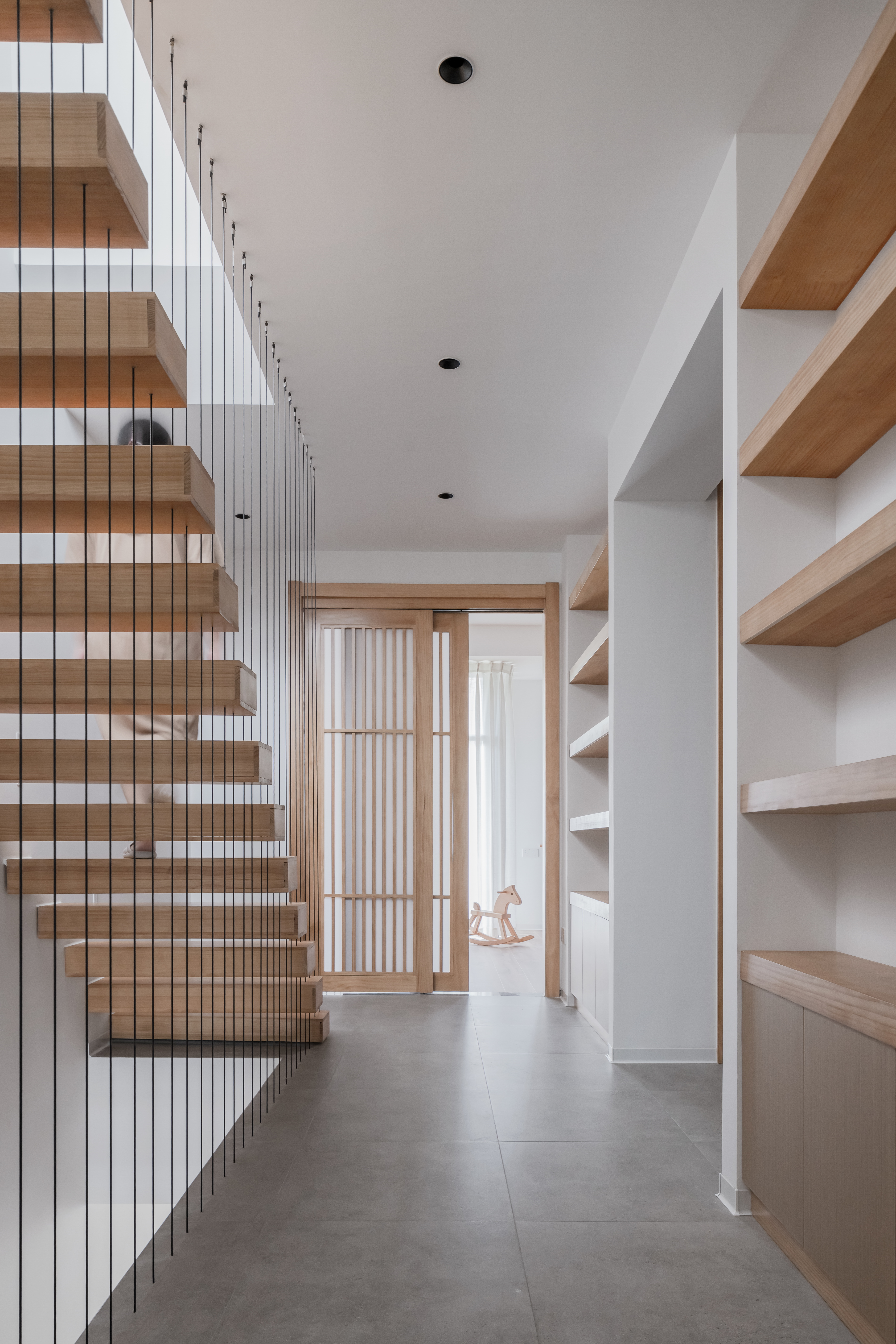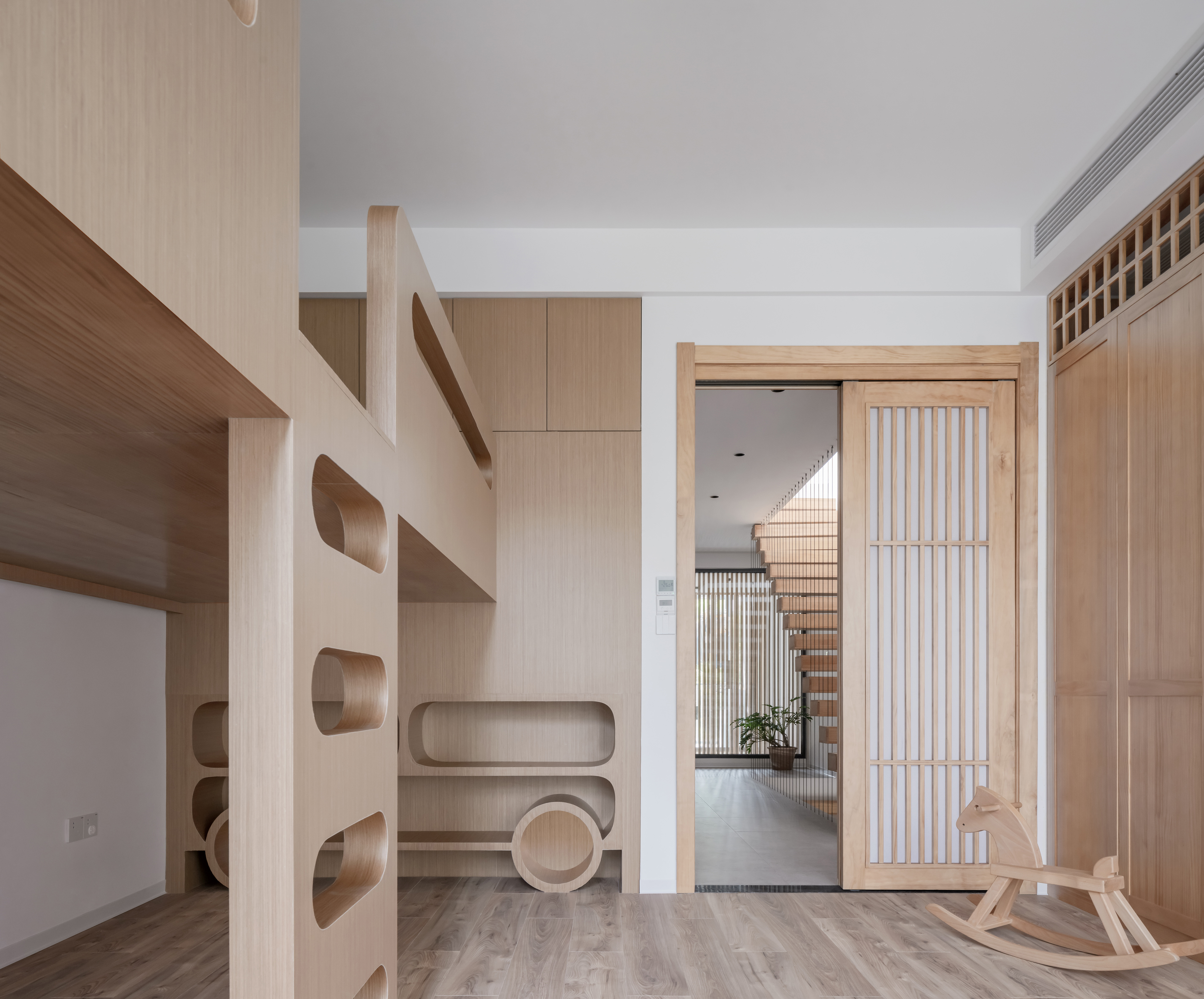 二楼主要是小朋友房间及长辈房,因此特意在楼梯过道处增加了书架,方便小朋友日常阅读