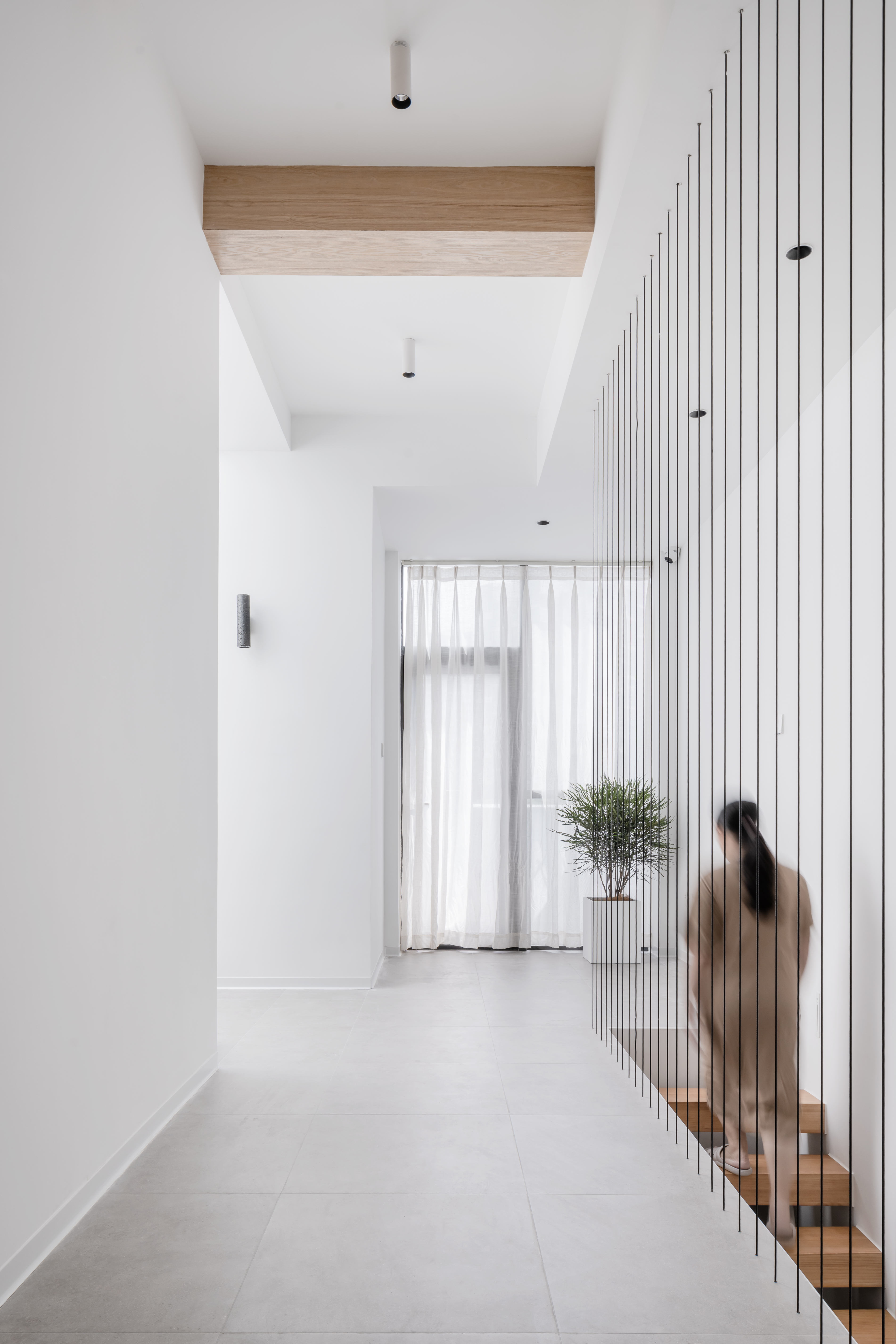从技术层面来看,由于户型是纵向一字型,采光不佳,中间又被现浇楼梯占据空间通道和采光,所有拆除原有建筑现浇楼梯,改为悬挑镂空钢索楼梯,增加采光面积和空间通透性。 -