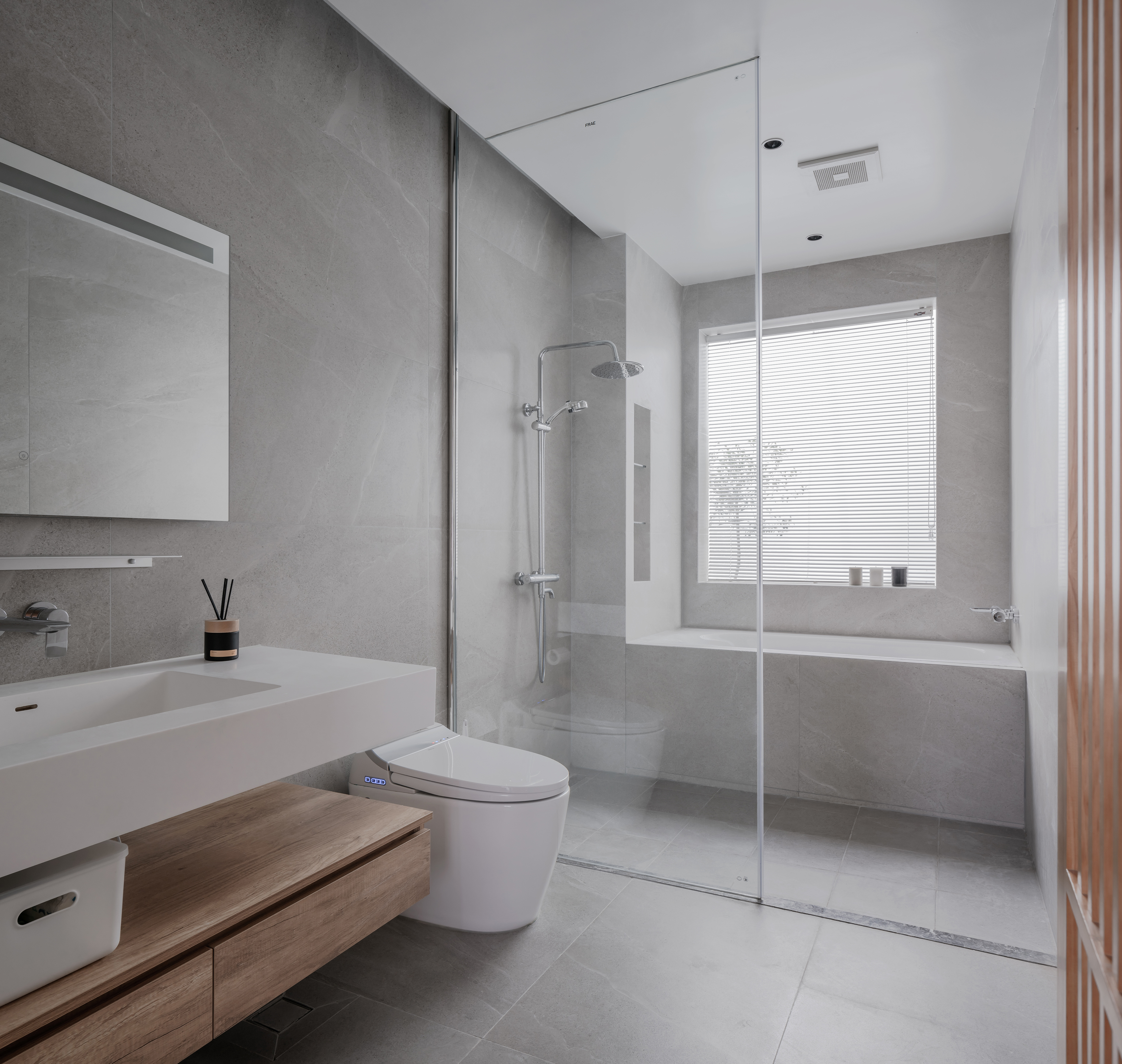 原本的主卫是个暗卫,通风和采光都不太好,设计师将浴缸后面的墙体改为磨砂玻璃,使浴室也有了充足的采光。