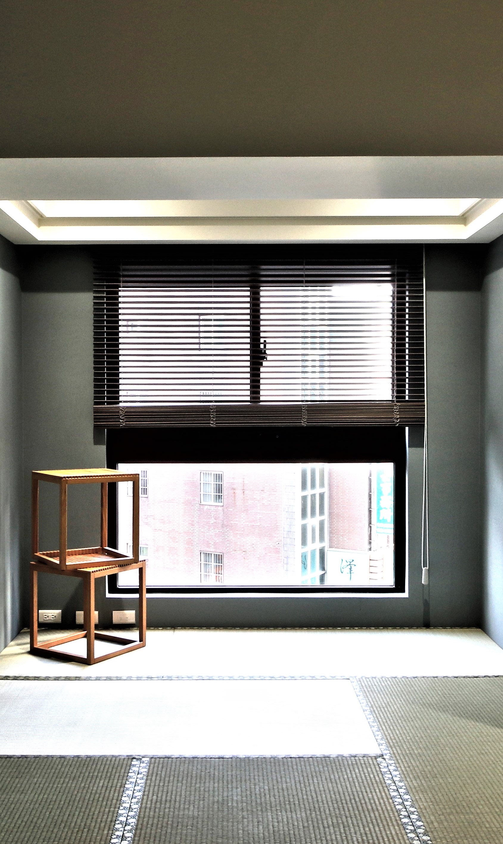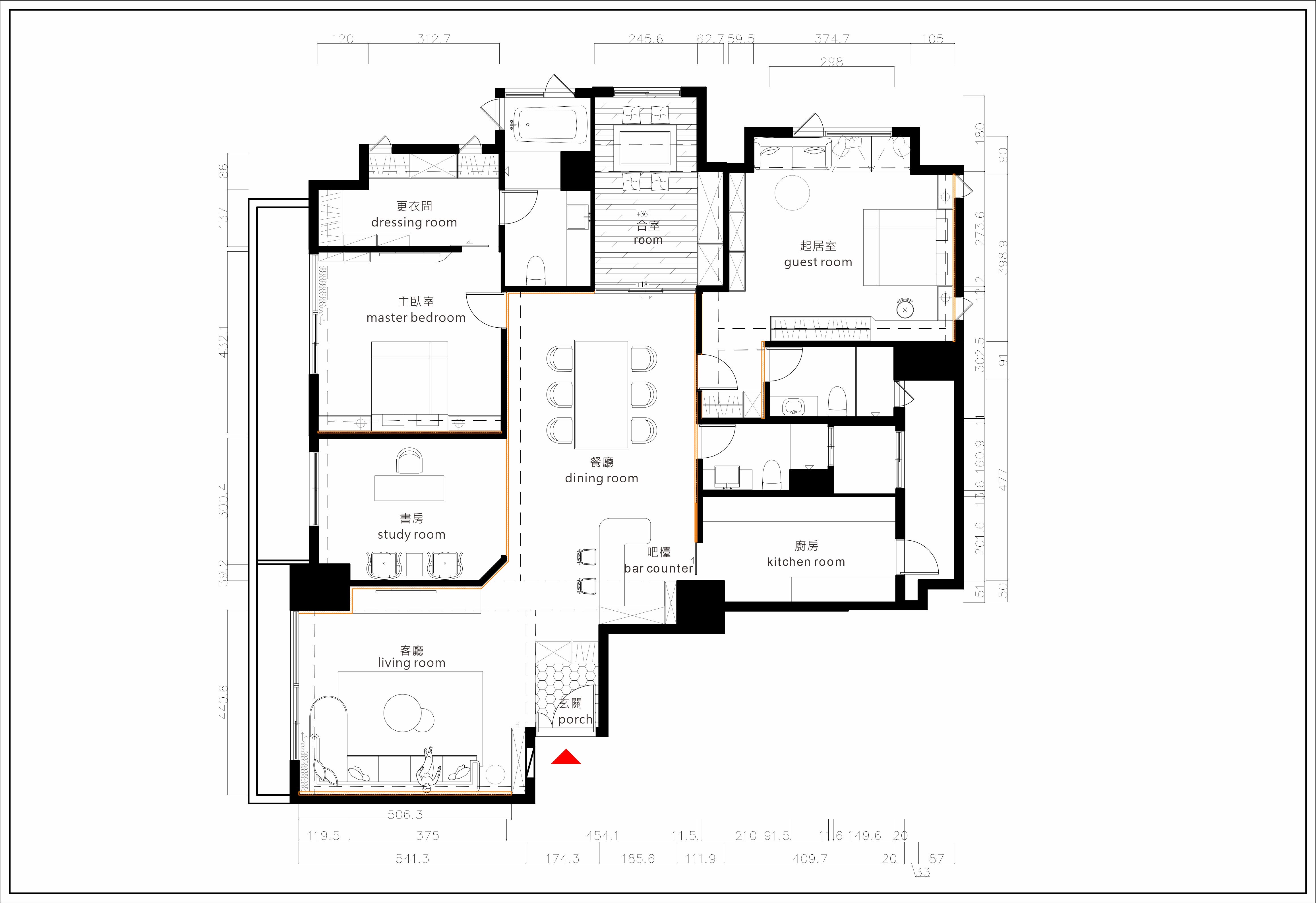 空间布局:客廳、餐廳和酒吧區組成的公共區域採用開放式,提供寬敞的視覺效果,除了無障礙連接多功能空間外,利用懸空和隔斷開闢了所需的領域,例如入口處設計有懸吊的衣櫃、帶有倒角半牆的工作區、玻璃推拉門的日式房間。為公共和私人區域的多功能用途建構了區隔。