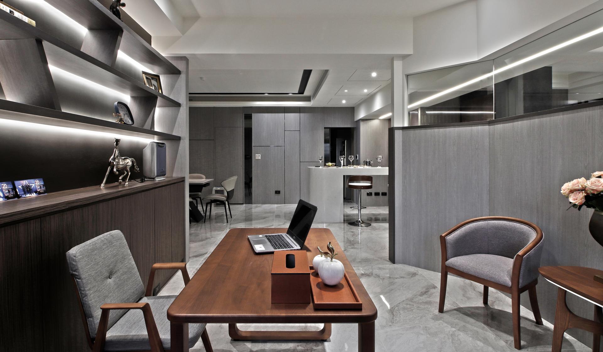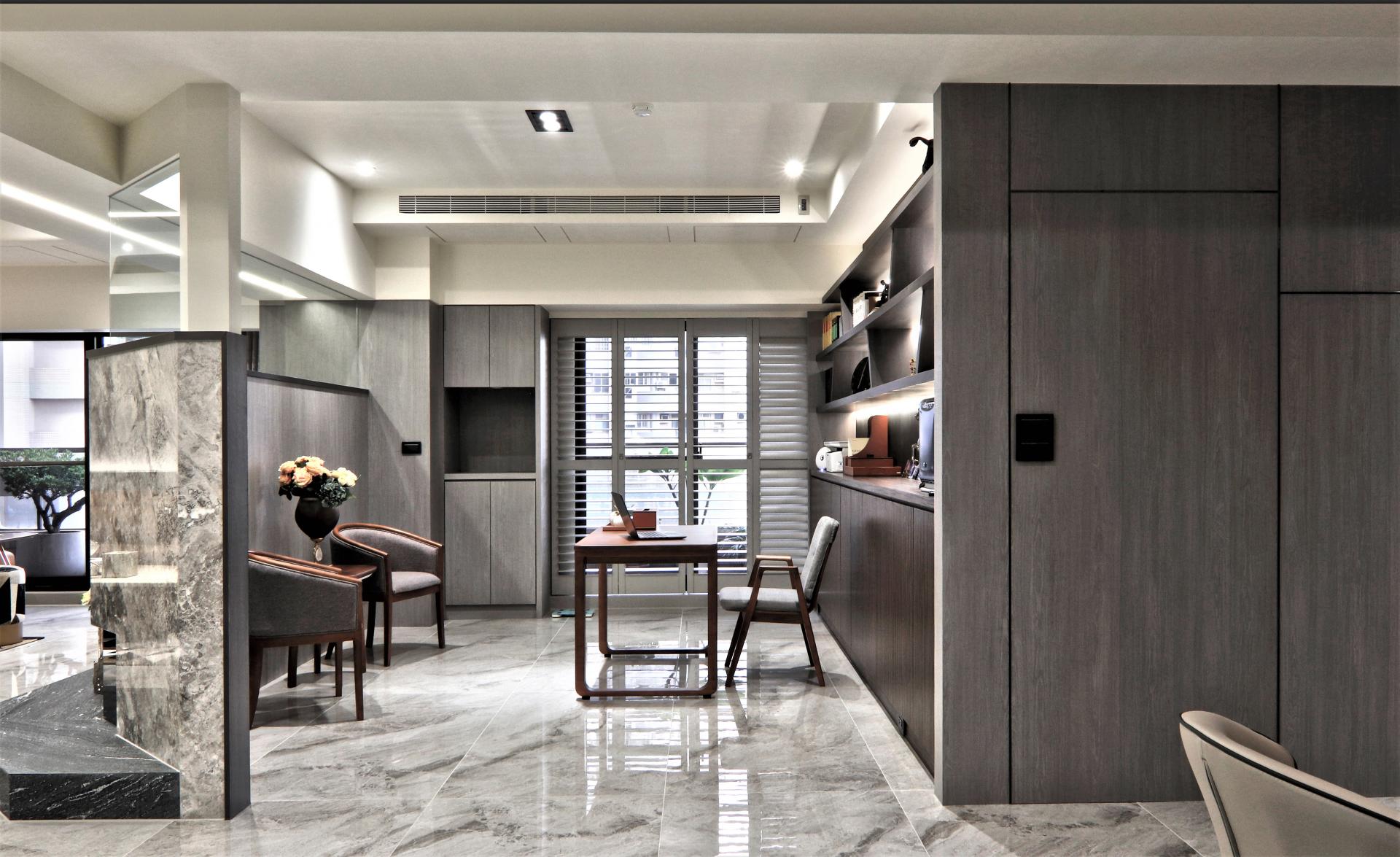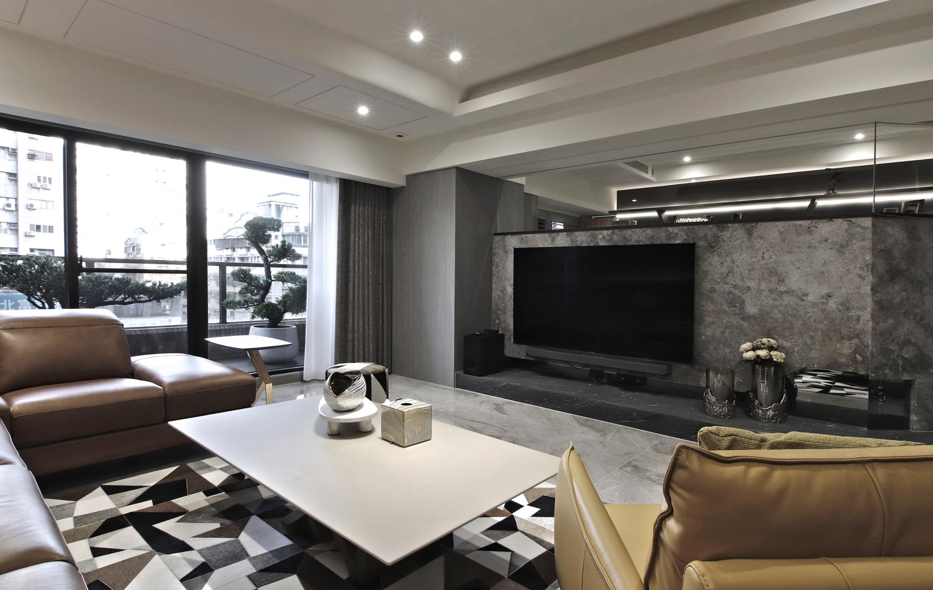 项目定位:屋主希望能將住宅打造休閒,且可招待朋友的多功能住宅,整體採用了灰色與大地色系的搭配,沙發的棕色、牆面的灰色與地板的淺色大理石形成和諧的對比,營造了溫暖又不失高級感的氛圍。