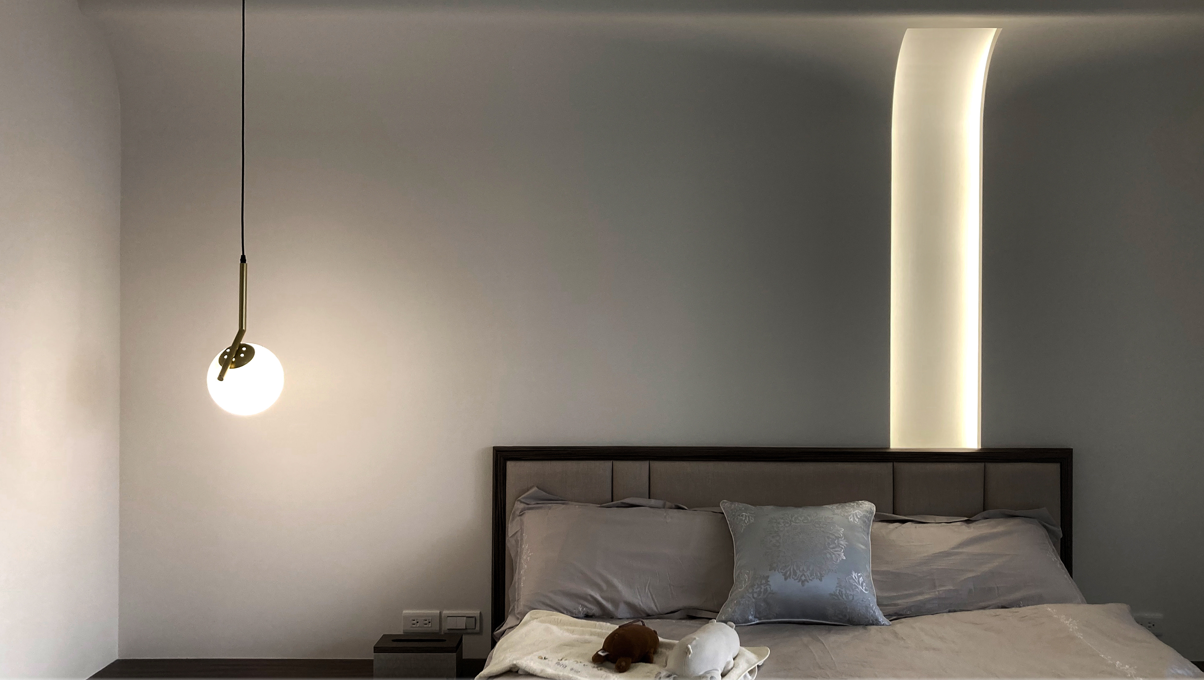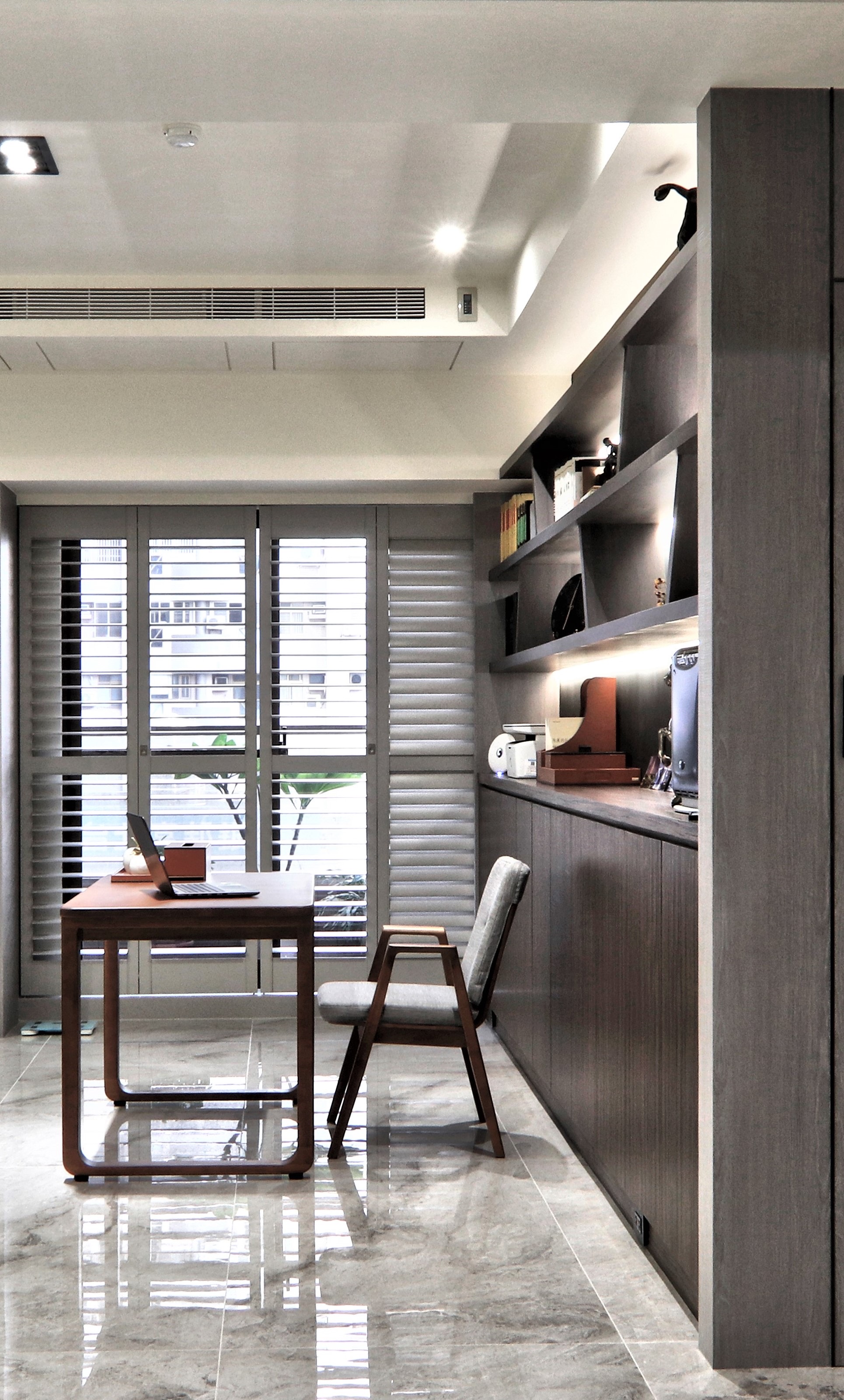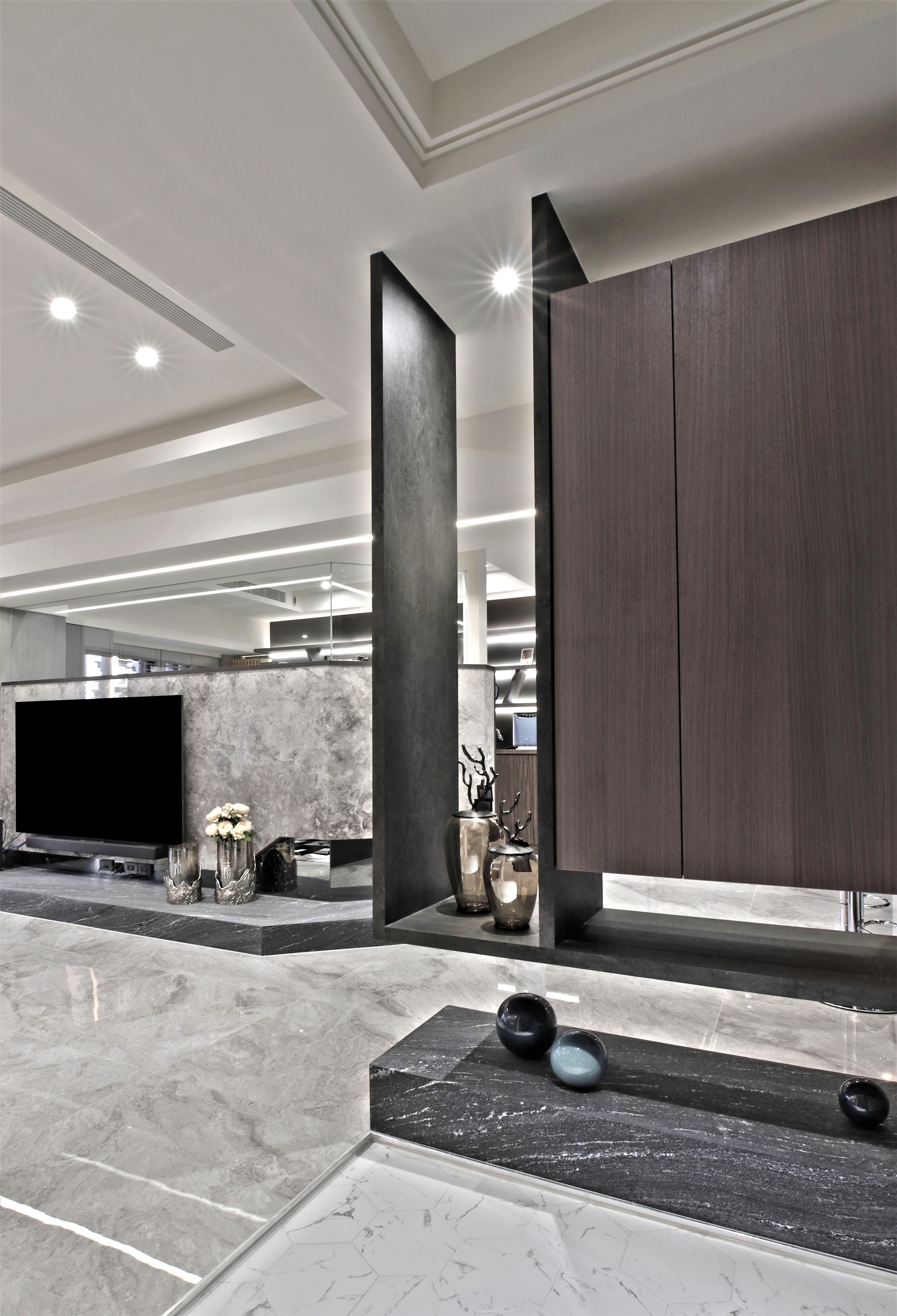 项目定位:屋主希望能將住宅打造休閒,且可招待朋友的多功能住宅,整體採用了灰色與大地色系的搭配,沙發的棕色、牆面的灰色與地板的淺色大理石形成和諧的對比,營造了溫暖又不失高級感的氛圍。