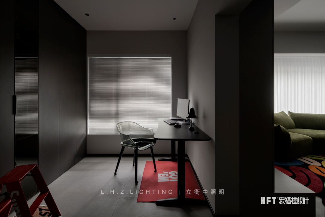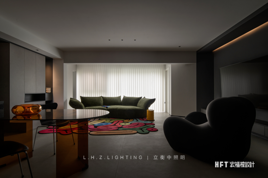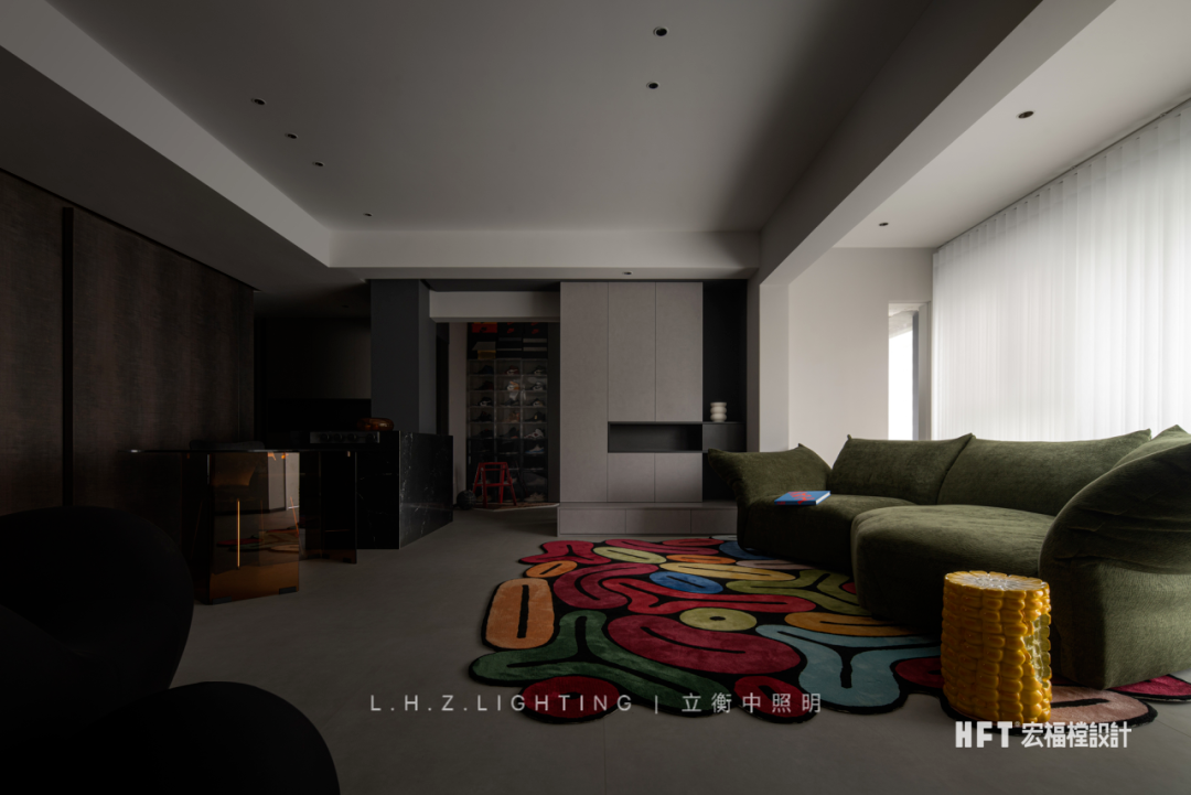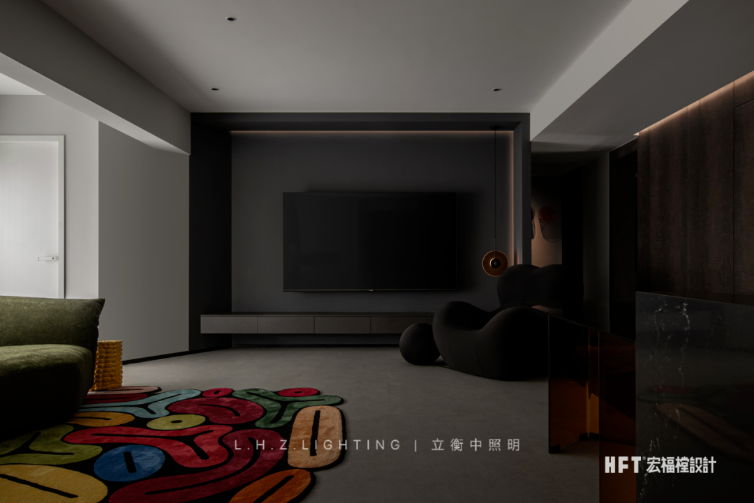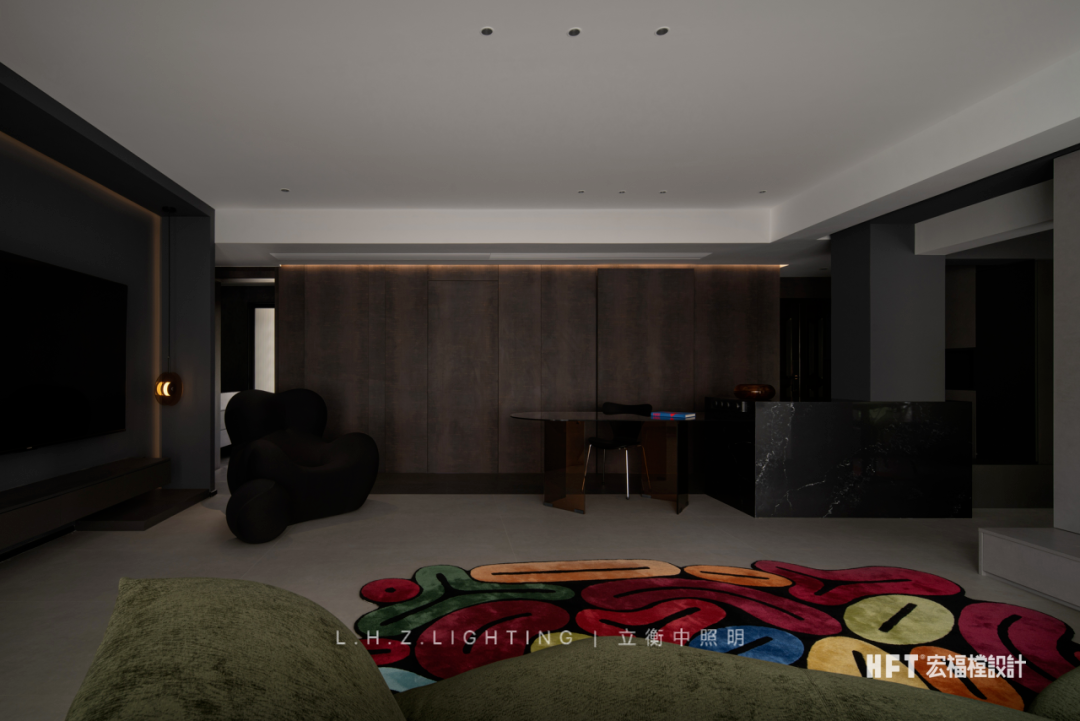 照明设计说明:130㎡艺术空间暗夜如墨,点点星光。颜色与情绪息息相关,由黑白灰粉饰的基调中注入部分色彩,中和空间温度的同时,调动多巴胺的分泌,营造愉悦感官。干净利落的线条,暗色为基调进行渲染,再以恰到好处的彩色进行搭配,活泼中不失秩序,产生安适、清新的快乐情绪,暖色灯光为整个客厅空间增添了一份暖意。蕴藏着暗黑美丽空间,优雅与沉稳被紧密包裹着,氛围灯光将材质呈现得更加纯粹使得空间充满高级感,在冷色调风格中,控制光线的数量和角度,使得空间更加亲近。黑色不再被视为一种节制,而是成为另一种形式,通过黑色和灯光的结合,呈现出独特的氛围和情绪。