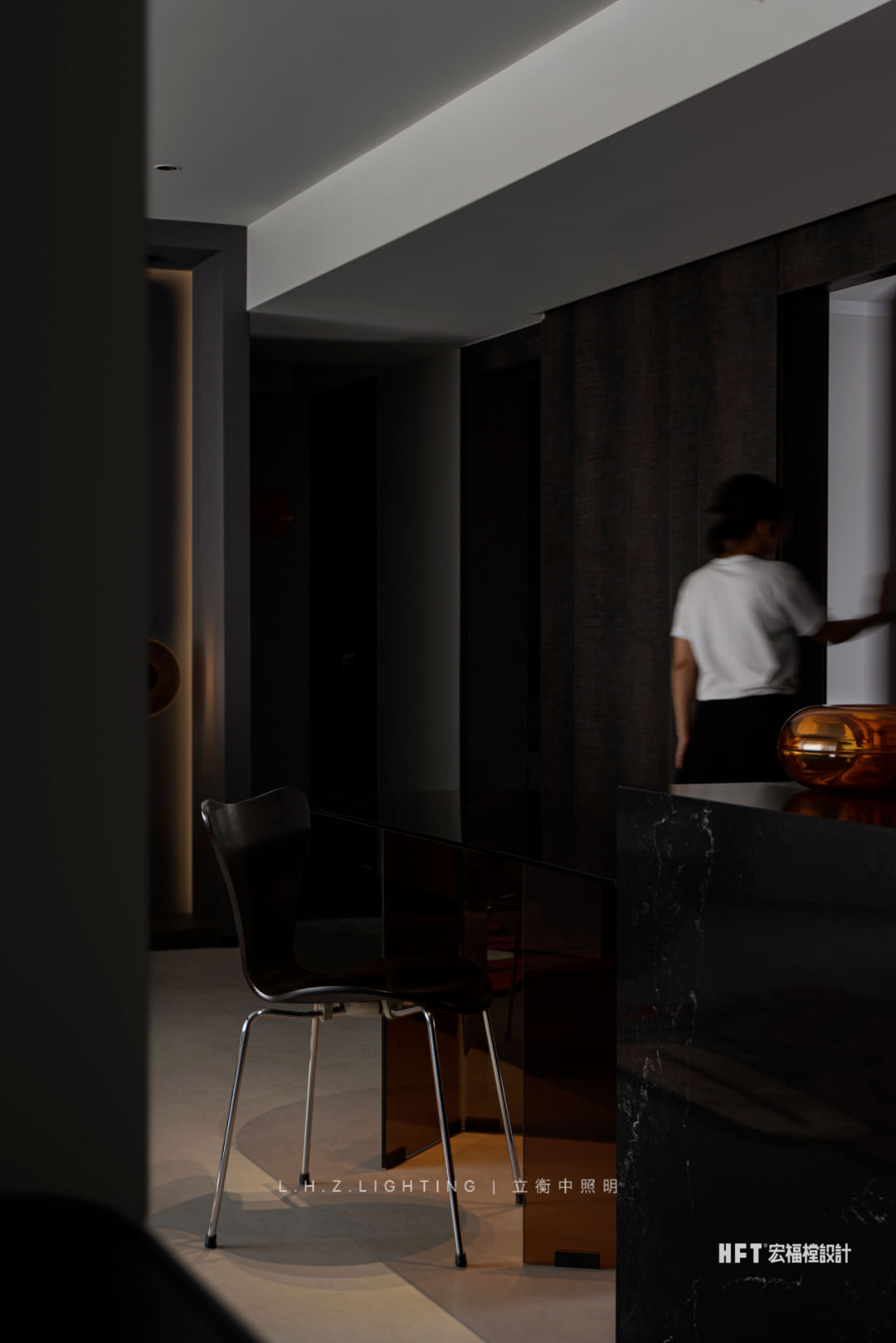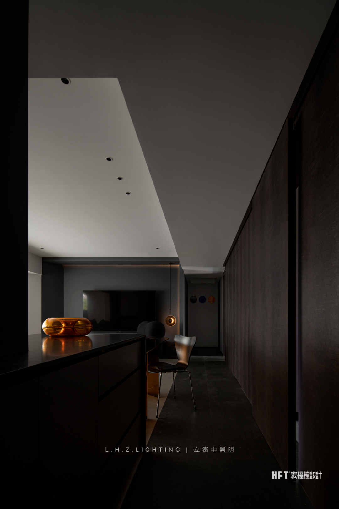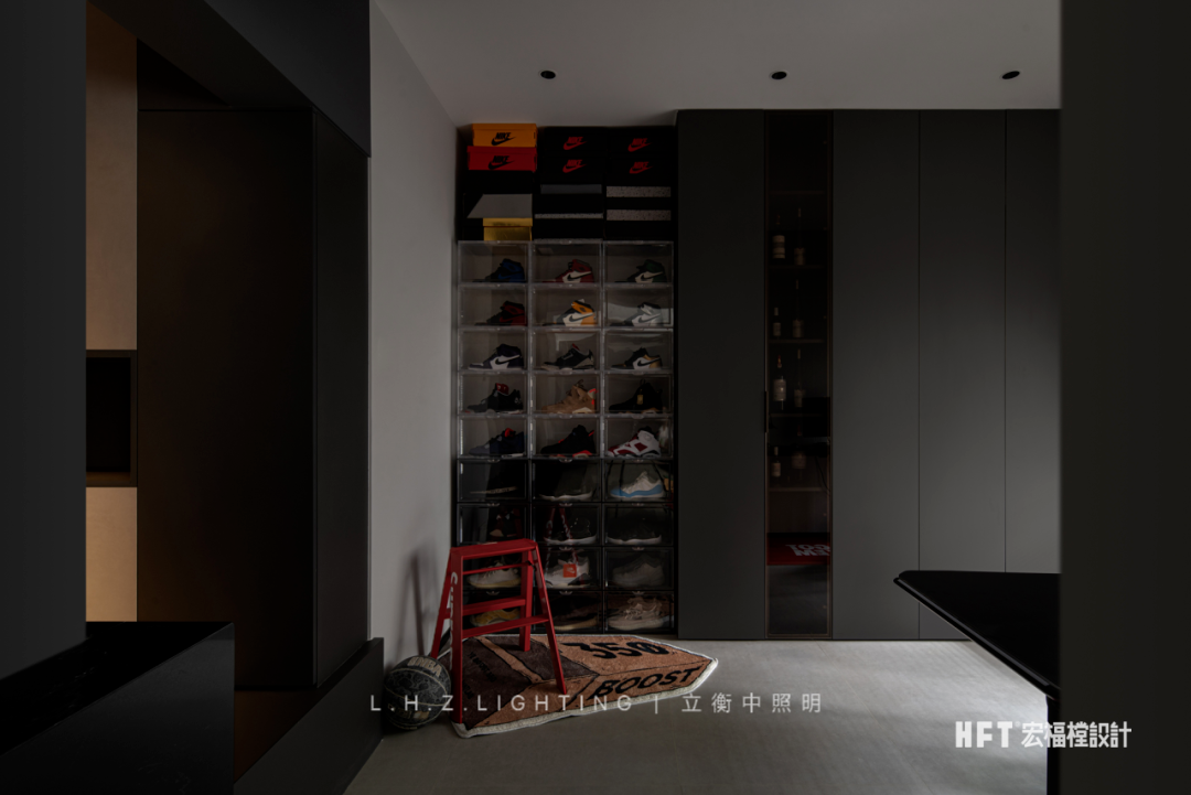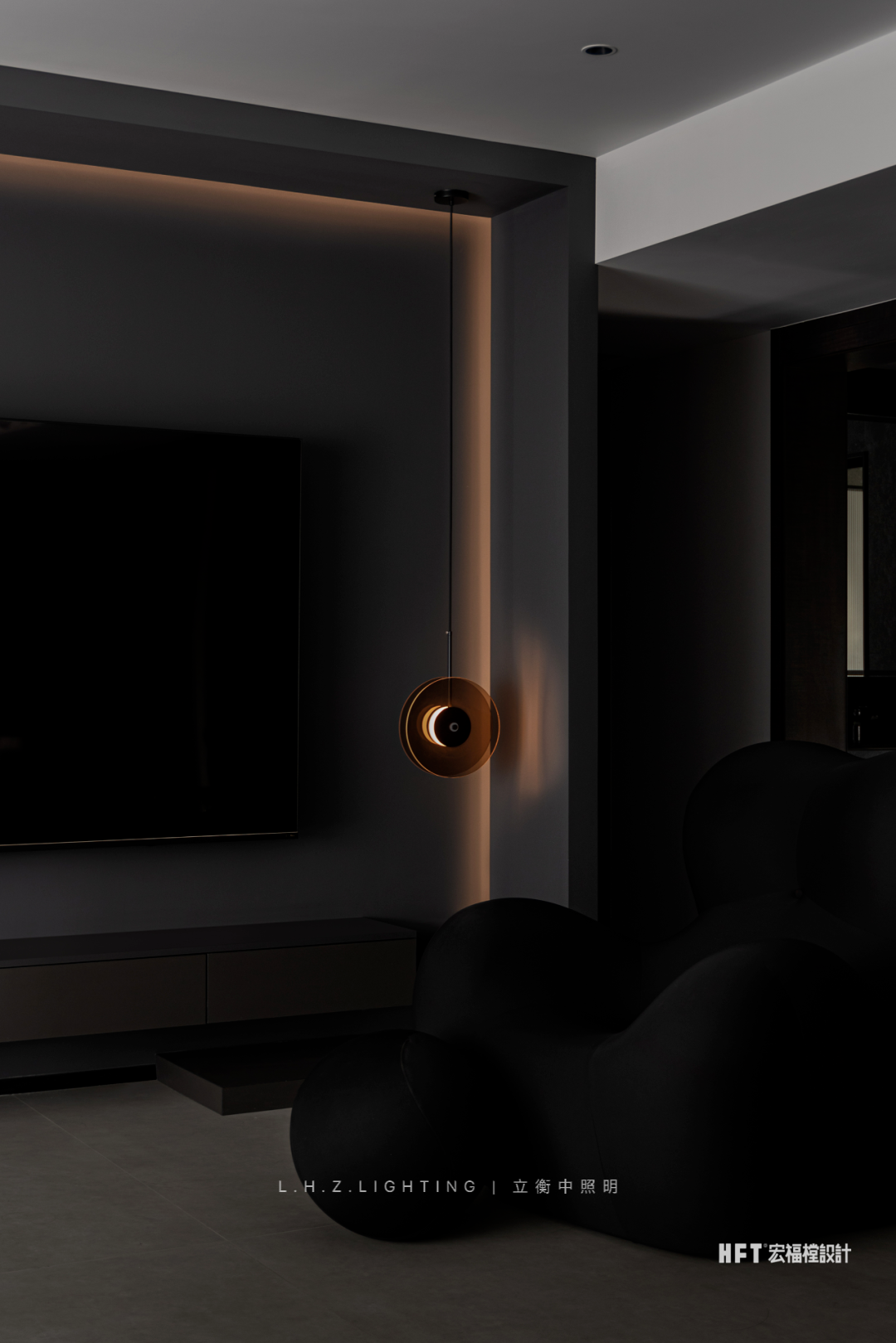 照明设计说明:130㎡艺术空间暗夜如墨,点点星光。颜色与情绪息息相关,由黑白灰粉饰的基调中注入部分色彩,中和空间温度的同时,调动多巴胺的分泌,营造愉悦感官。干净利落的线条,暗色为基调进行渲染,再以恰到好处的彩色进行搭配,活泼中不失秩序,产生安适、清新的快乐情绪,暖色灯光为整个客厅空间增添了一份暖意。蕴藏着暗黑美丽空间,优雅与沉稳被紧密包裹着,氛围灯光将材质呈现得更加纯粹使得空间充满高级感,在冷色调风格中,控制光线的数量和角度,使得空间更加亲近。黑色不再被视为一种节制,而是成为另一种形式,通过黑色和灯光的结合,呈现出独特的氛围和情绪。