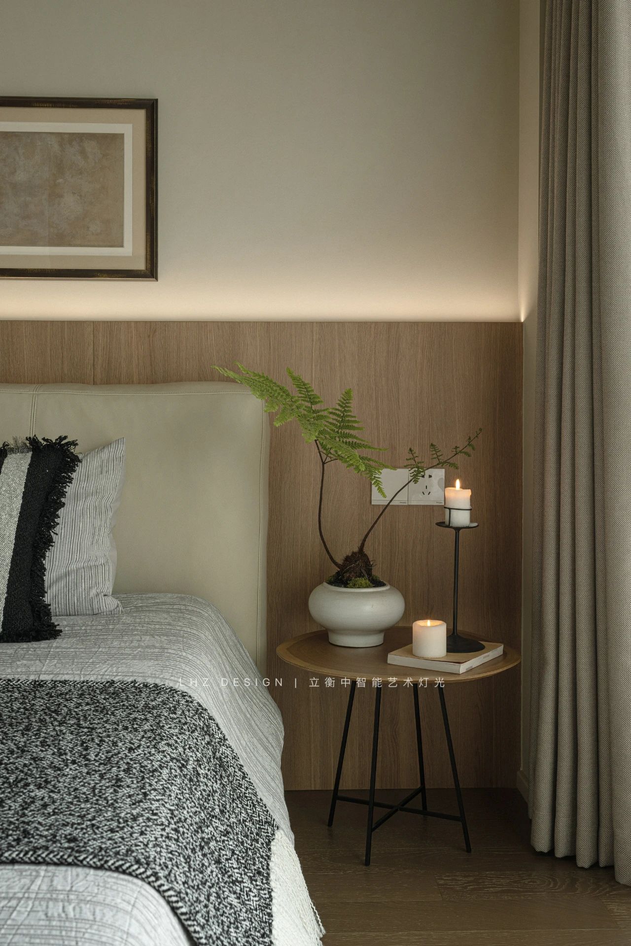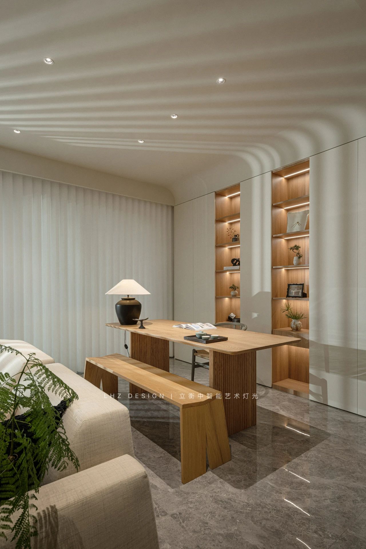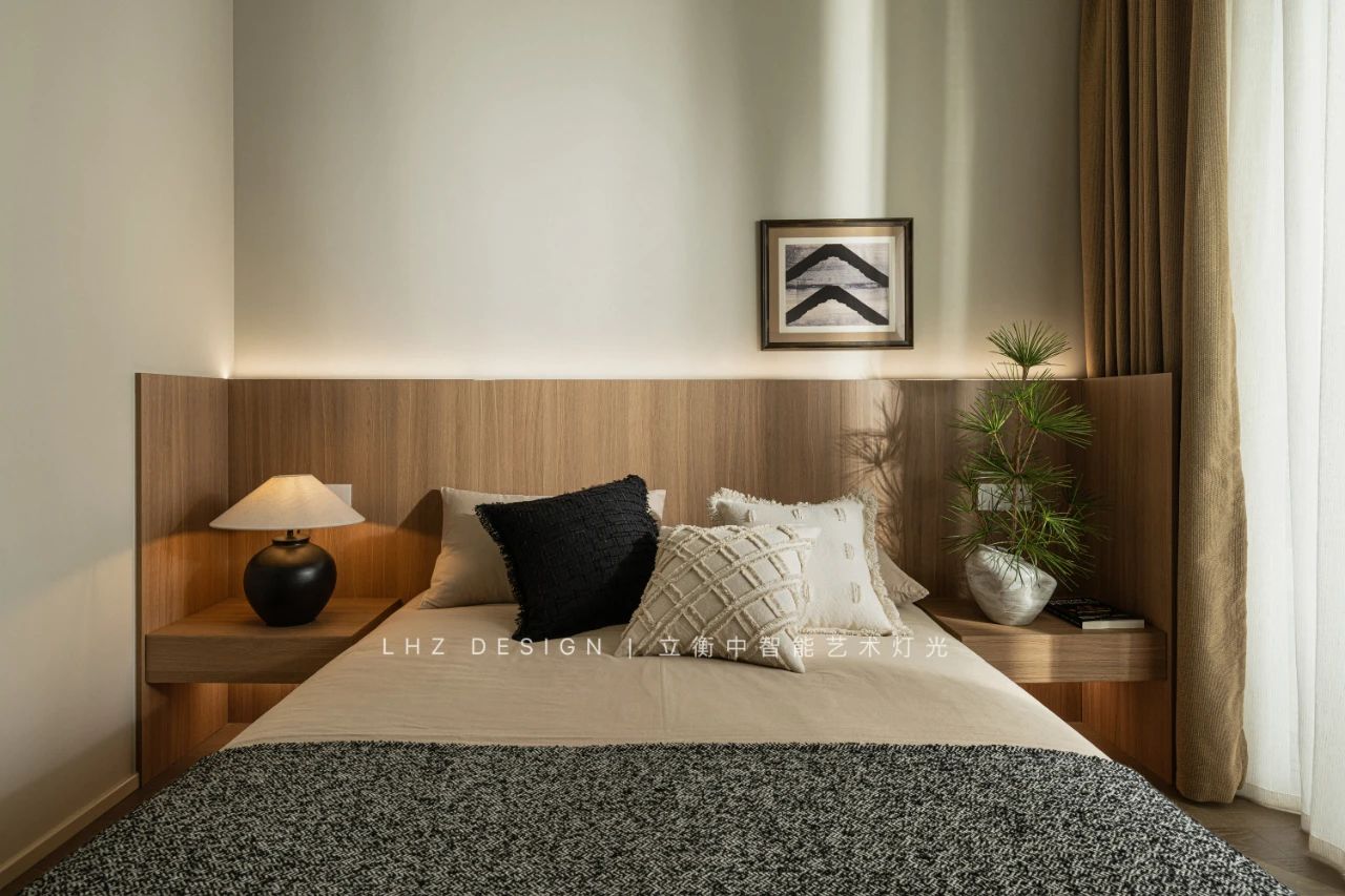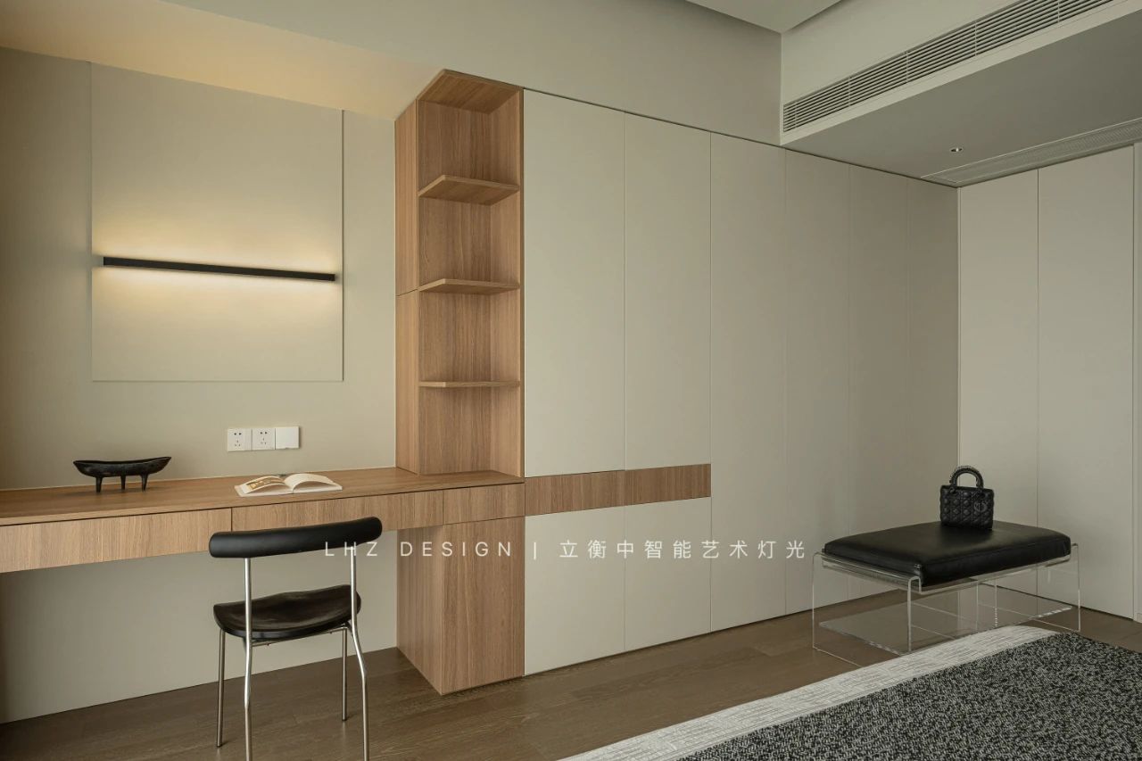 全屋选用3500K色温,除了射灯的重点照明外,也增加了氛围感设计,搭配台灯、灯带增添氛围光,在不同层次的光影铺设下,整个空间浸润着细腻美学。时间变换,光影升温,空间沉浸于柔光散射下的层次渐变,演绎现实与浪漫交织的生活剧场。