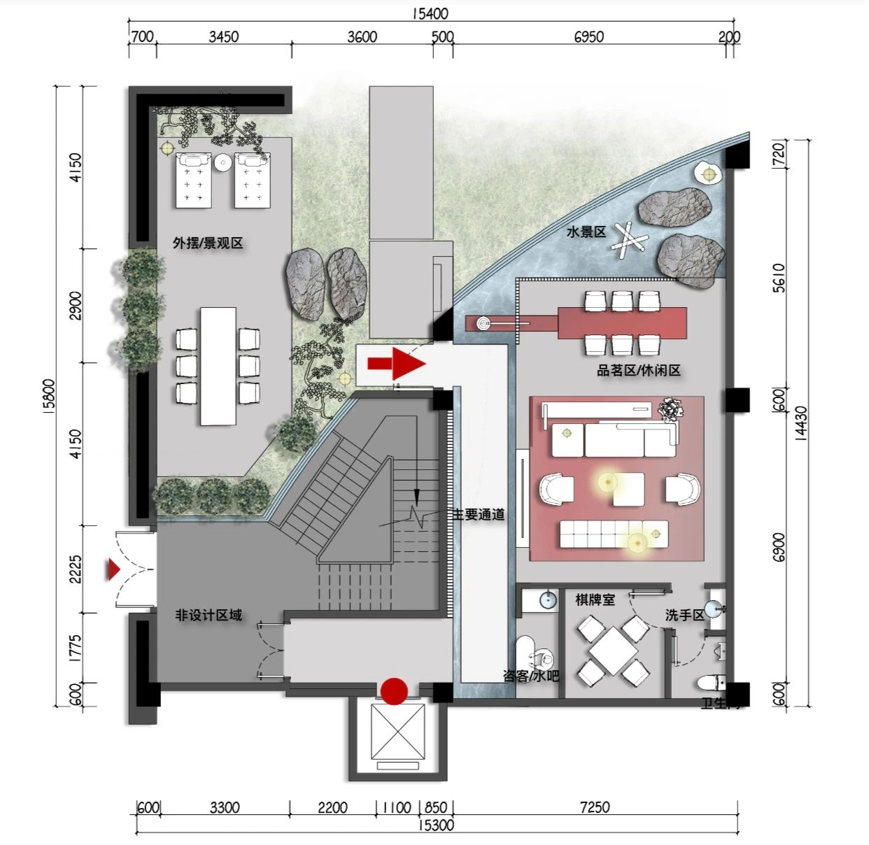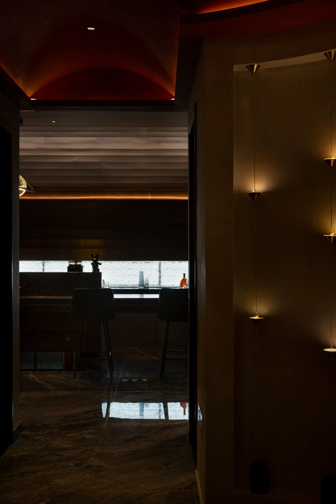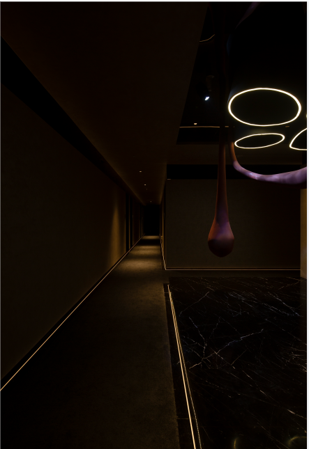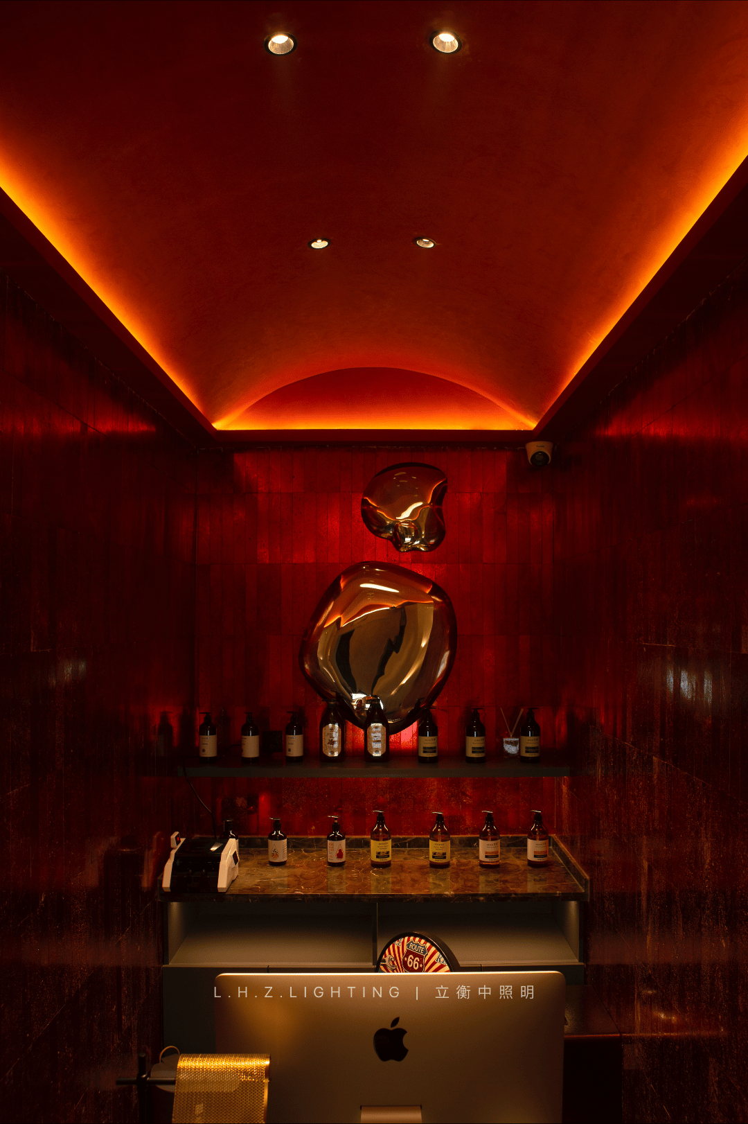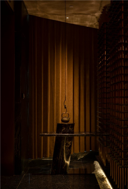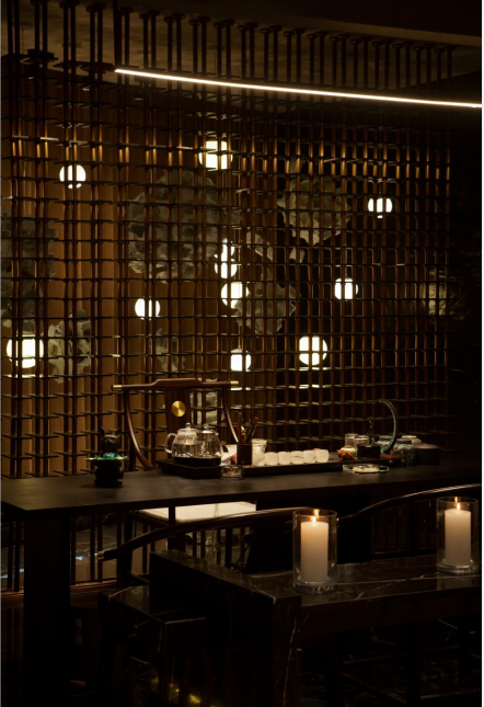 照明设计说明:内部空间顶面灯光打出了复古红,拉开了怀旧的画面,续写故事留住的篇章。直线引入灯光线的前天,予以光为引路者,灵悦之境,静觅自我。空气中弥漫着茶叶的香气,大道至简,取法自然,借光影生隐朦胧之美,注入空间应有的静谧的同时有着自由,时间静止,停下脚步,释放身心压力,得到新生的蜕变,设计的用心之处,正式调动了视觉、听觉、嗅觉等感官,使人内心平静下来,深陷空间幽静安宁之中。