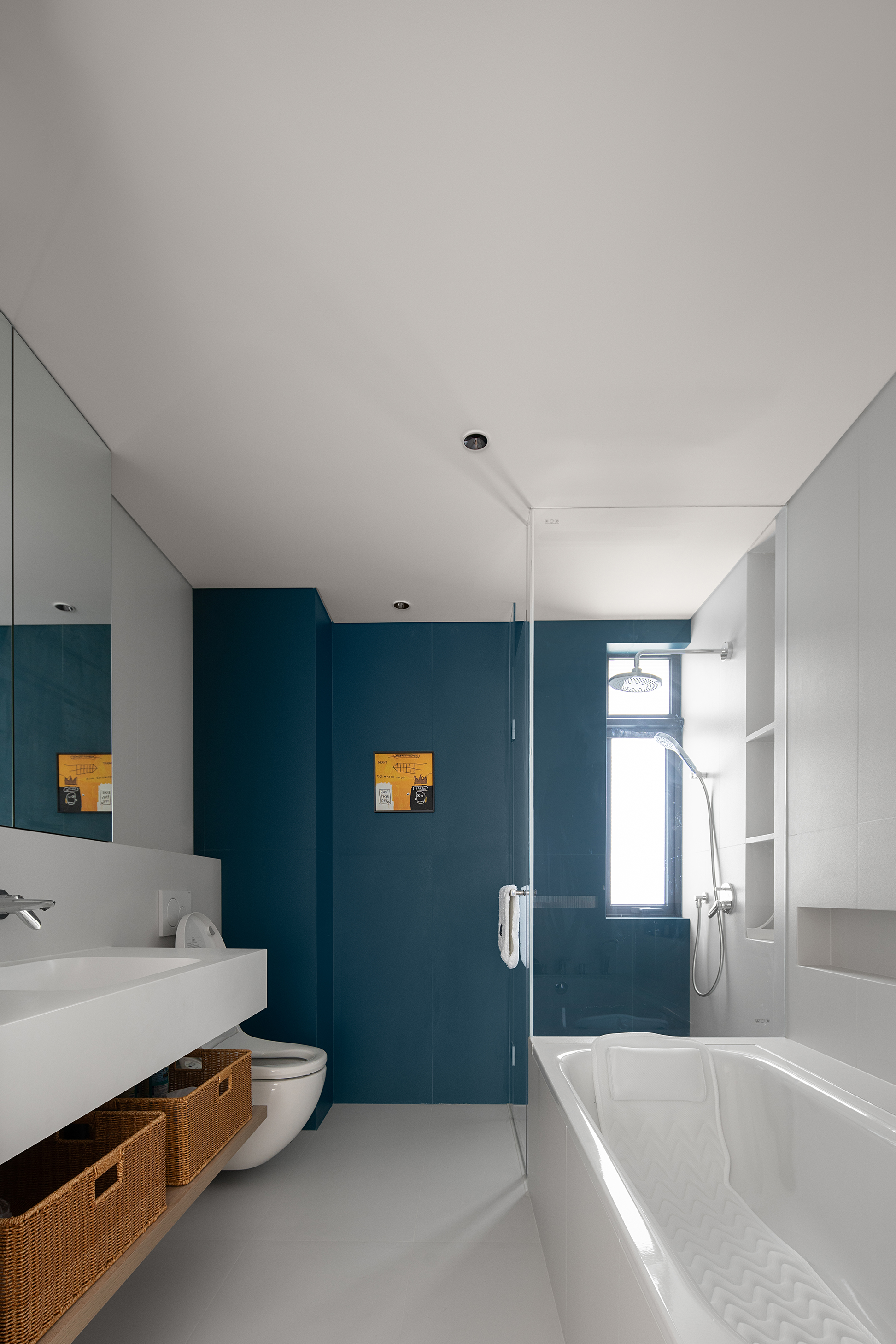 原本主卫空间狭小拥挤,设计师将墙体向外推扩大主卫面积,增加浴缸由此空间更舒适,悬浮洗手台和干湿分离的设计更利于日常使用。