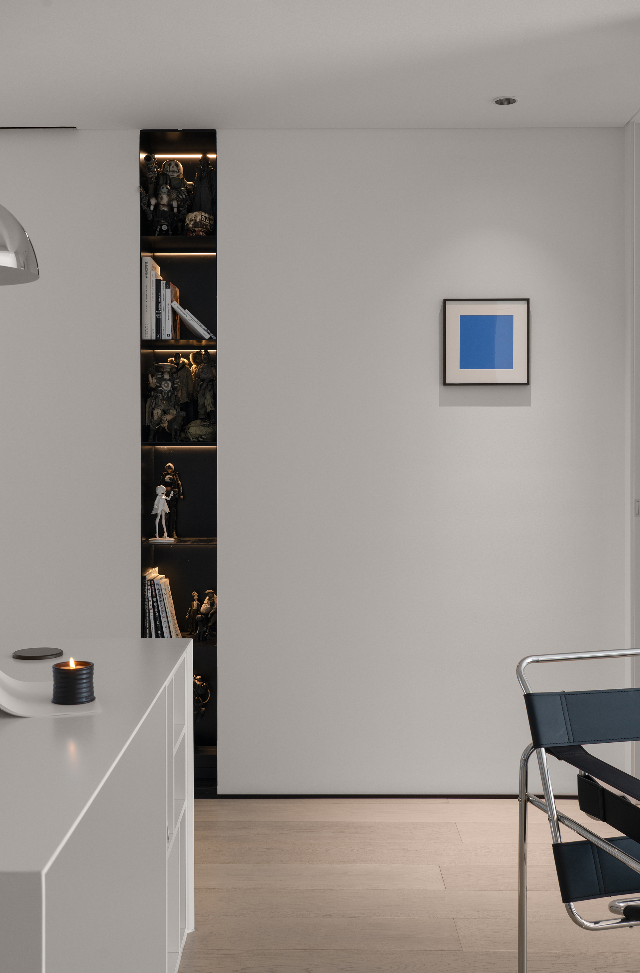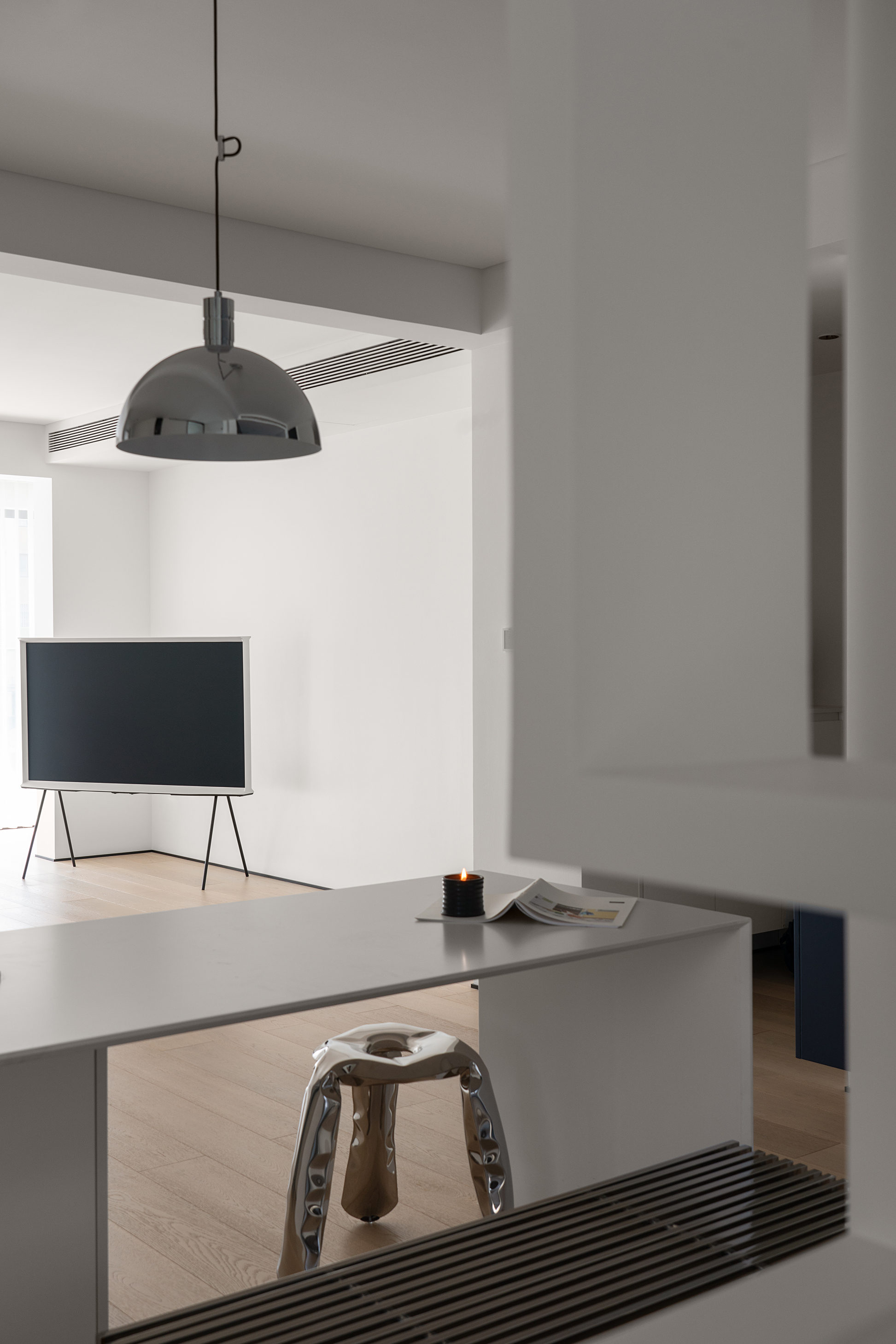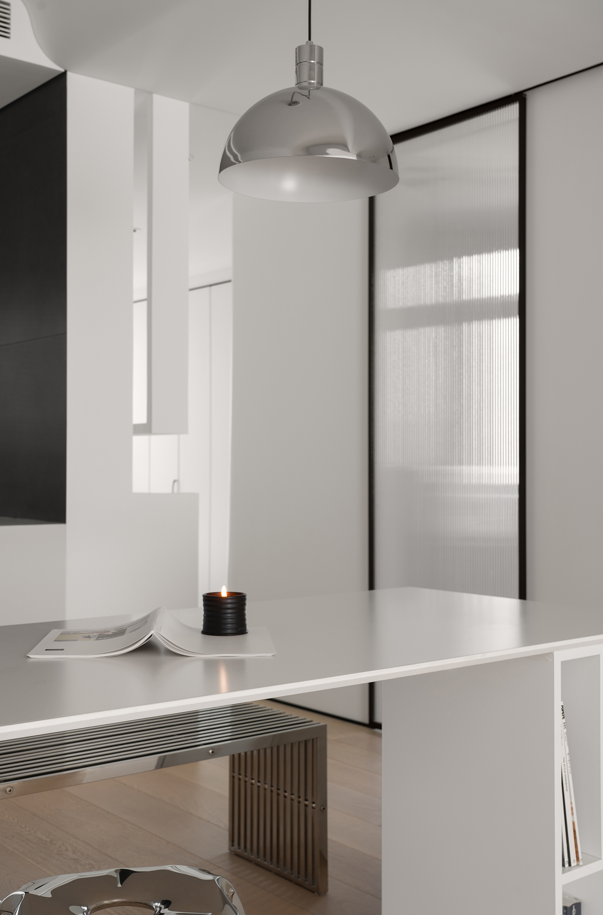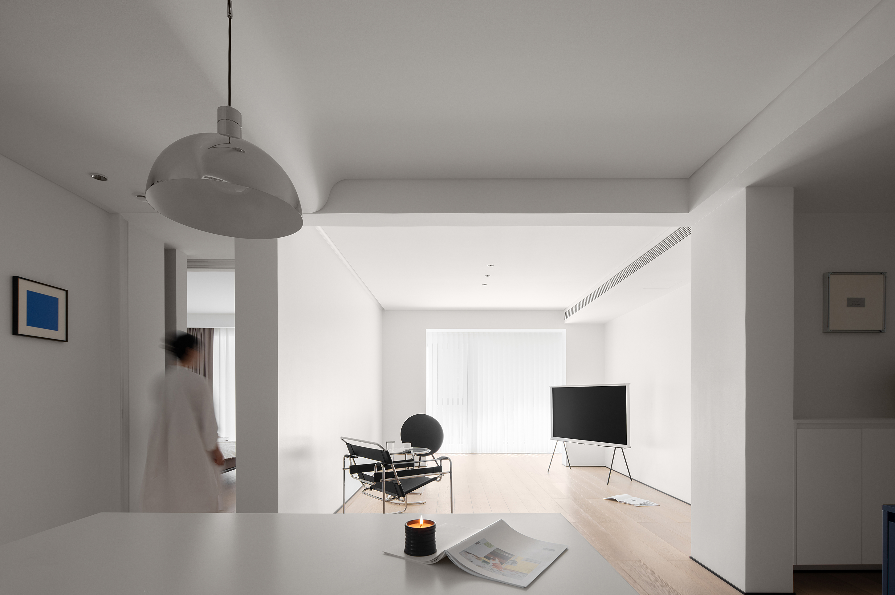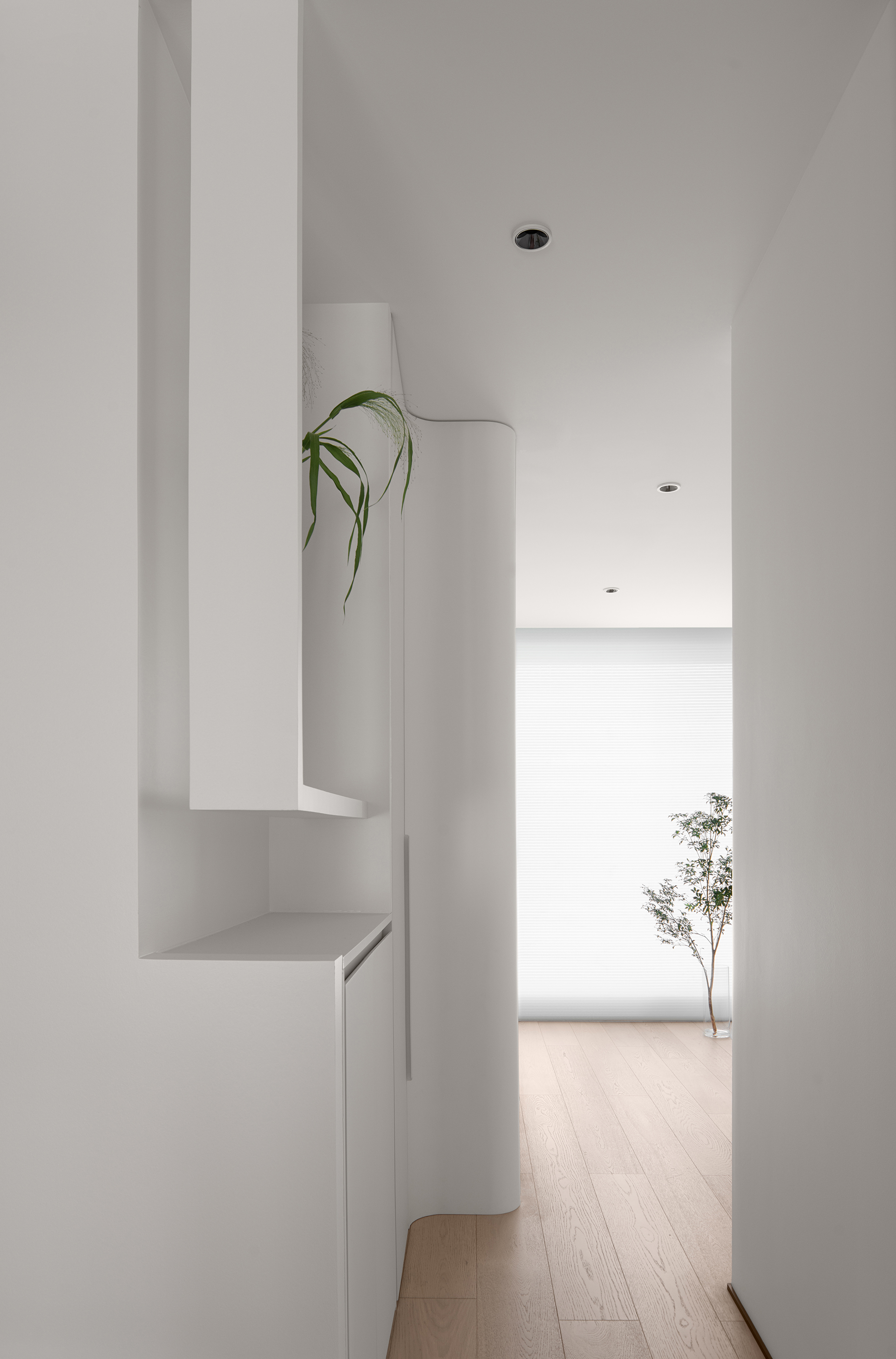 为了达到极简的效果,整个房子墙顶同色,极简踢脚线、弧形包梁,这些细节让空间更有质感,置身其中仿佛梦中的孤岛,让人沉静自然。