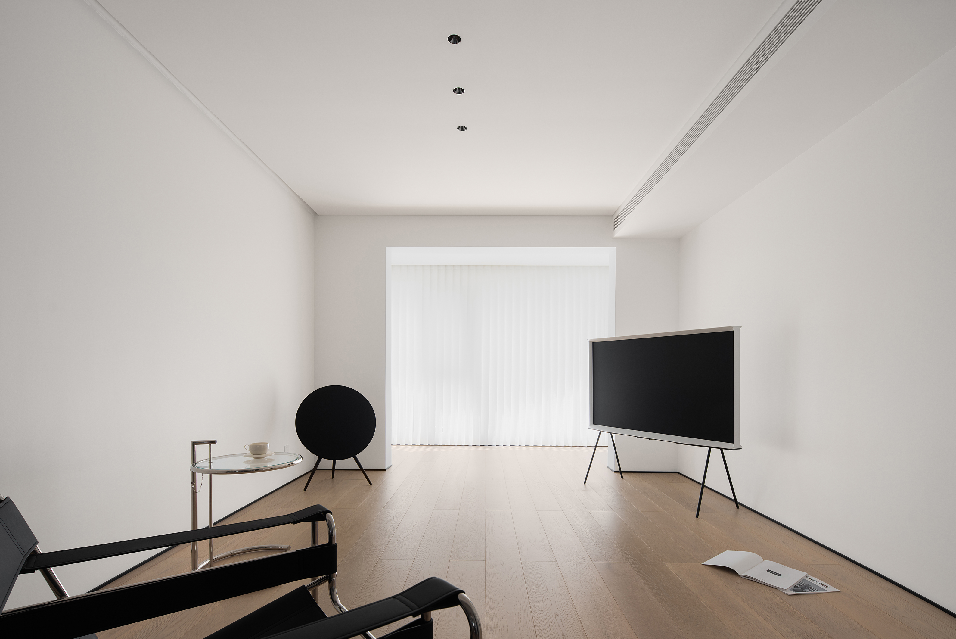 客厅区域设计超极简风格,无沙发、无电视背景墙、无茶几的客厅布局让空间更加灵活。打破传统的设计思路,而不是做复杂的堆砌。
