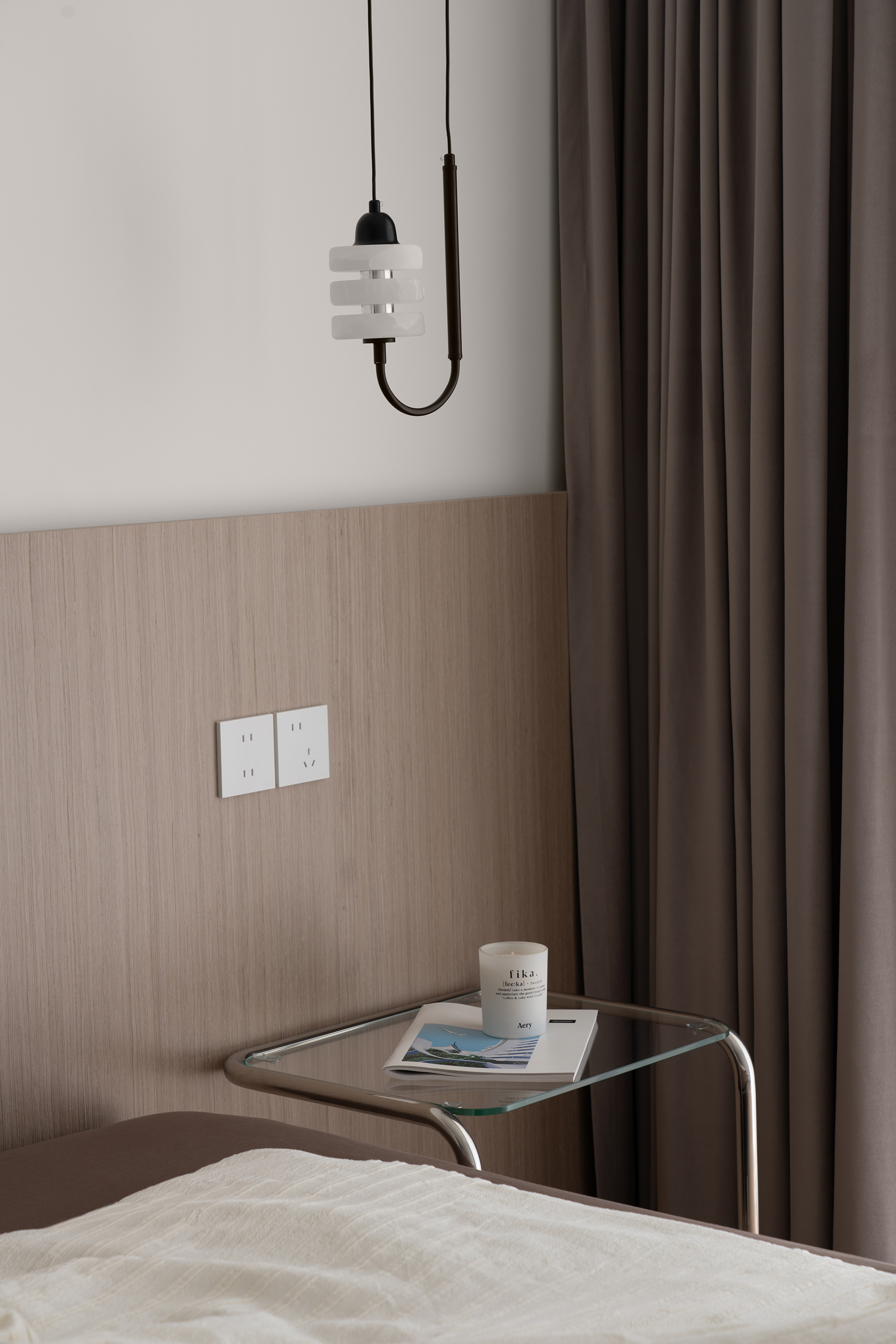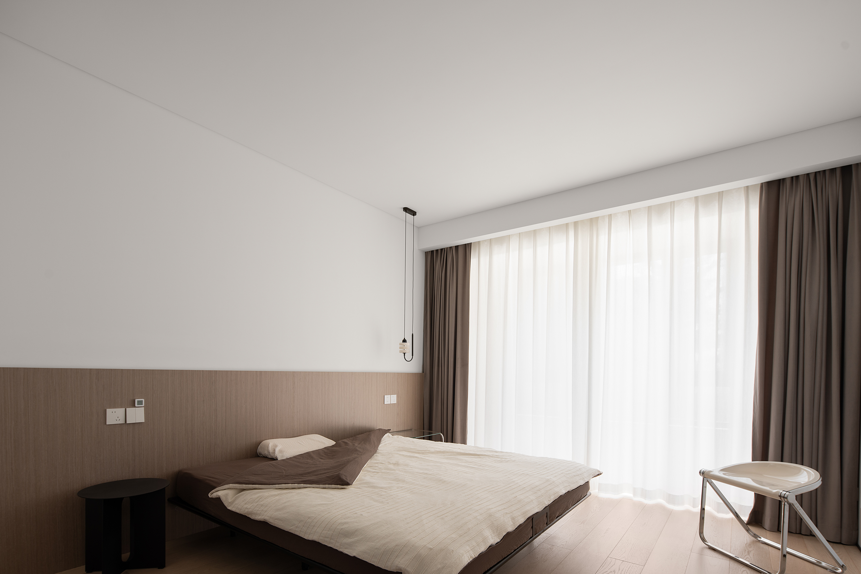主卧舒适简约,原木的护墙板与木地板相互呼应。搭配同色系的软装,整个空间给人的感受是非常治愈的。