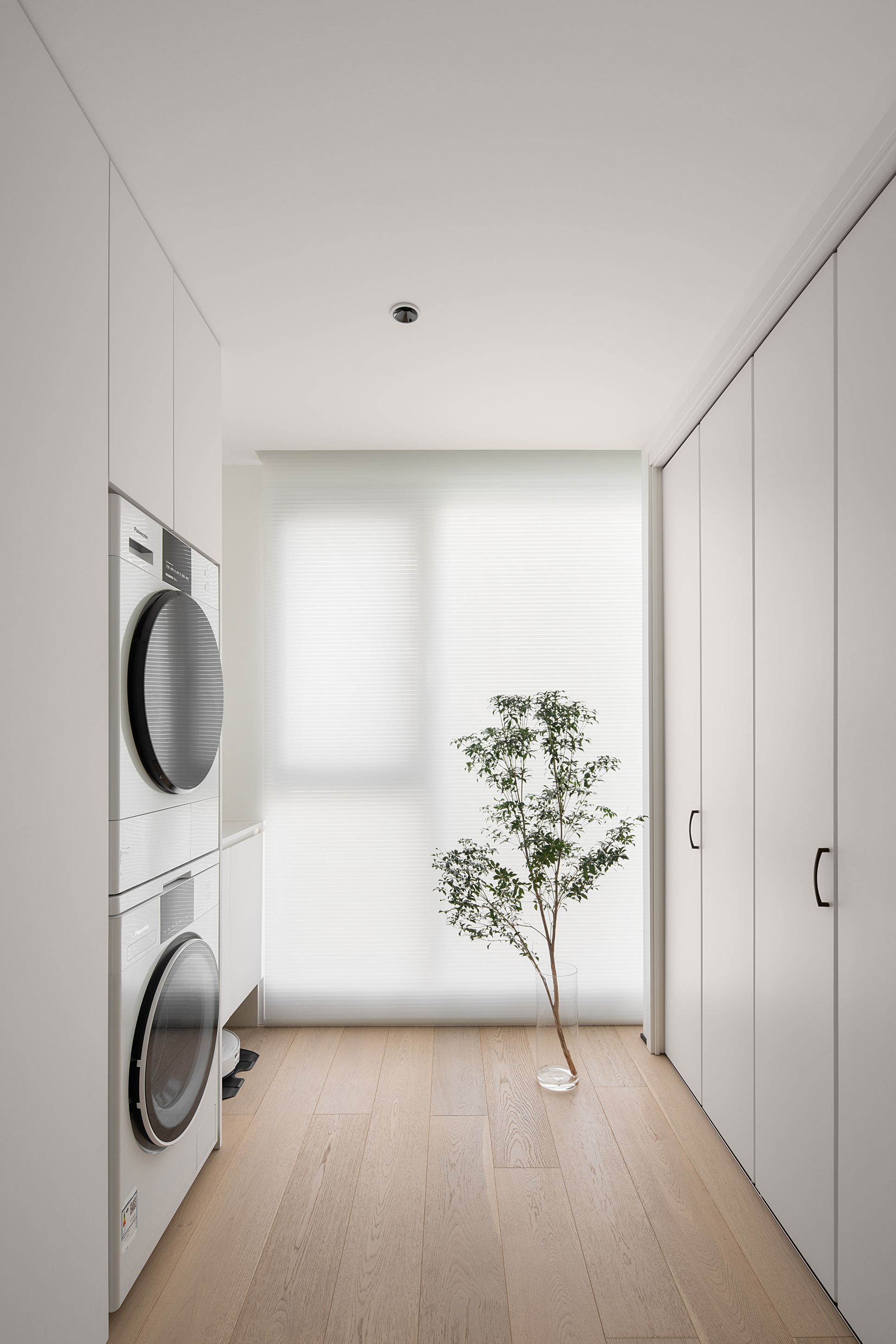 主人在洗衣清洁的家政环节可以在衣帽间一步到位。一门通顶的折叠柜门设计,让空间显得更加高挑。合理的收纳是保持空间视觉感受非常重要的一点。