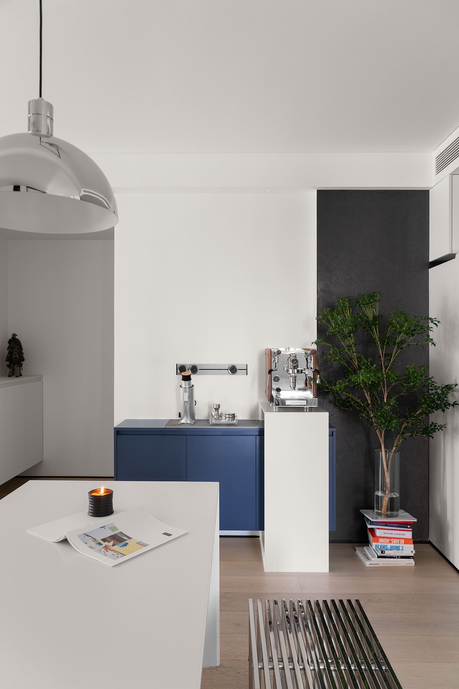 蓝色的餐边柜成为餐厅的点睛之笔,精致小巧的柜子,可以满足咖啡区的功能。闲暇之余,享受休闲时光。绿植和杂志书籍,为空间带来文艺气息和自然之感,于空间中保留一丝生机。