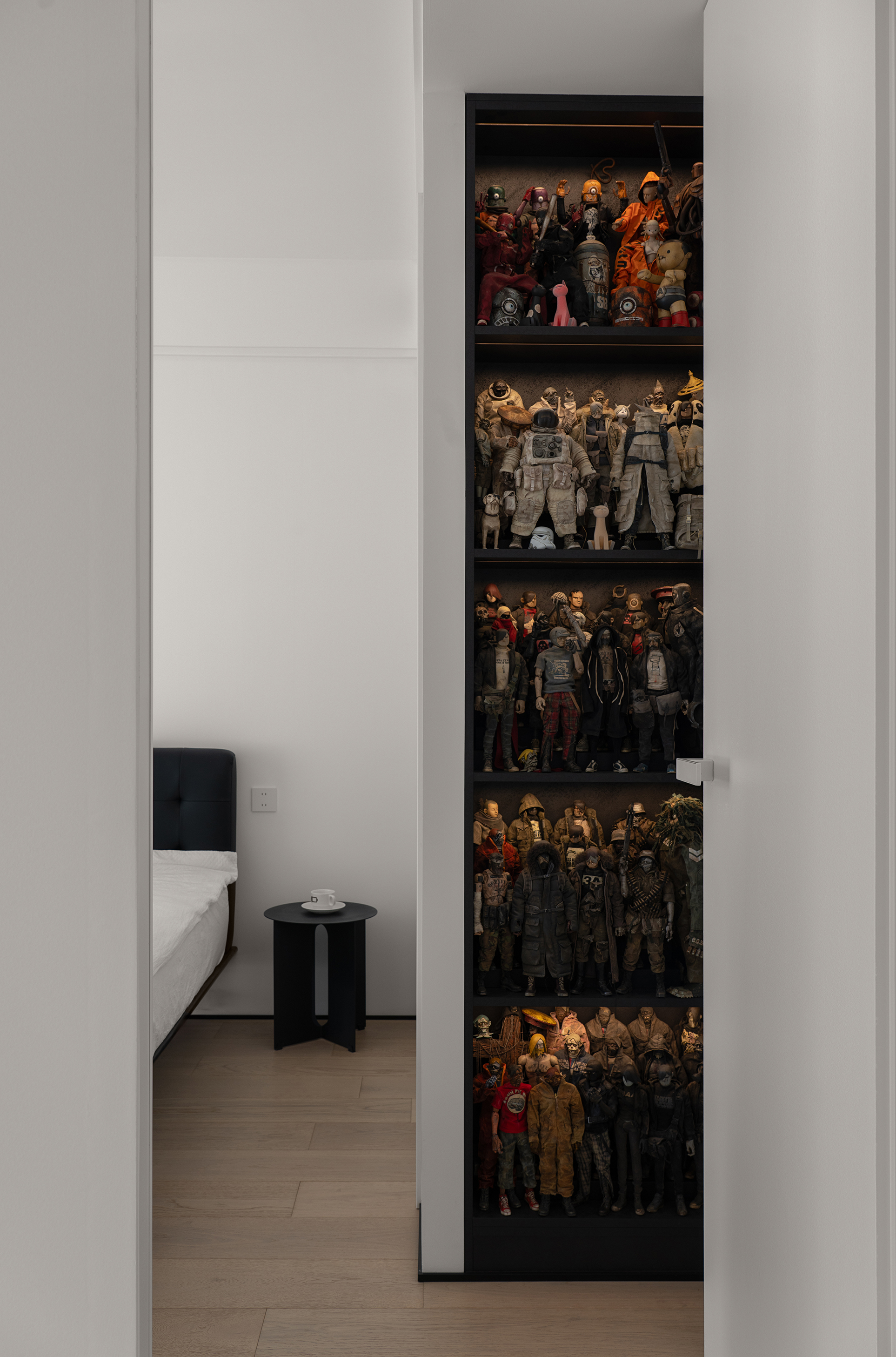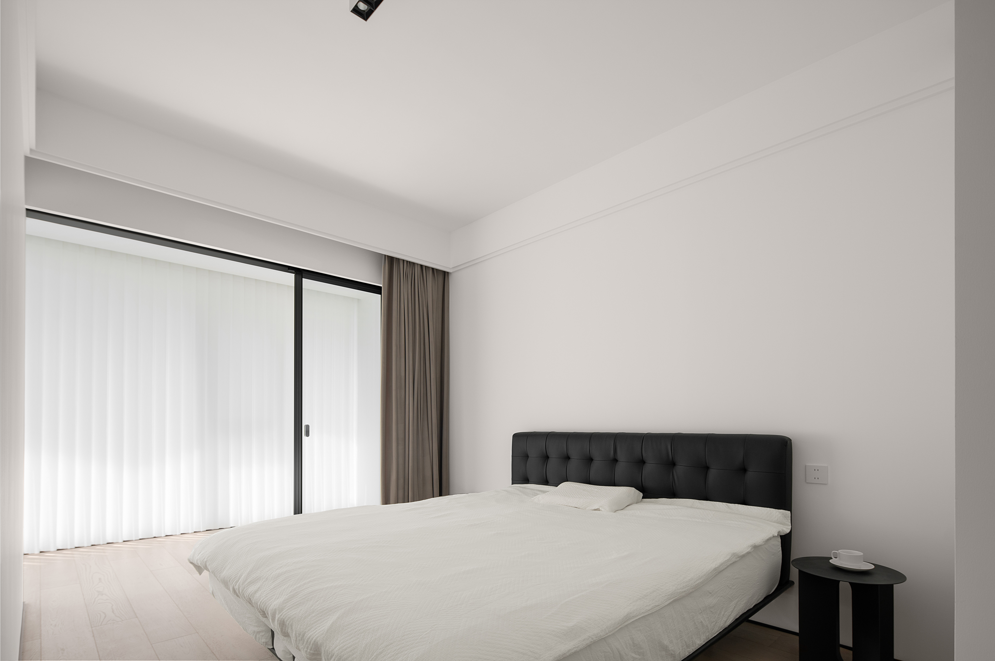 次卧同样没有过多的装饰,我们的业主主打一个极简到底,软装依然是悬浮床,大面积的白让空间明亮通透,一进门的柜体设计增加了手办展示区,充分考虑业主的小爱好也是非常重要的。