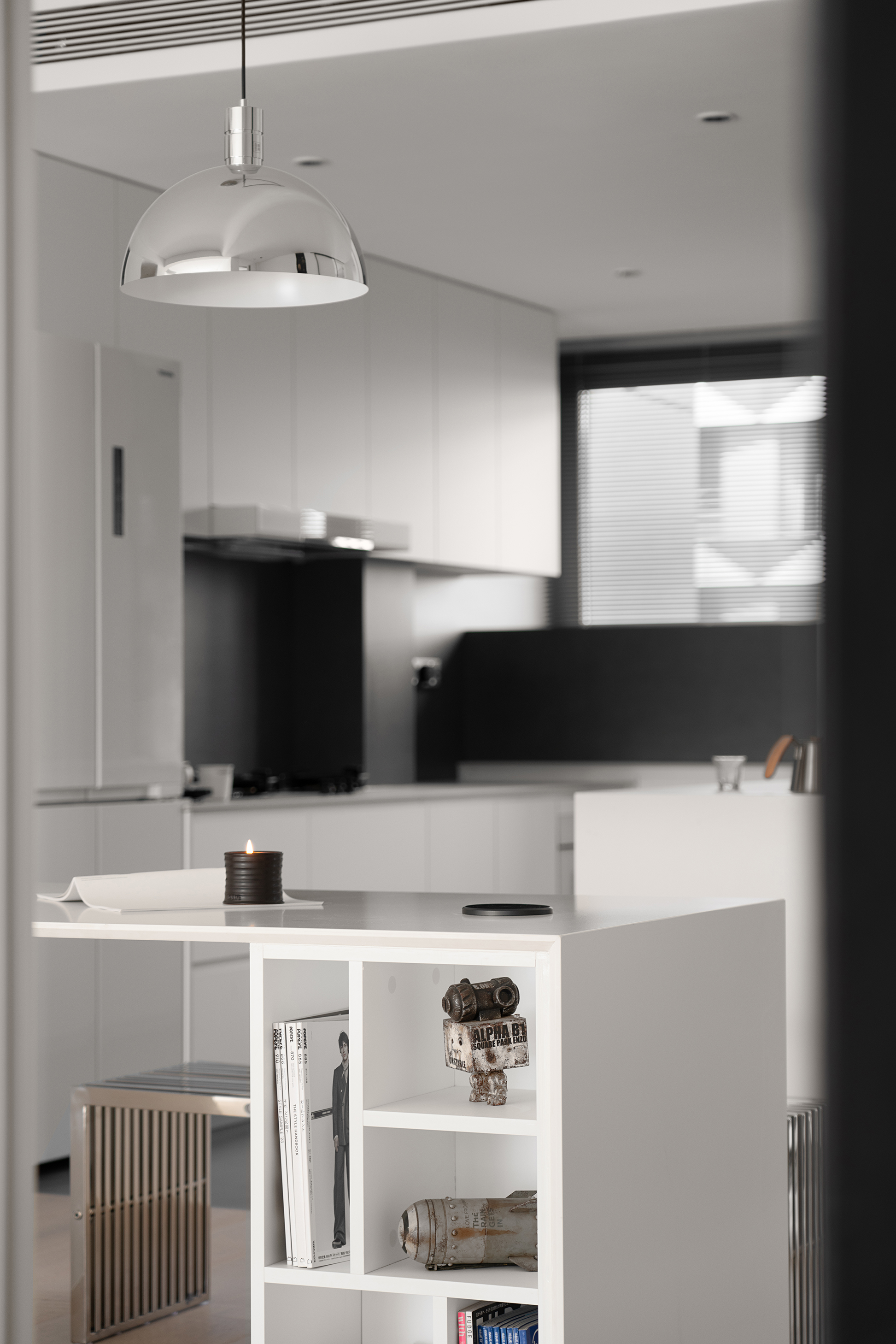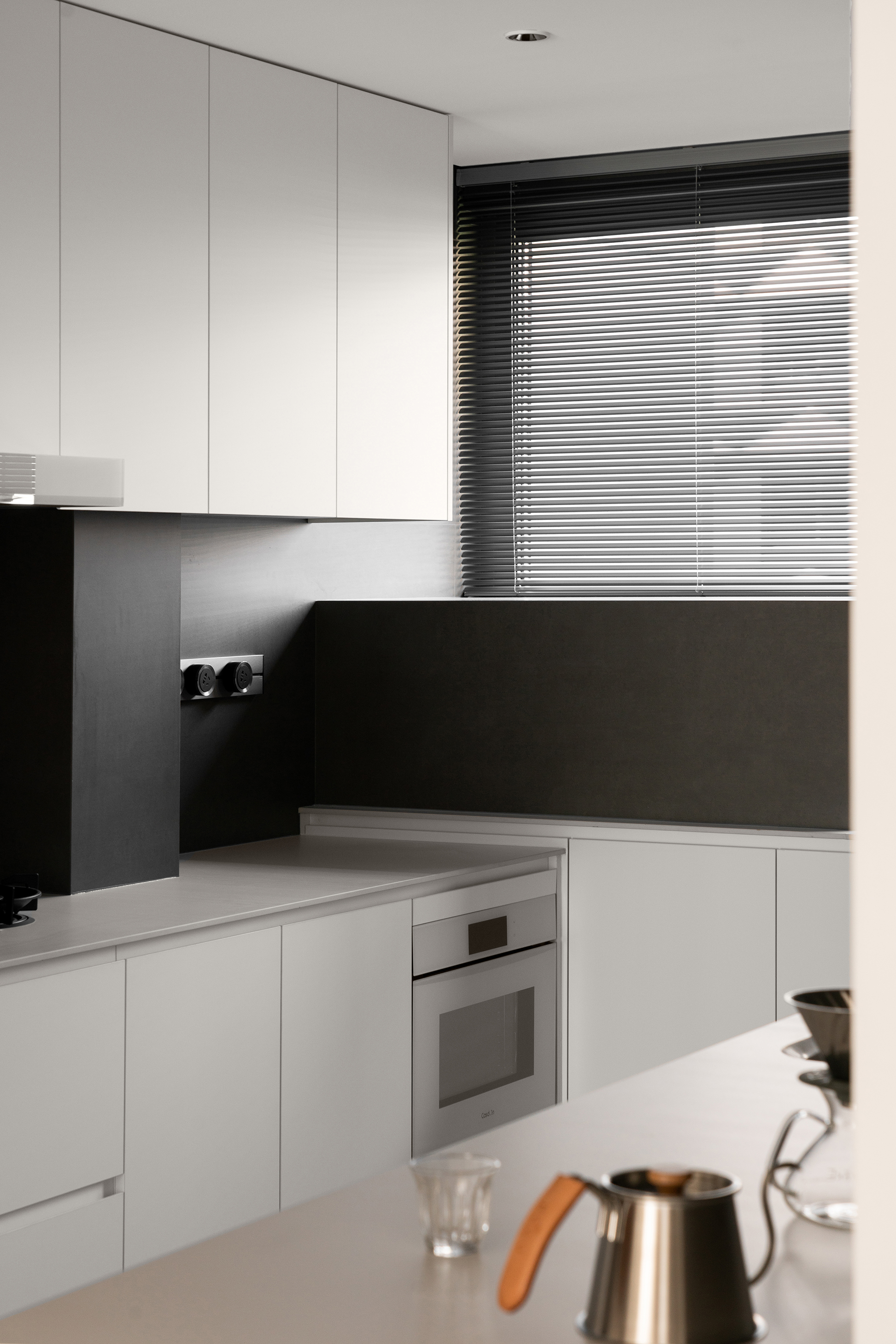 黑白灰极简开放式厨房,打开空间之后洗切炒动线完备,收纳更充足,台面为超薄岩板,整个空间显得干净又明亮。窗帘使用百叶窗帘,光影感十足。