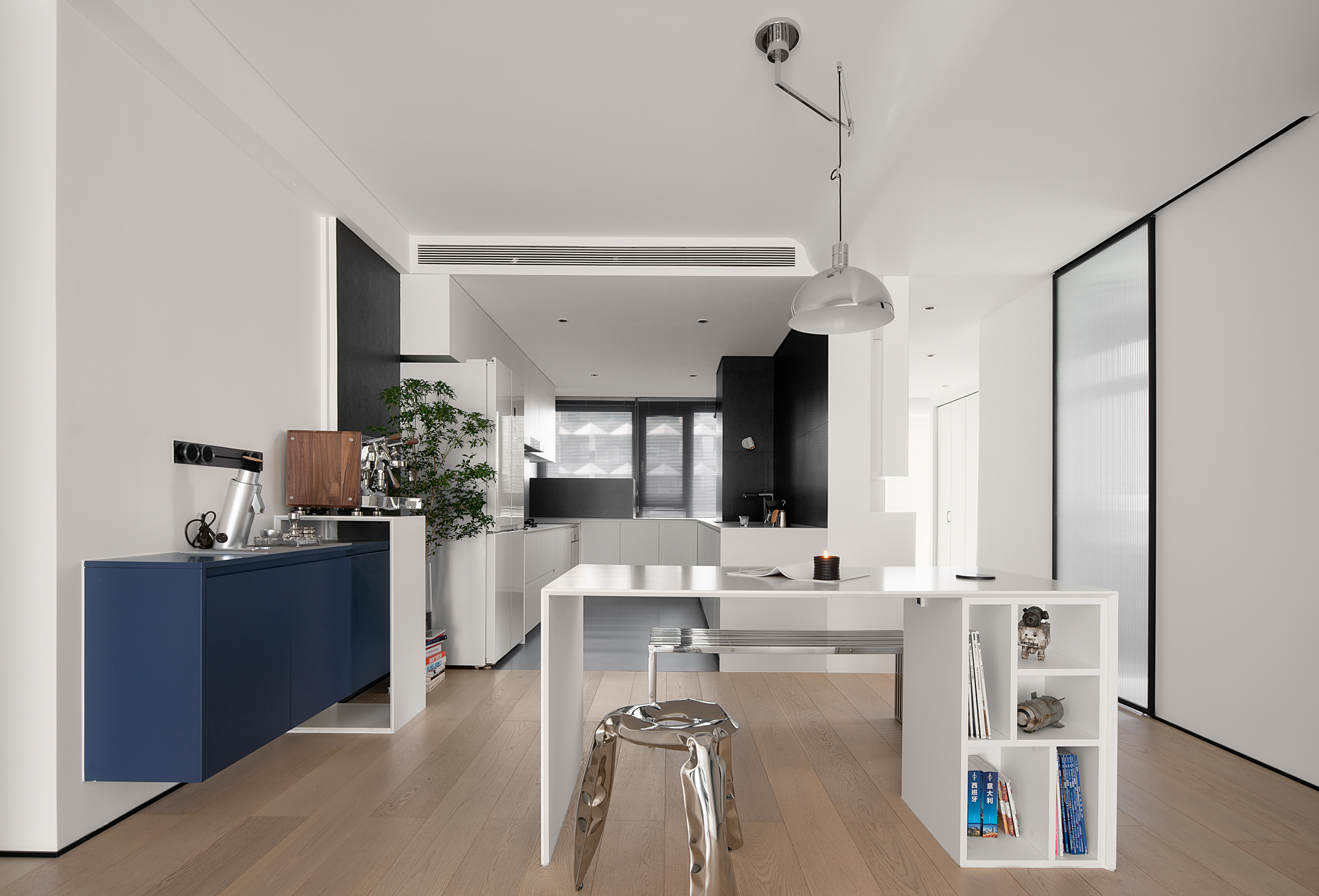 无论是从餐桌望向客厅,还是从餐桌望向厨房,都是非常和谐的空间感受,在这里用餐、喝咖啡、聊天互动都成为一种享受和幸福。