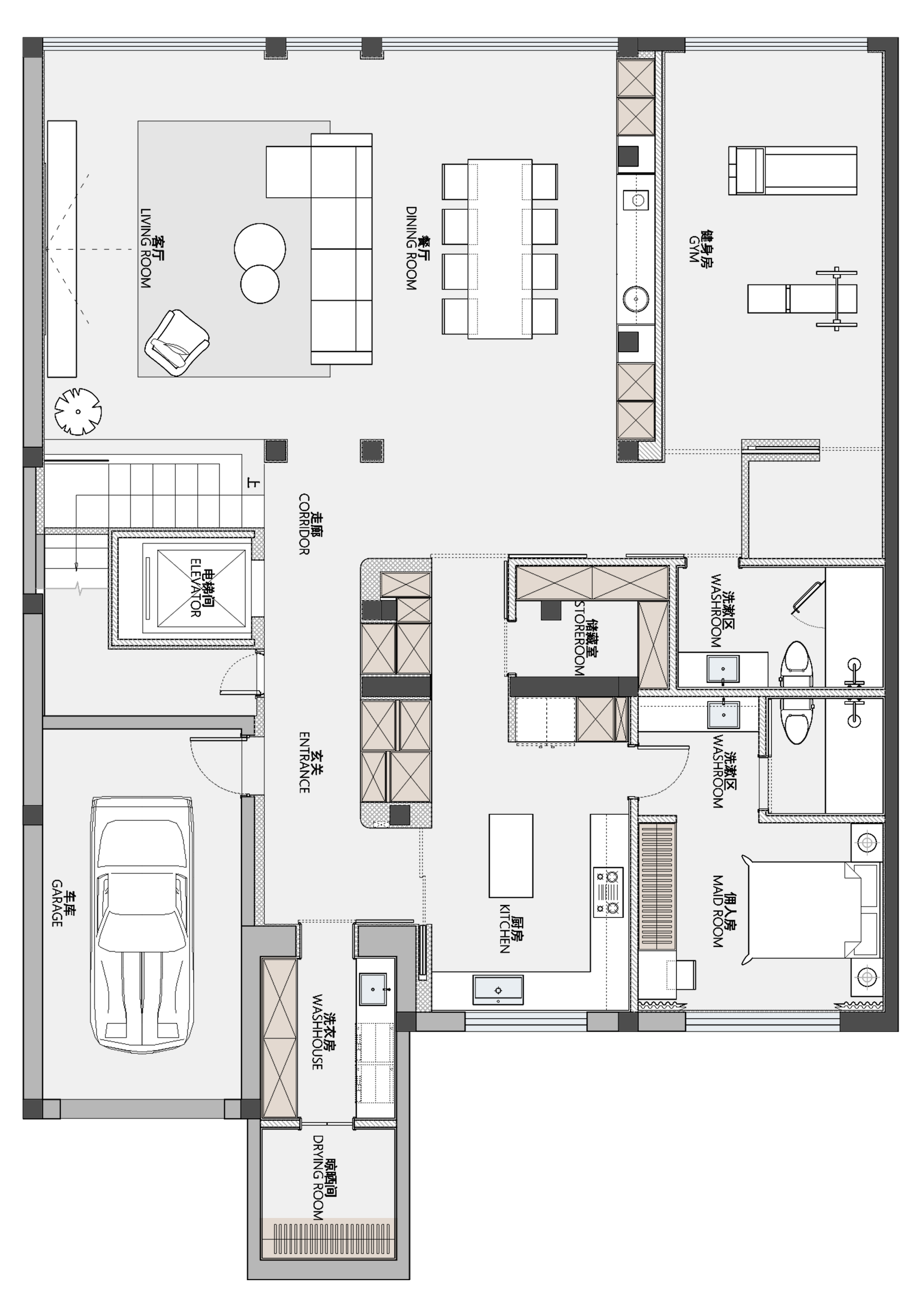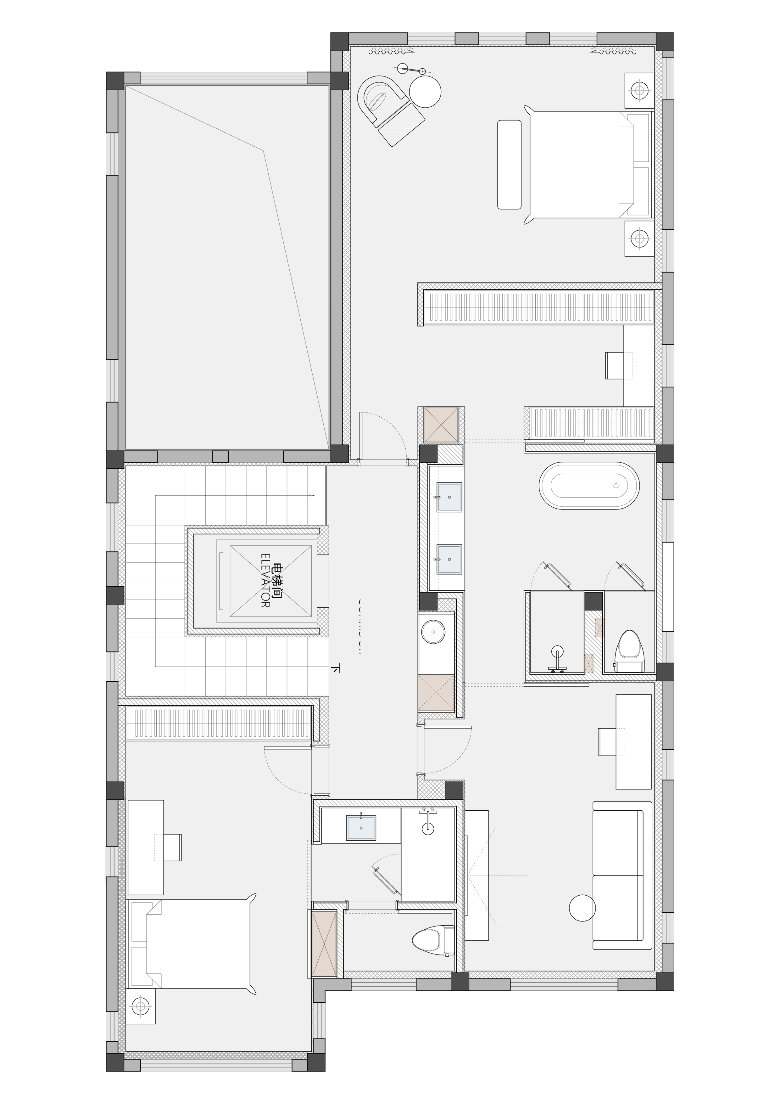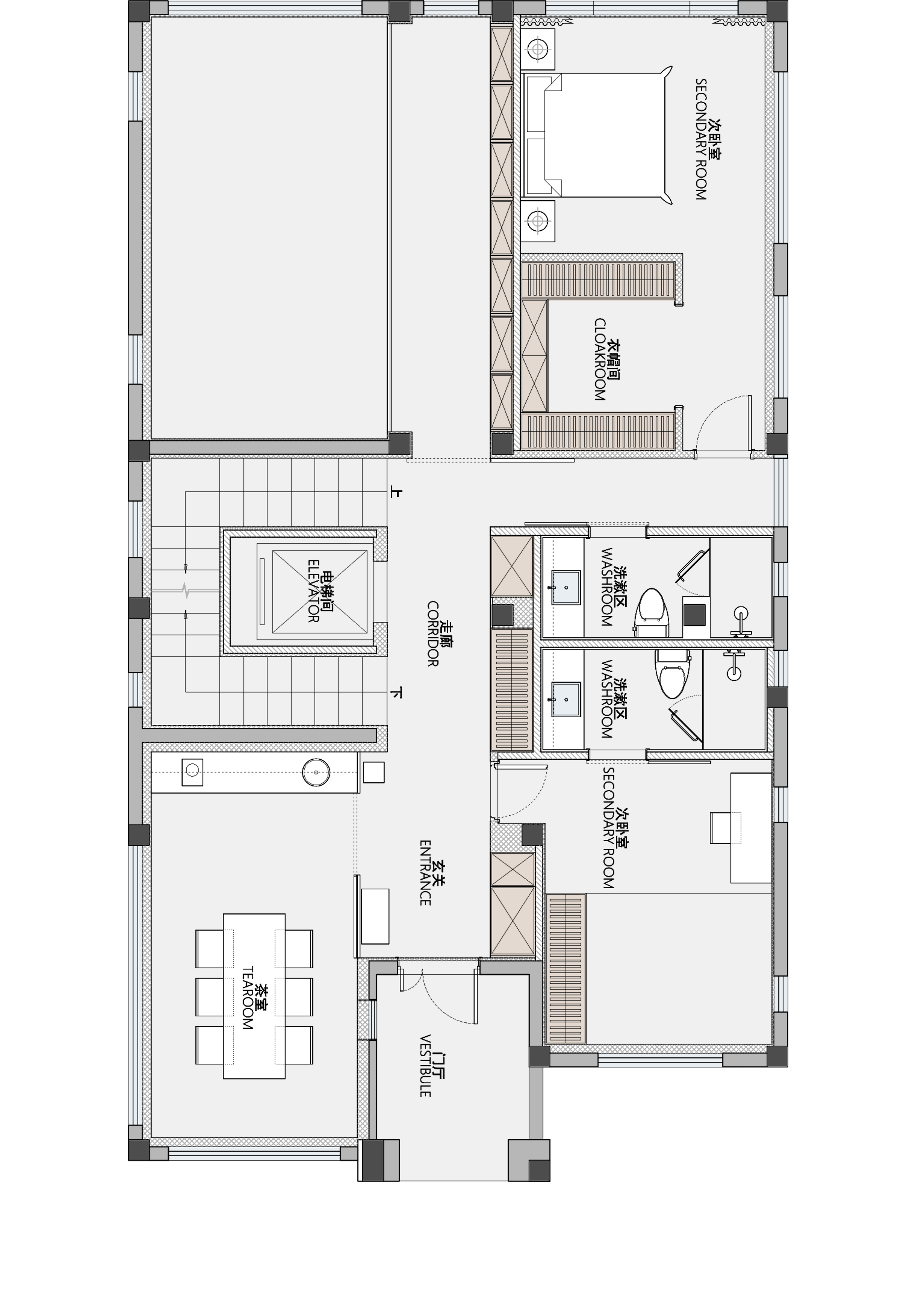 空间布局:随着空间的“解放”,客餐区的高挑空联动了垂直空间,抬眼即是二层的7米书架墙,自然氛围中充斥着书香润泽,身体在休息,精神却可以在路上,感官方可沉浸其中,感受环境对情绪的牵引。在房子侧面设置了层级阶梯,阶梯联通至阳台,由此巧妙的在二楼外增添了茶室露台,采光更好,功能性也更丰富,让房子把空间还给空间,让光和风都有自由穿行的路径。设计希望赋予这个空间耐人寻味的细节以及丰盈的质感。
