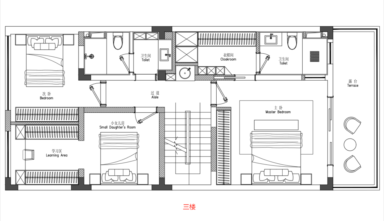 三楼主卧室和最小的女儿房在上面方便照顾小朋友也做了起居室这样方便夫妻和小朋友的接待