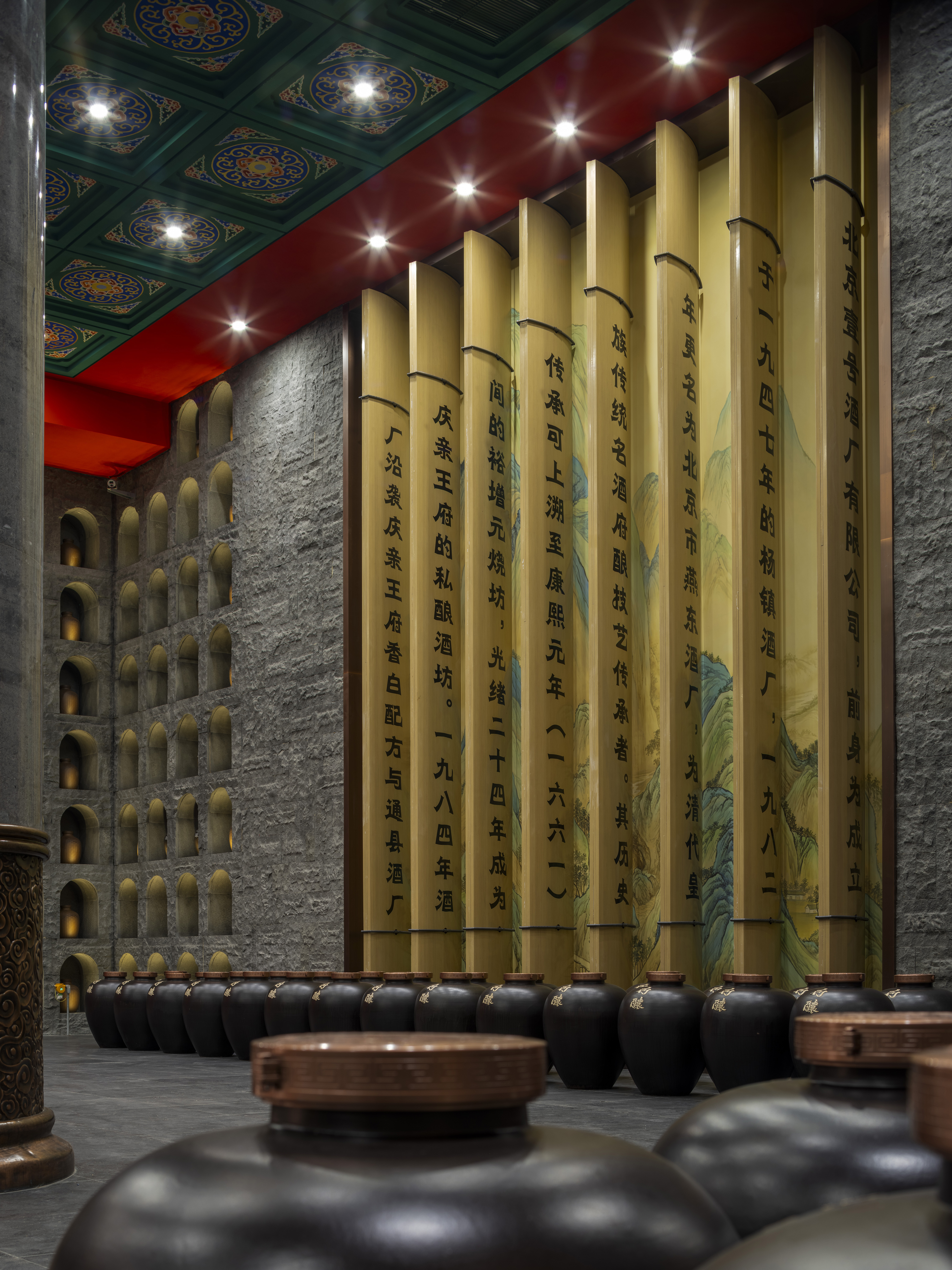 空间布局:科技与传统的完美融合:在尊重自然的基础上,将室内与室外空间进行一体化设计,京作壹号酒窖引入了先进的温湿度控制系统与智能管理系统,确保每一坛白酒都能在最适宜的环境中缓慢成熟,锁住最佳口感。通过精心设计的照明与通风系统,营造出既符合现代审美又不失古典韵味的空间氛围。在这里,科技与传统不再是矛盾体,而是相互成就,共同守护着这份珍贵的液体遗产。