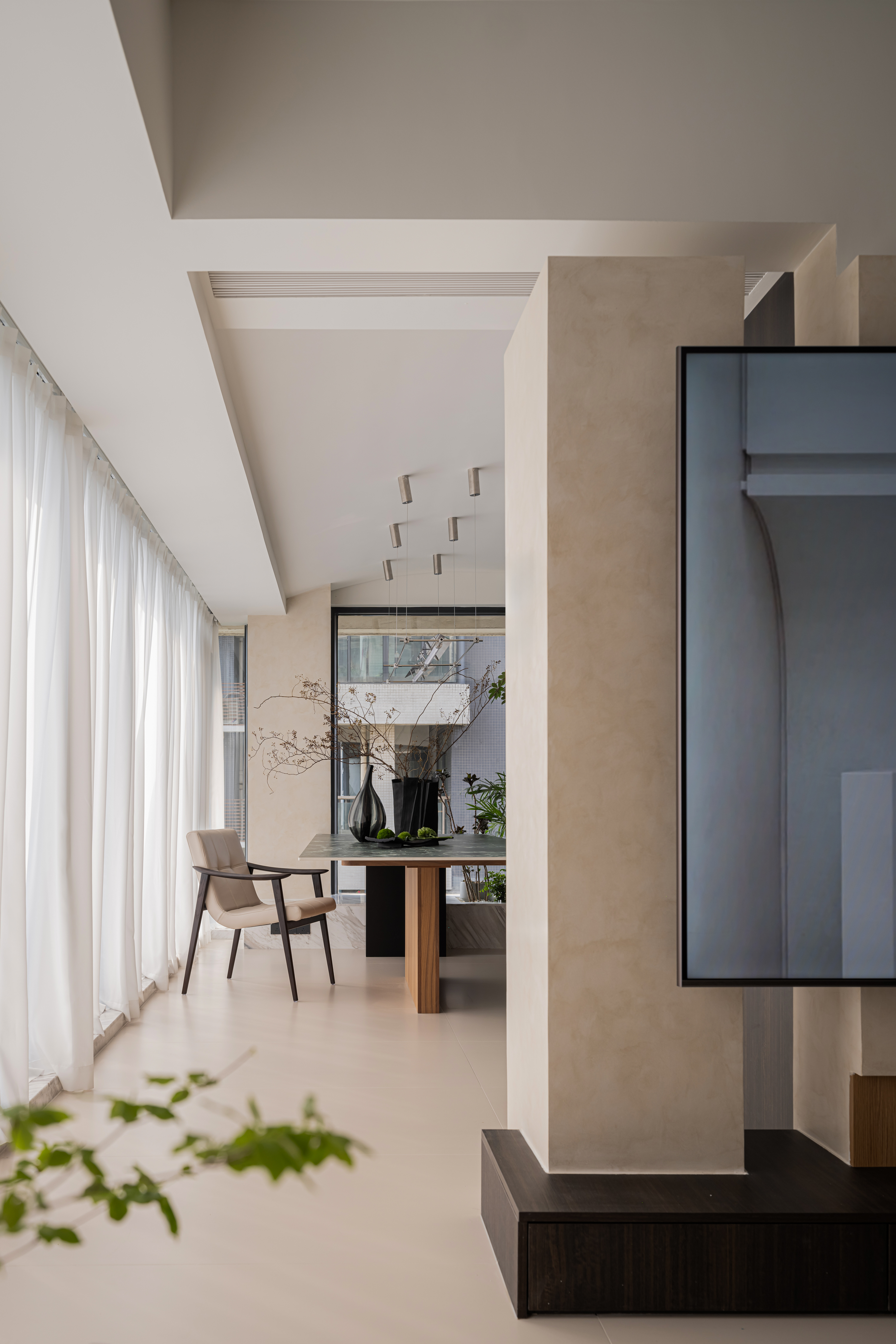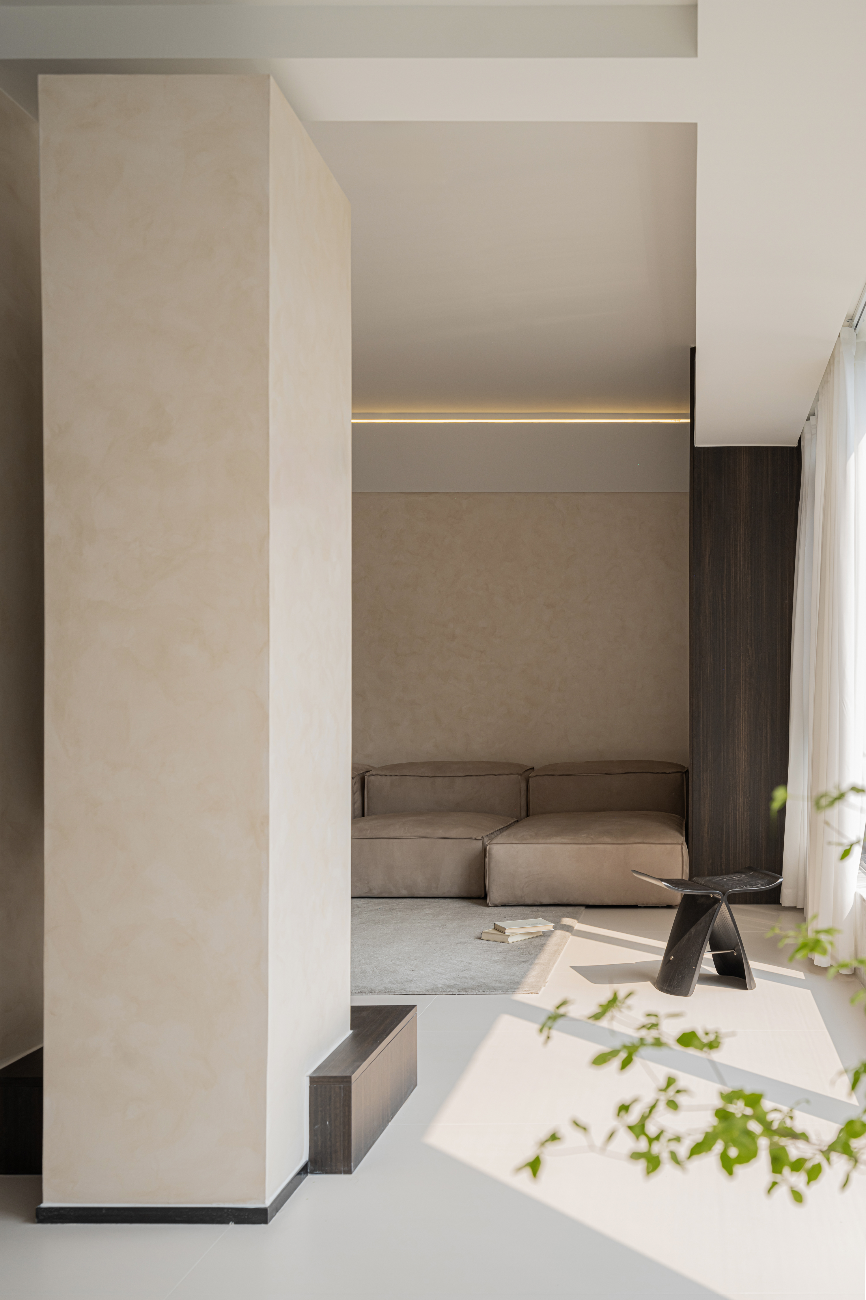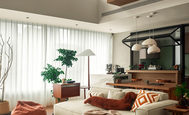 客厅天花板的横梁设计成斜面,在空间上划分了客厅与餐厅的空间,同时内嵌了灯带,为整个空间增添了氛围感。