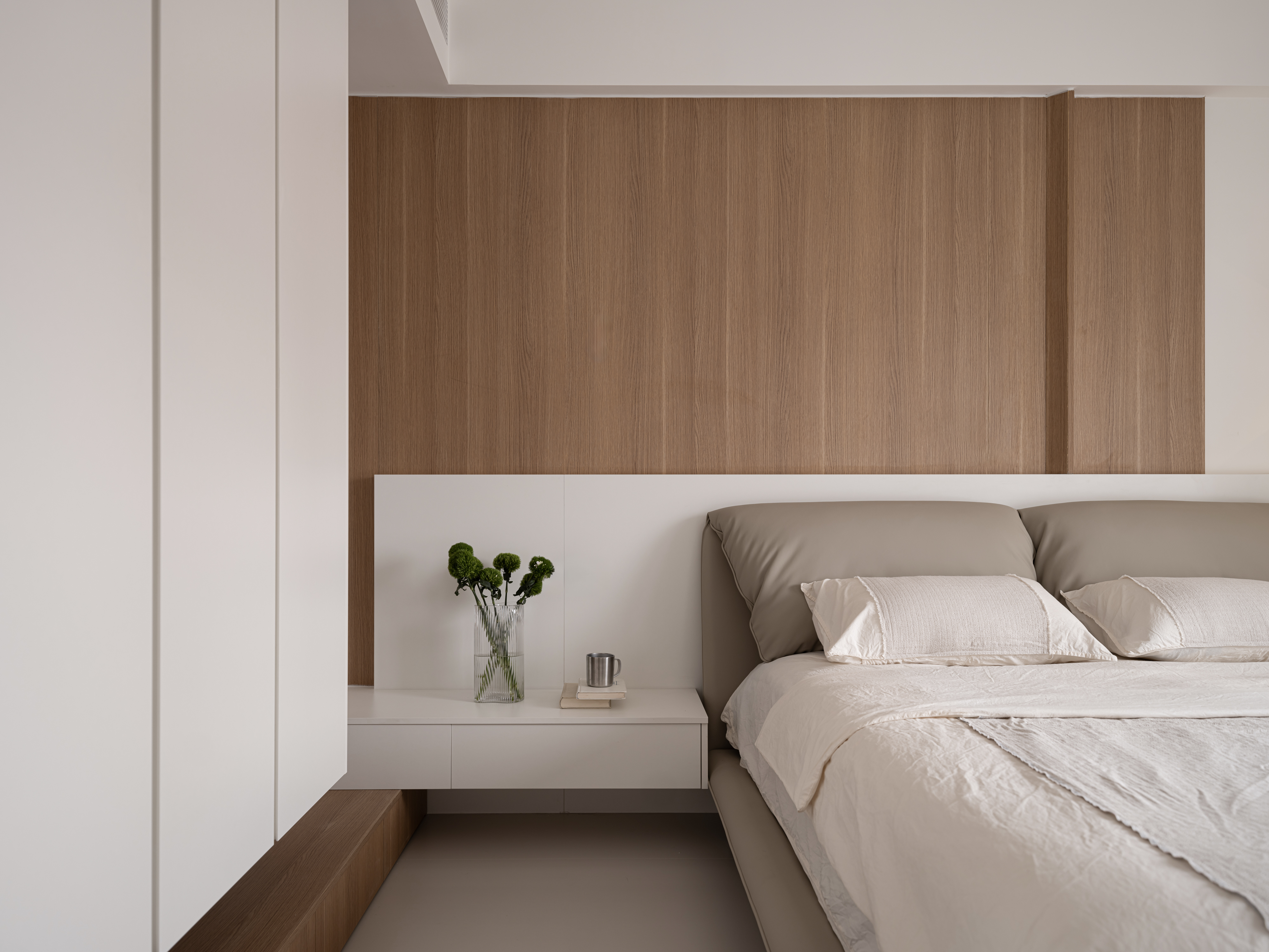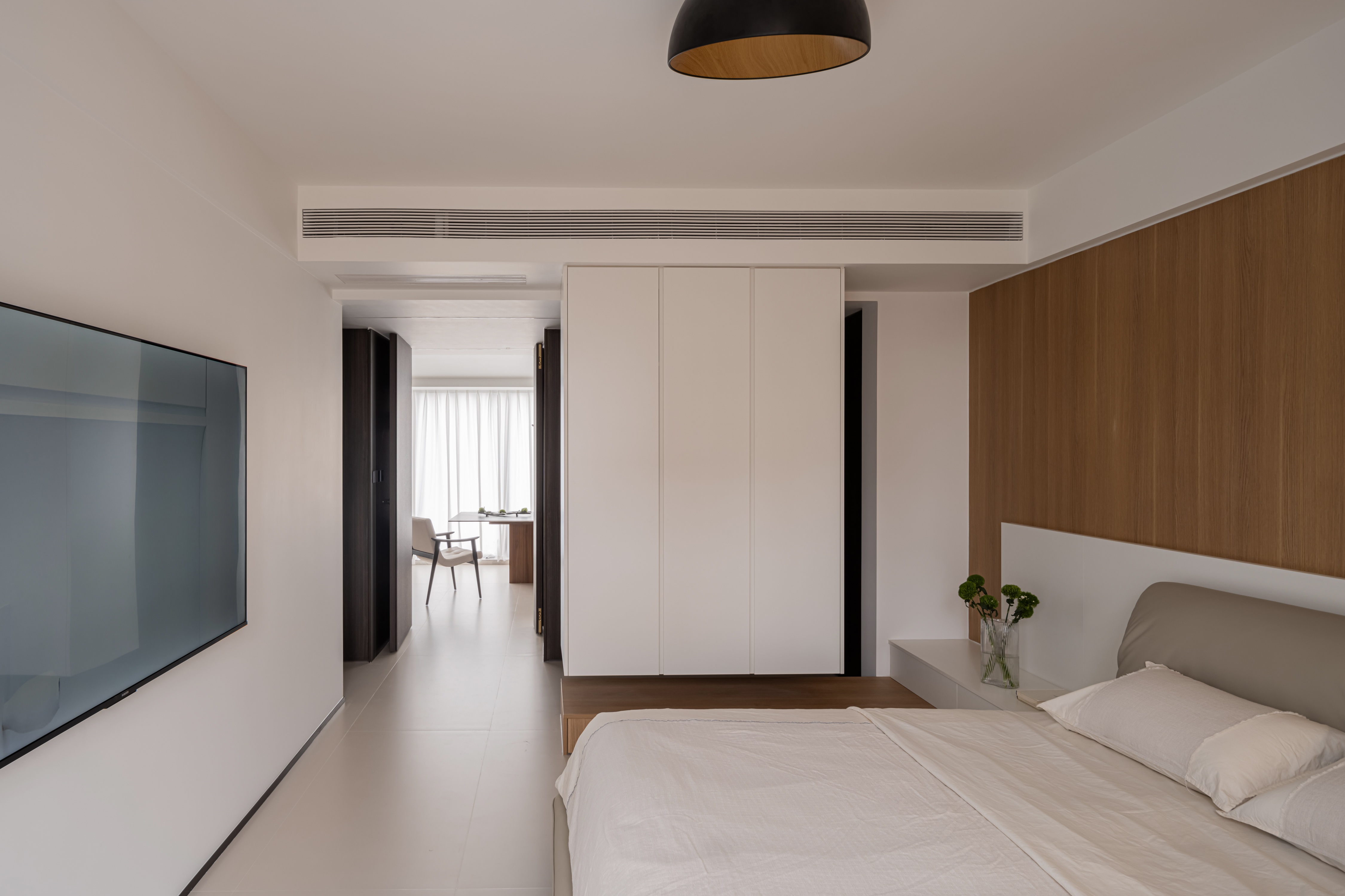 主卧借用衣帽间的面积,增大了卧室“睡眠区”的使用面积,让屋主有宽敞舒适的居住体验。